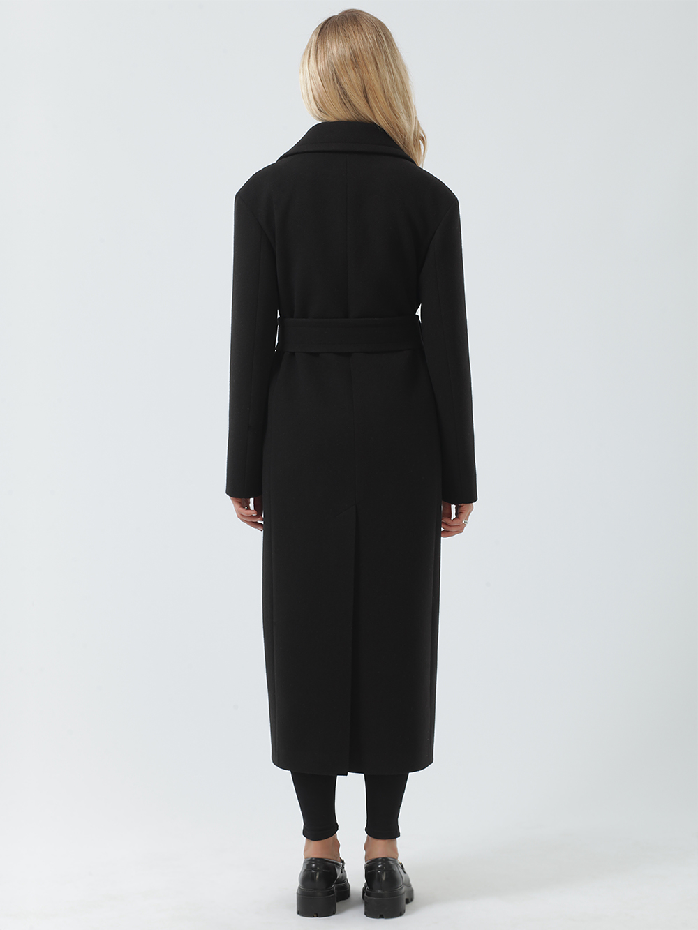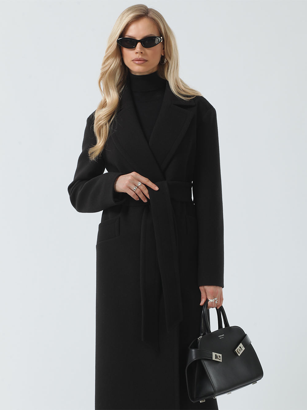Модное длинное пальто из плотной мягкой ткани. Прямой силуэт, спокойный крой. Немного заниженная линия проймы. Втачные кокетки имитируют погоны, подчеркивая плавную линию плеч. Английский воротник. Застежка на пришивные кнопки, удобные прорезные карманы с листочками. Шлица в среднем шве спинки. Пояс в комплекте. Пальто декорировано отделочными строчками.