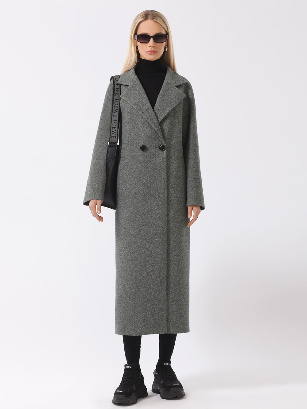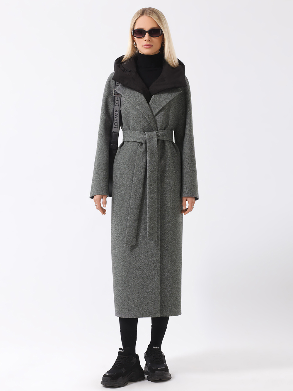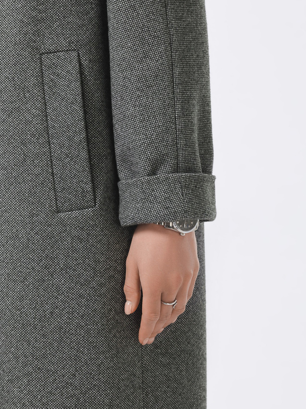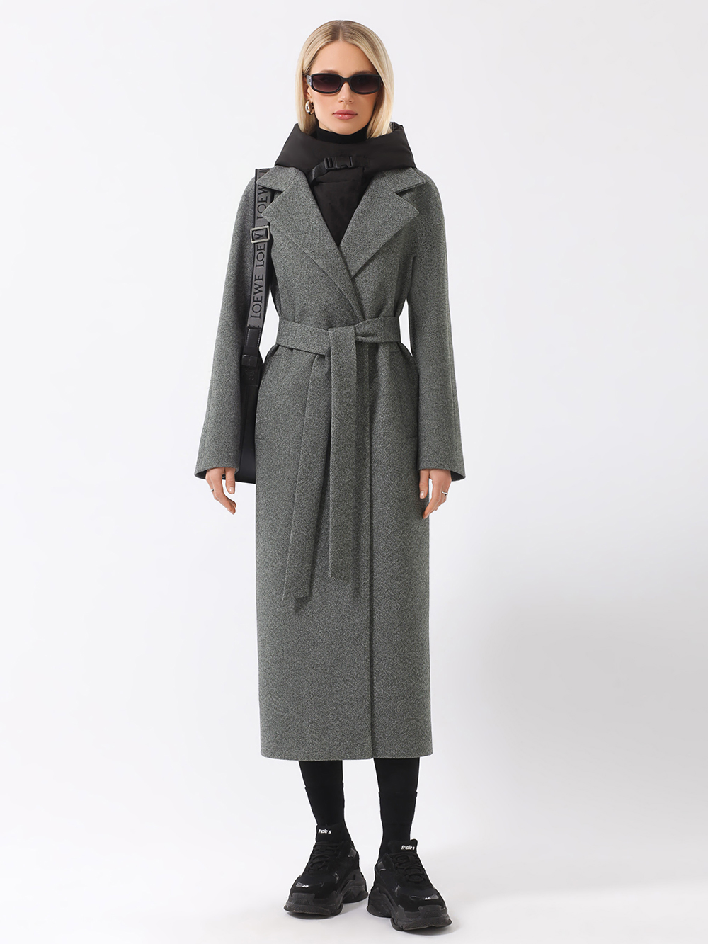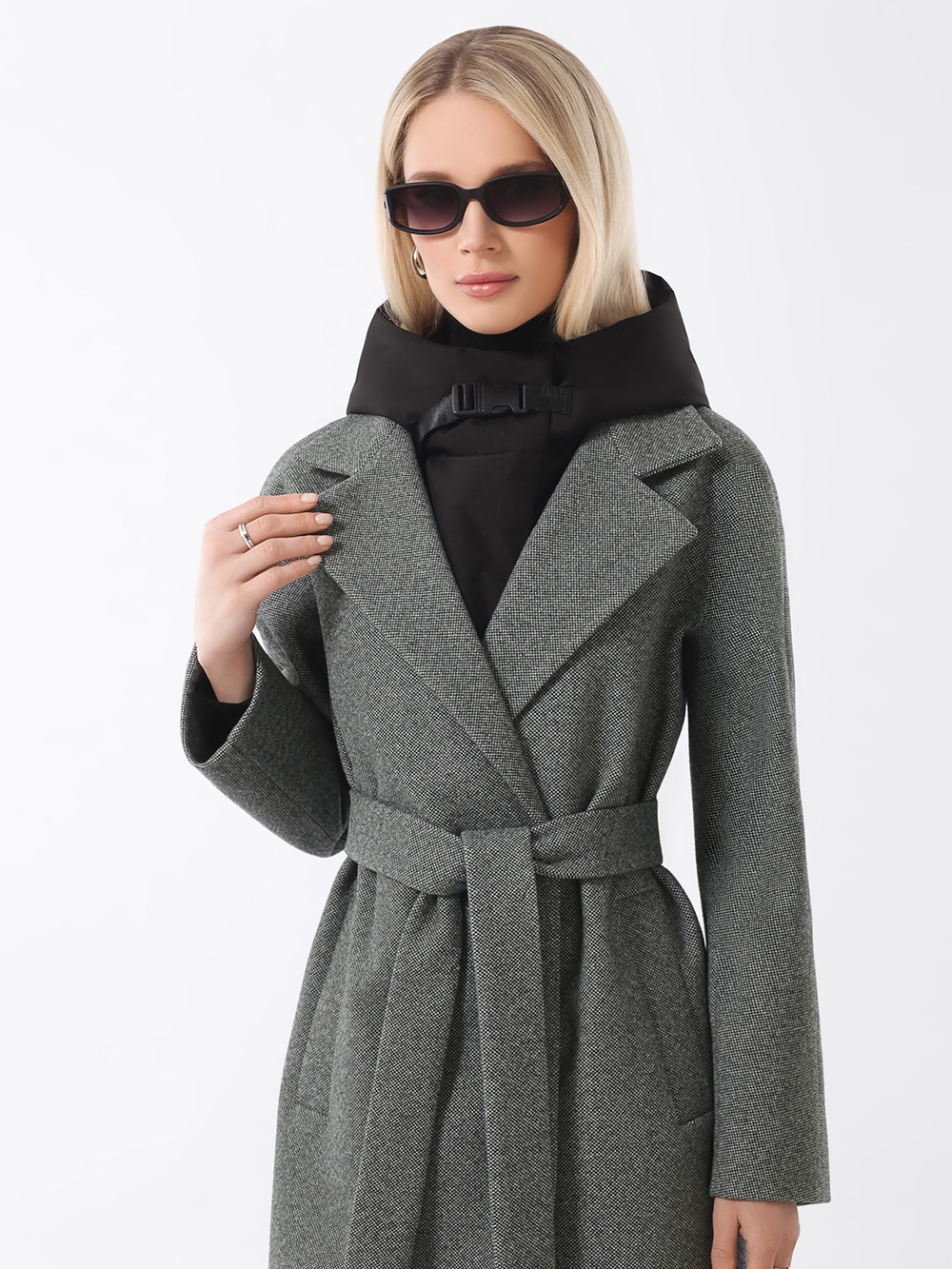 Супермодное пальто в длине макси. Модель свободного силуэта выполнена в классическом твиде. Актуальный лаконичный крой. Плавная линия плеча, комфортные комбинированные рукава с возможностью отворотов. Воротник – невысокая стойка – раскладывается в английский. Съёмная манишка с капюшоном из плотной плащевой ткани на утеплителе. Манишка фиксируется на пуговицы, застёгивается с помощью пряжки – фастекс на тесьме. Удобные карманы - листочки, застежка на фирменные пуговицы. Шлица в среднем шве спинки.