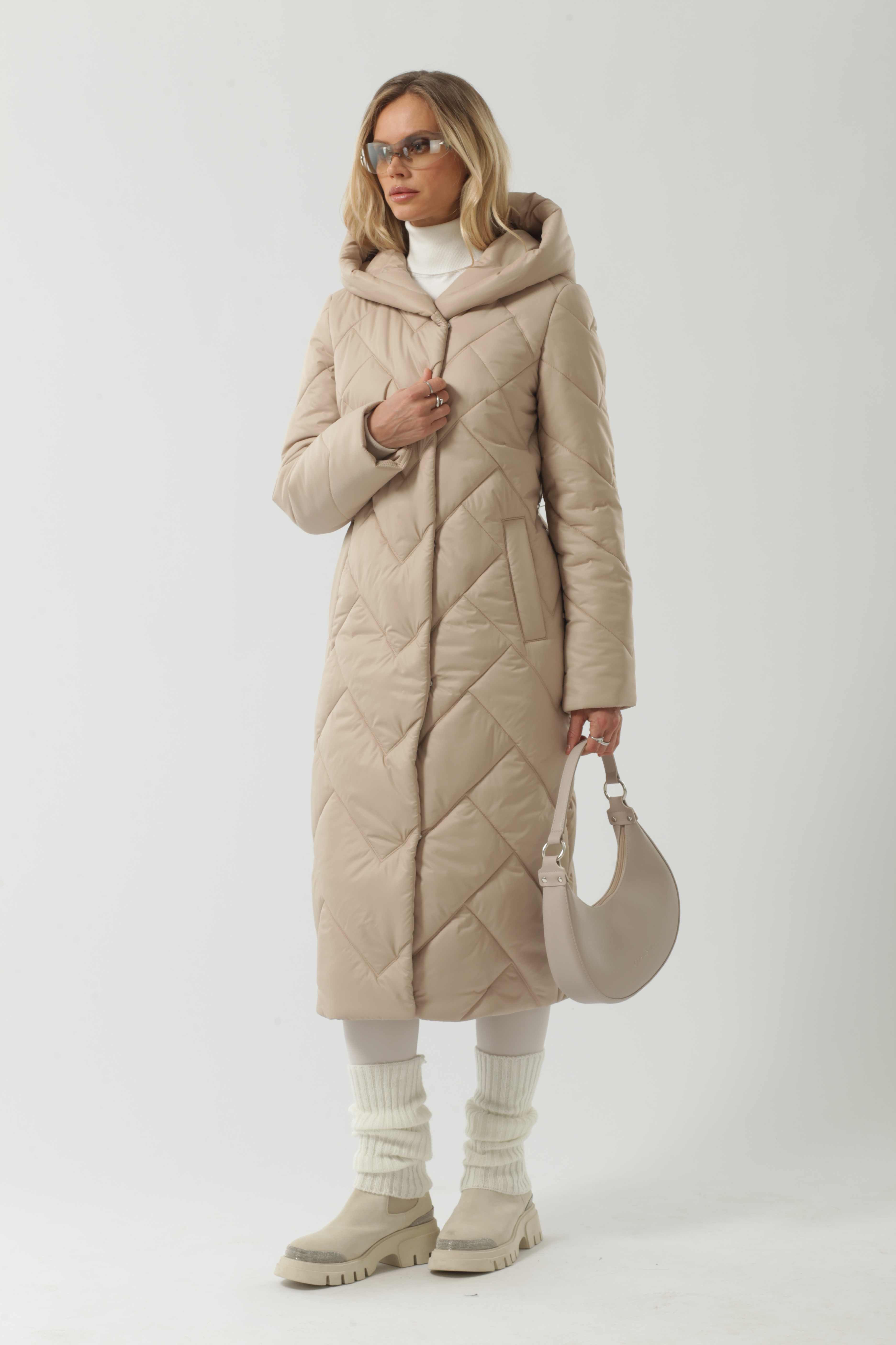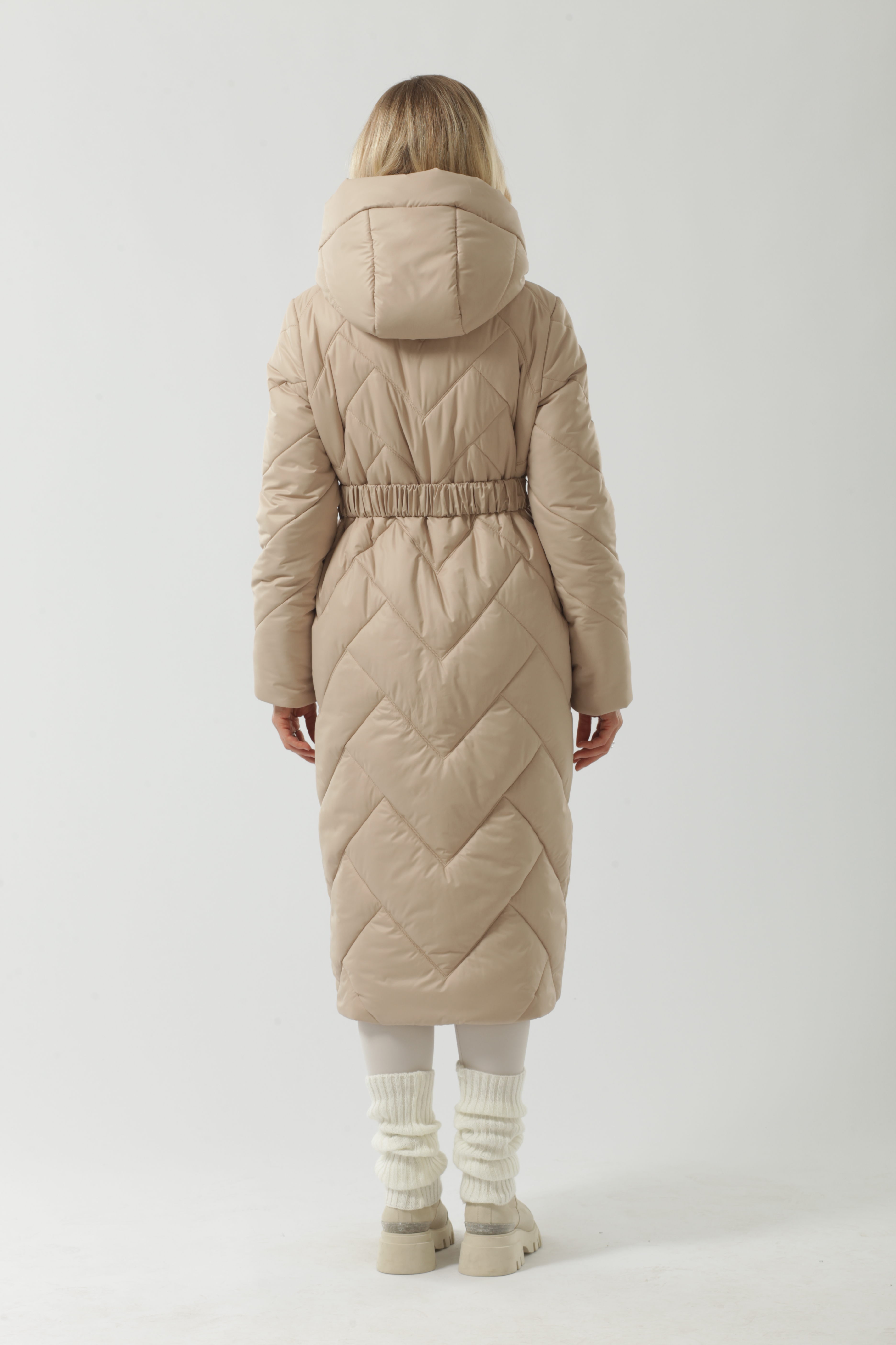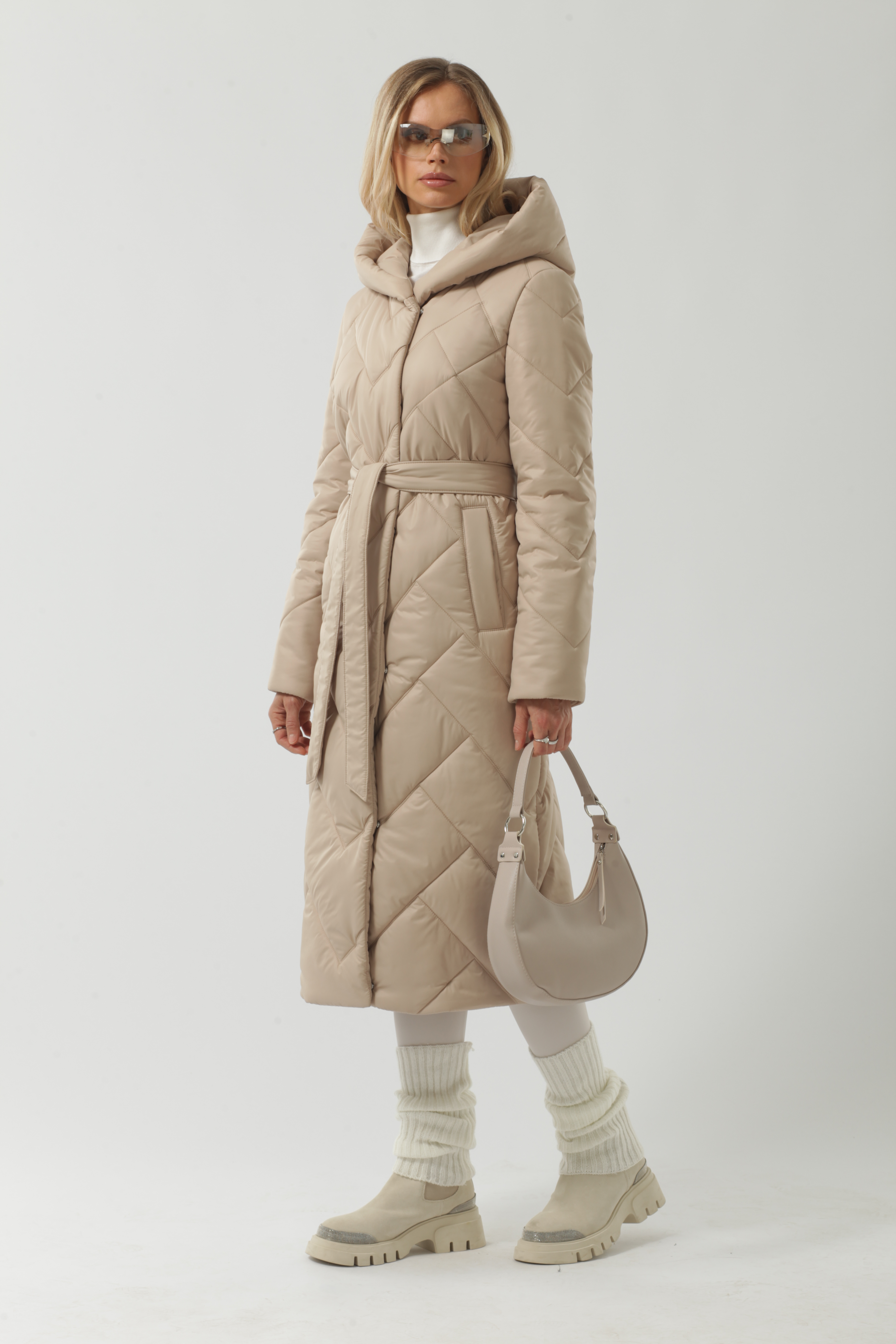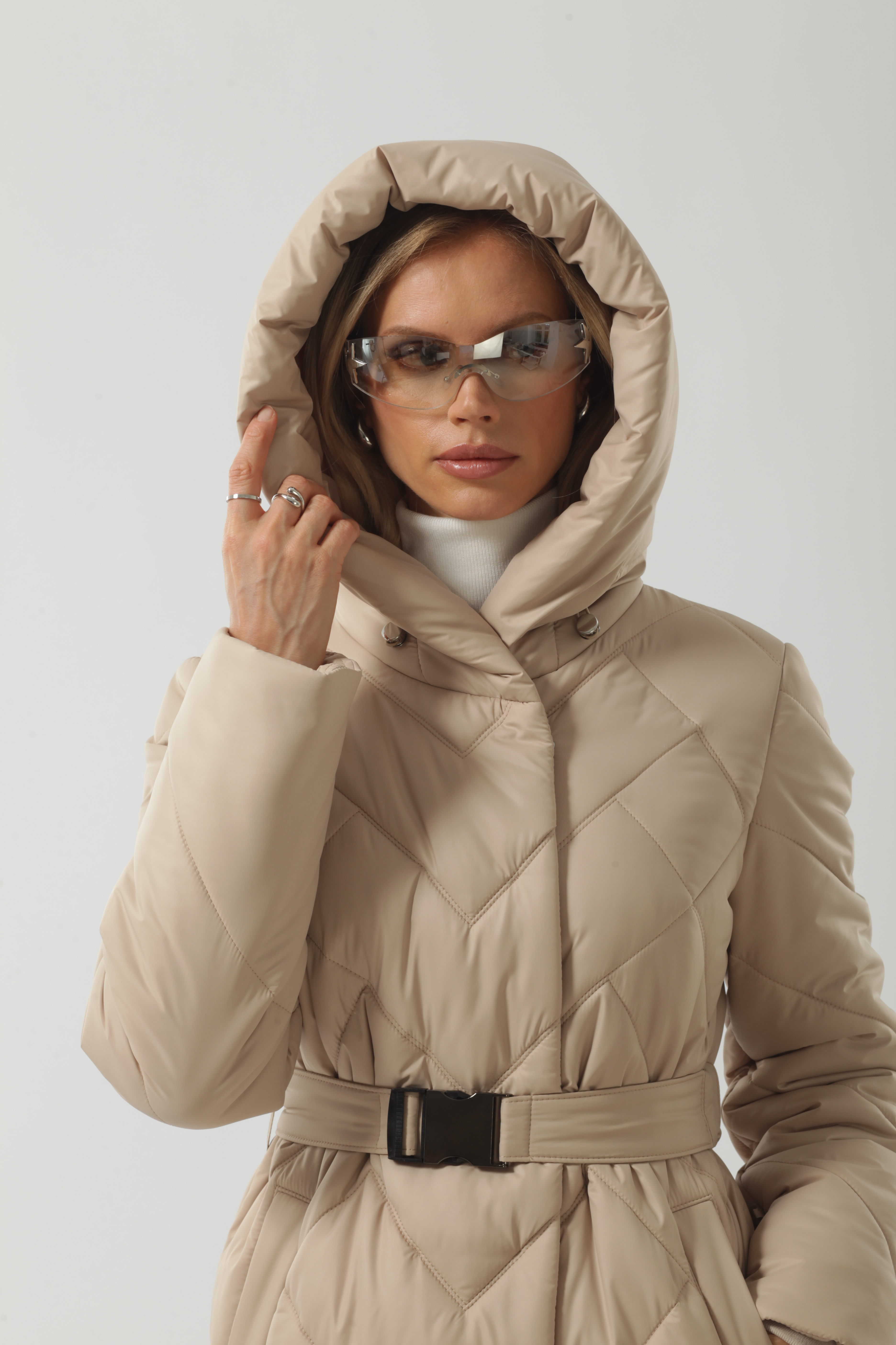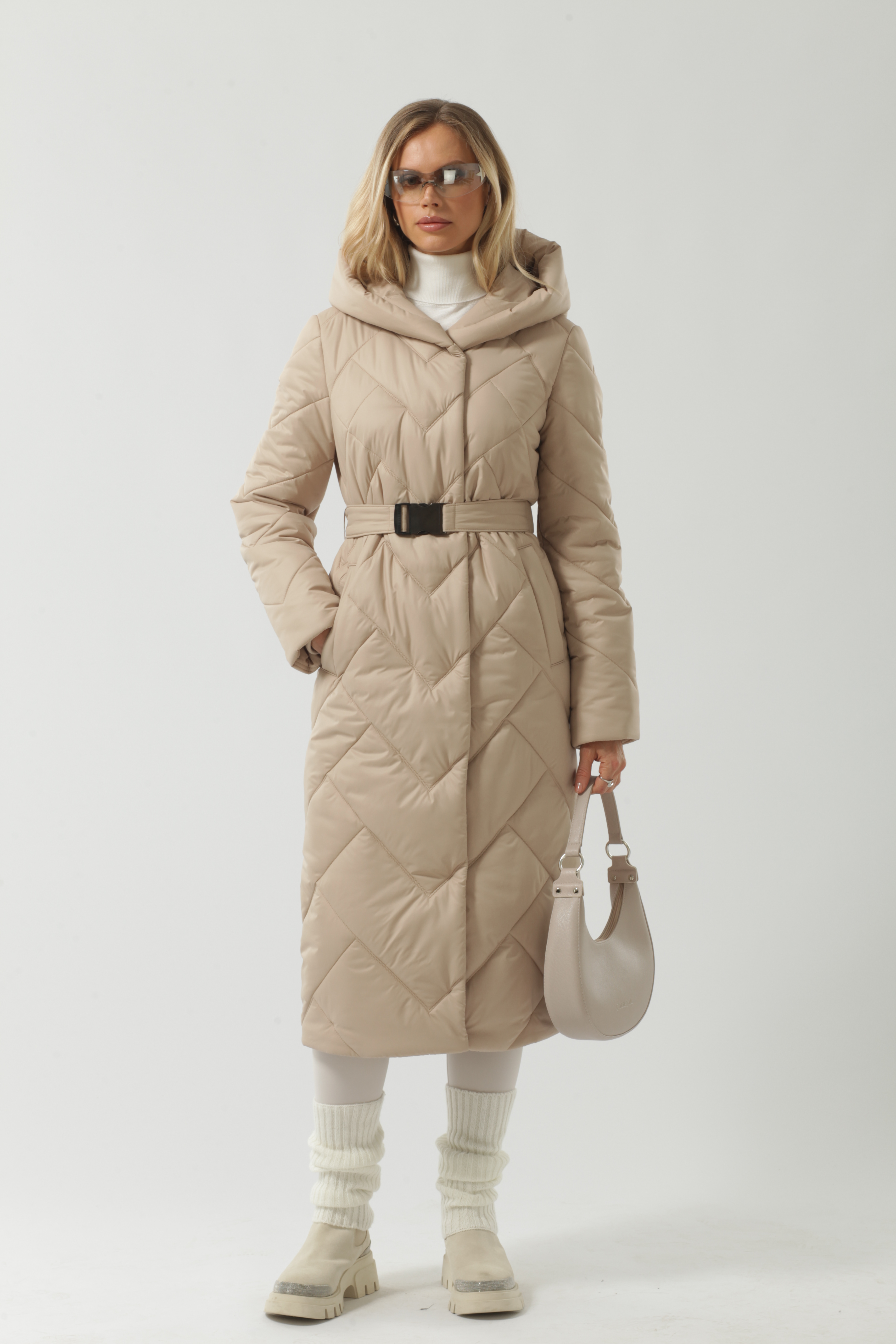 Эффектное теплое стеганое пальто прямого силуэта. Длина изделия 115,0 см. Модель выполнена из плащевой ткани стеганой с мягким теплым утеплителем. Втачной покрой рукава с трикотажными манжетами. Комфортный капюшон с кулиской на фиксаторах. Для плотного прилегания к шее предусмотрен магнит. Удобная застежка на потайные кнопки и молнию. Прорезные карманы с листочками, мешковина карманов выполнена из тонкого теплого эко-меха. В комплекте два пояса – классический из ткани верха, второй - также из ткани верха, но с эффектной пряжкой и сборкой на спинке (для чёткого прилегания на любую талию).