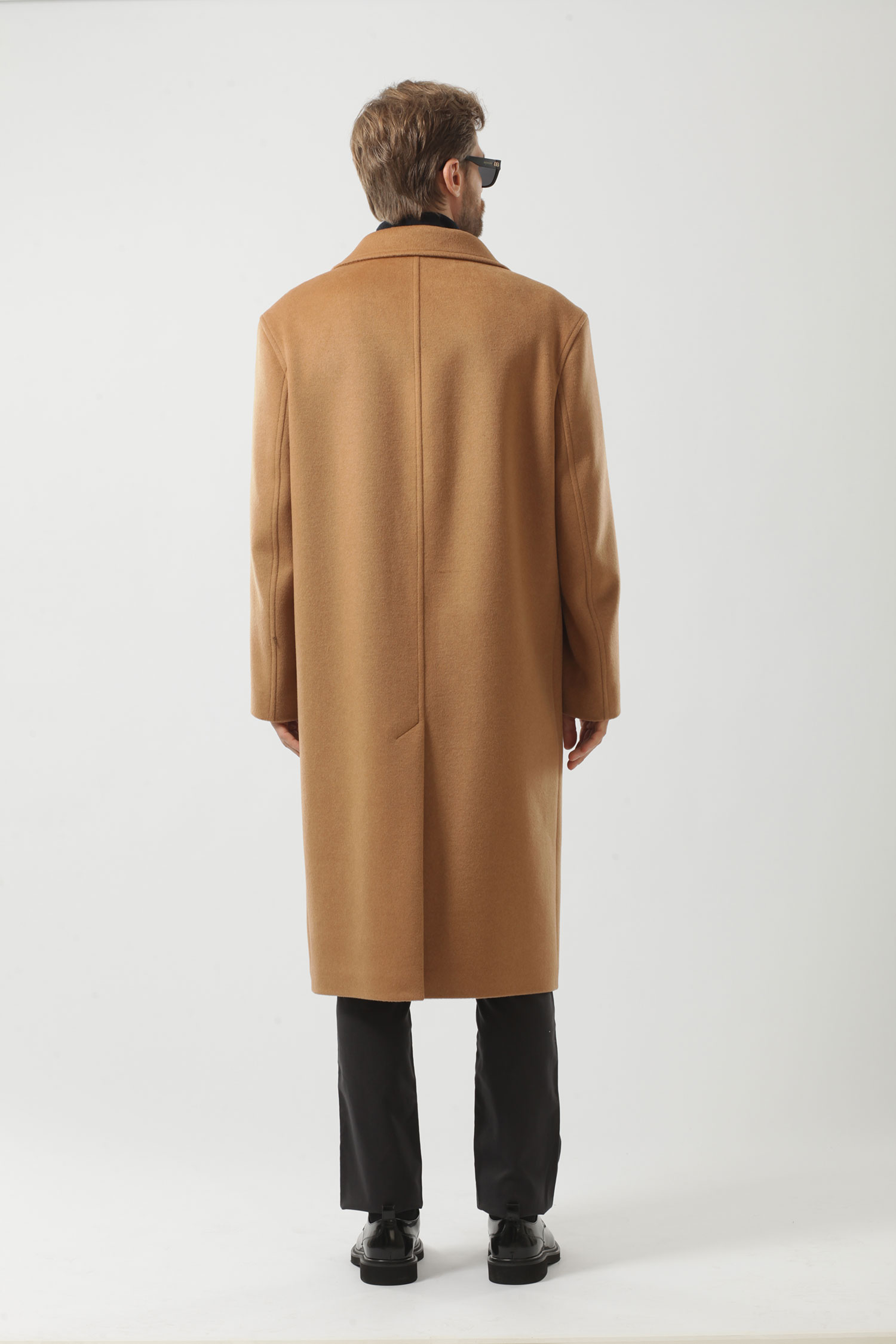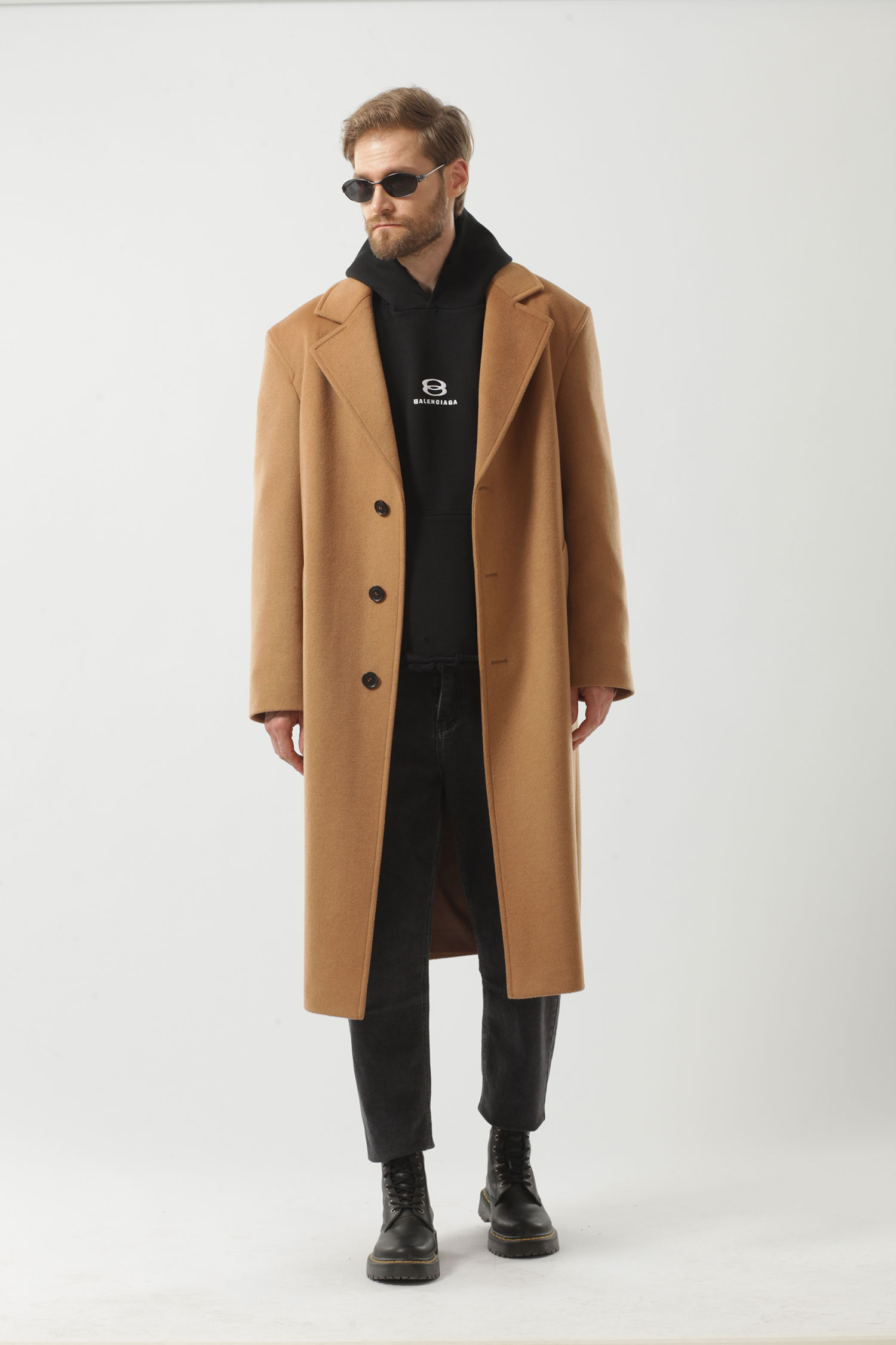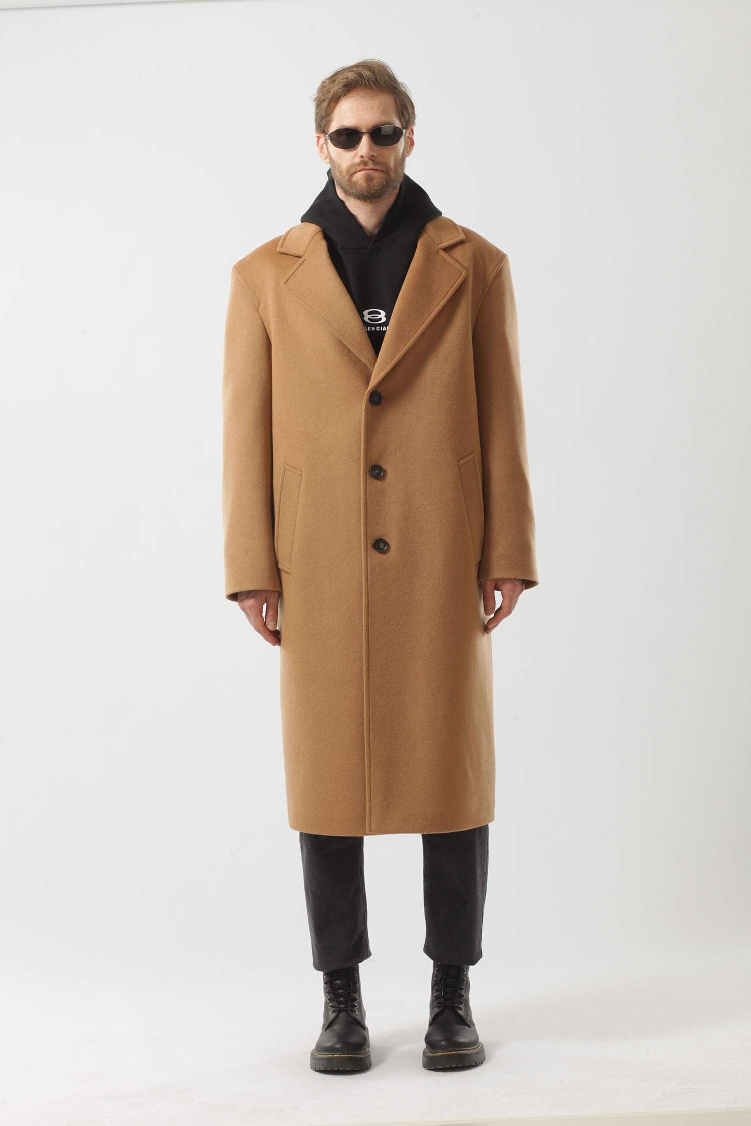 Длина по спинке – 120,0 см. Стильное однобортное пальто оверсайз свободного кроя, прямого силуэта. Покрой рукава рубашечный, двухшовный, достаточно свободный, слегка углублена пройма – все это позволяет носить пальто на худи. Воротник английский пиджачного типа с удобным уровнем застежки по борту на качественные фирменные пуговицы. Для удобства прорезные карманы-листочки расположены под небольшим наклоном.