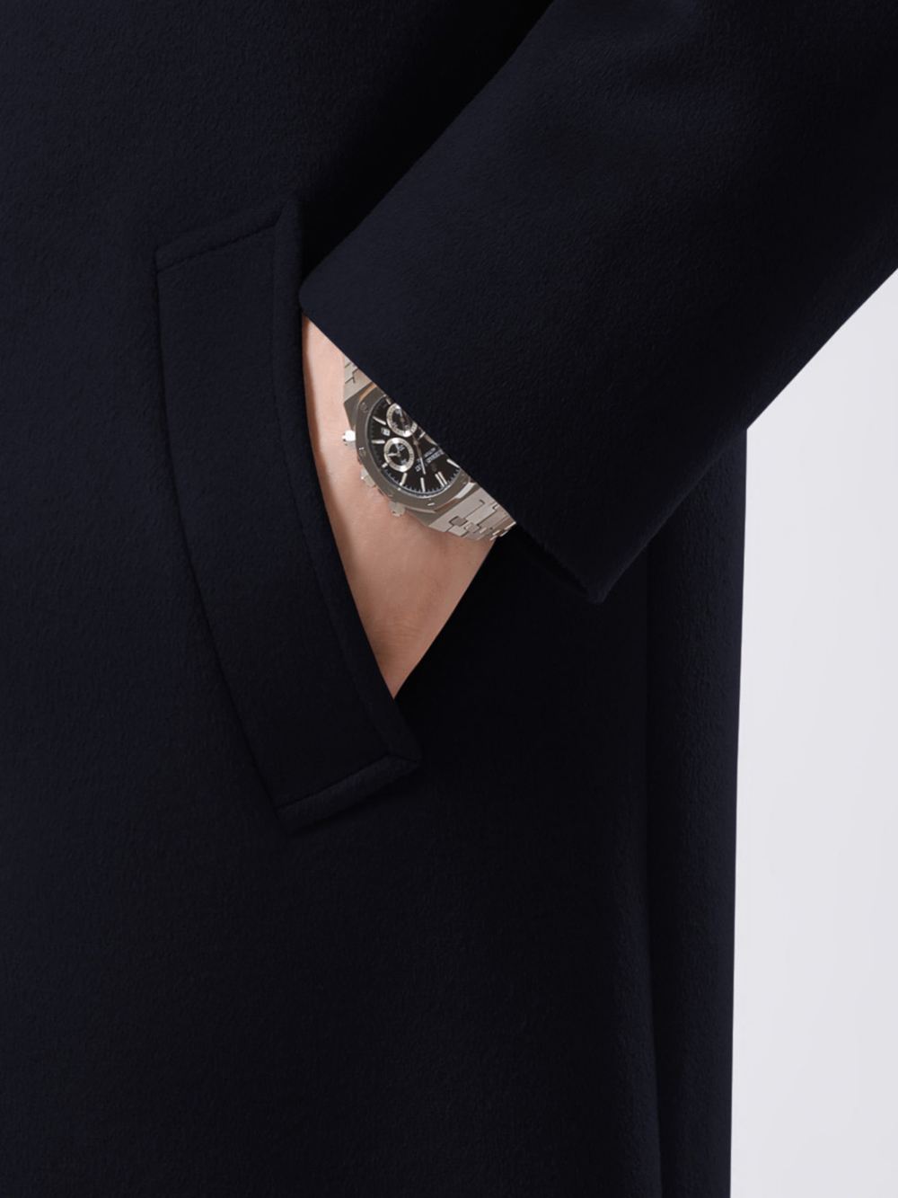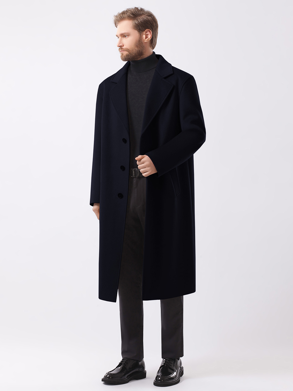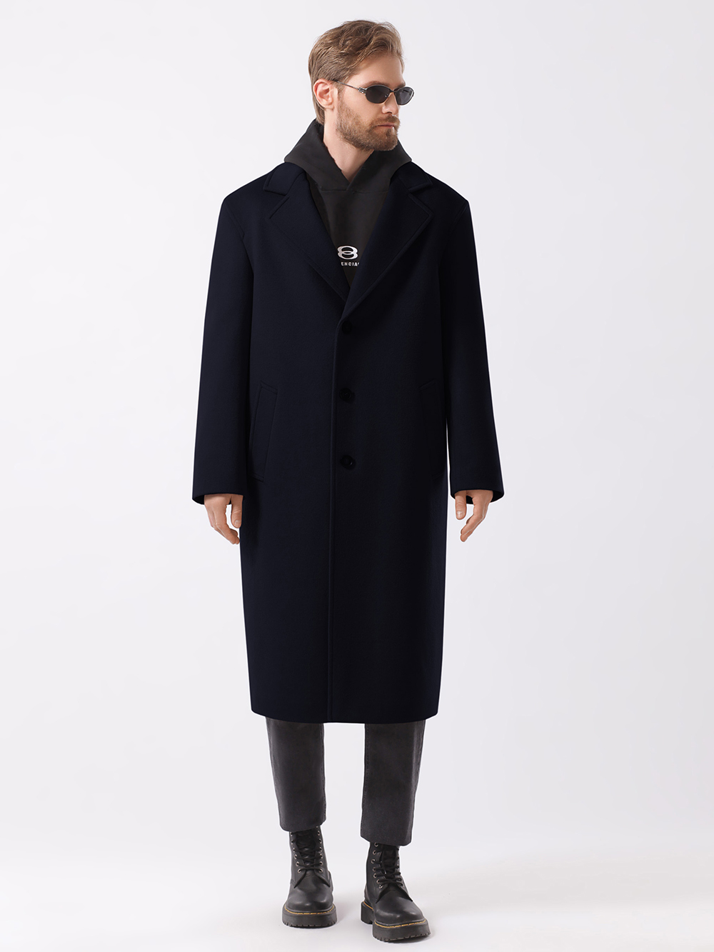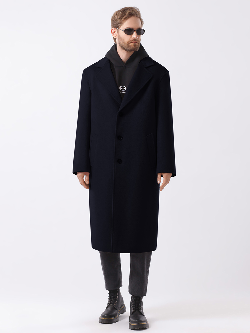 Стильное однобортное пальто оверсайз свободного кроя, прямого силуэта. Покрой рукава рубашечный, двухшовный, достаточно свободный, слегка углублена пройма – все это позволяет носить пальто на худи. Воротник английский пиджачного типа с удобным уровнем застежки по борту на качественные фирменные пуговицы. Для удобства прорезные карманы-листочки расположены под небольшим наклоном.