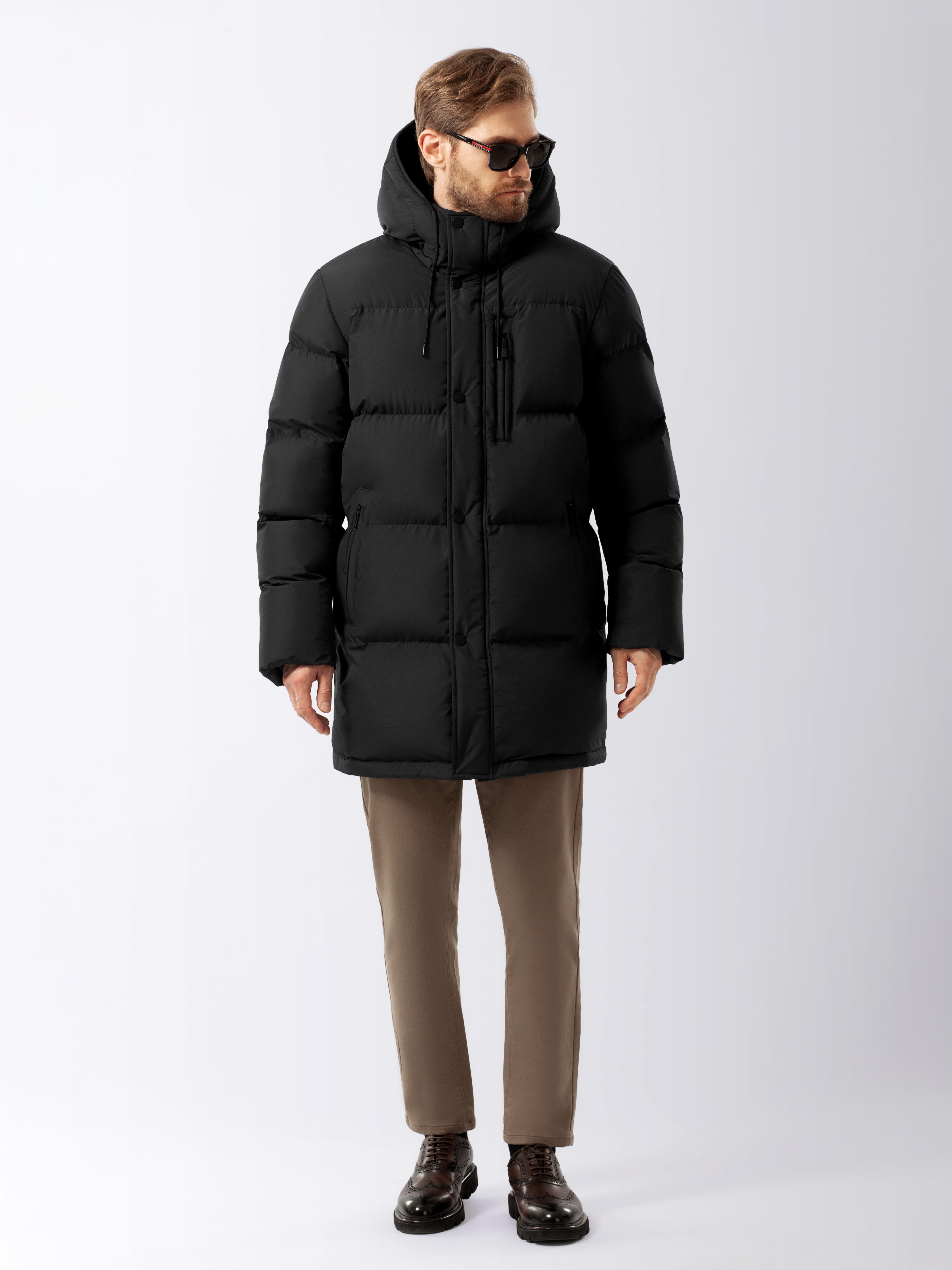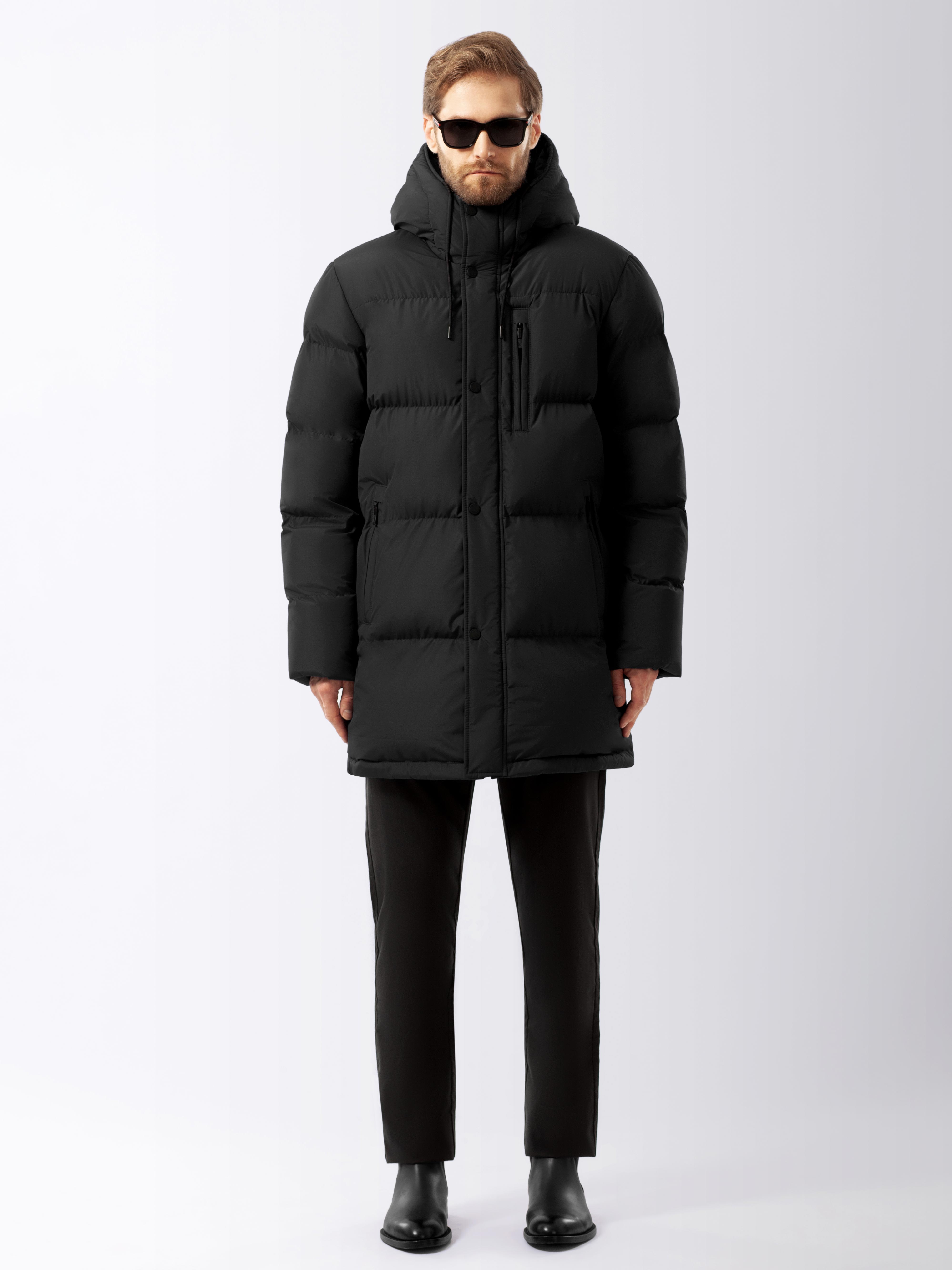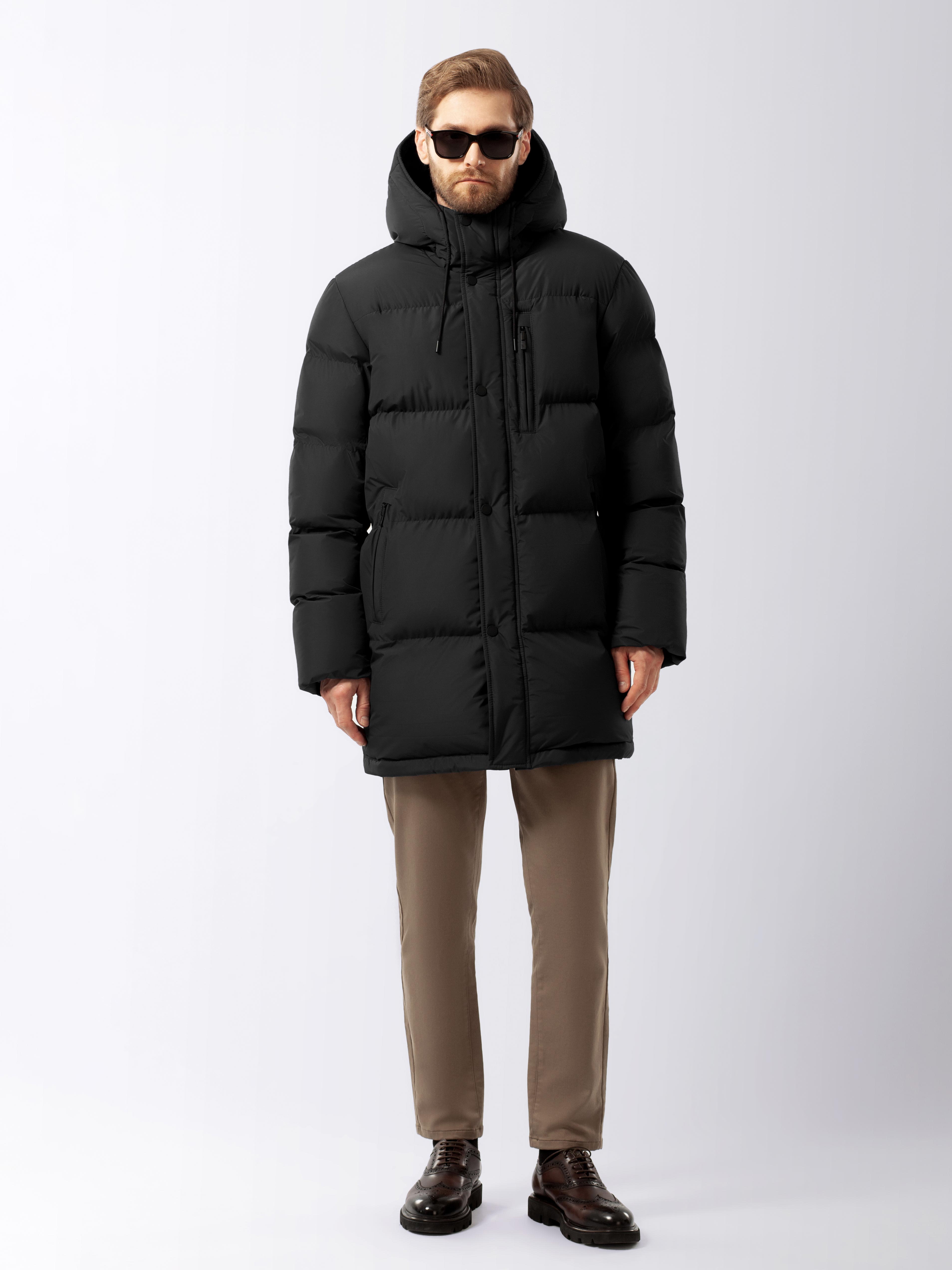Пуховик мужской зимний из плотной плащевой ткани утеплен надёжным слоем био-пуха высокого качества. Удлинённая куртка прямого кроя, с классическим воротником-стойкой, удобной застёжкой на молнии и фирменные кнопки. Втачной покрой рукава. Стильный пуховик с капюшоном имеет удобные карманы на молниях, мешковины карманов выполнены из мягкого эко меха. Застёжка по борту на молнию и фирменные кнопки. Ветрозащитная планка вдоль молнии способствует сохранению тепла внутри пуховика.