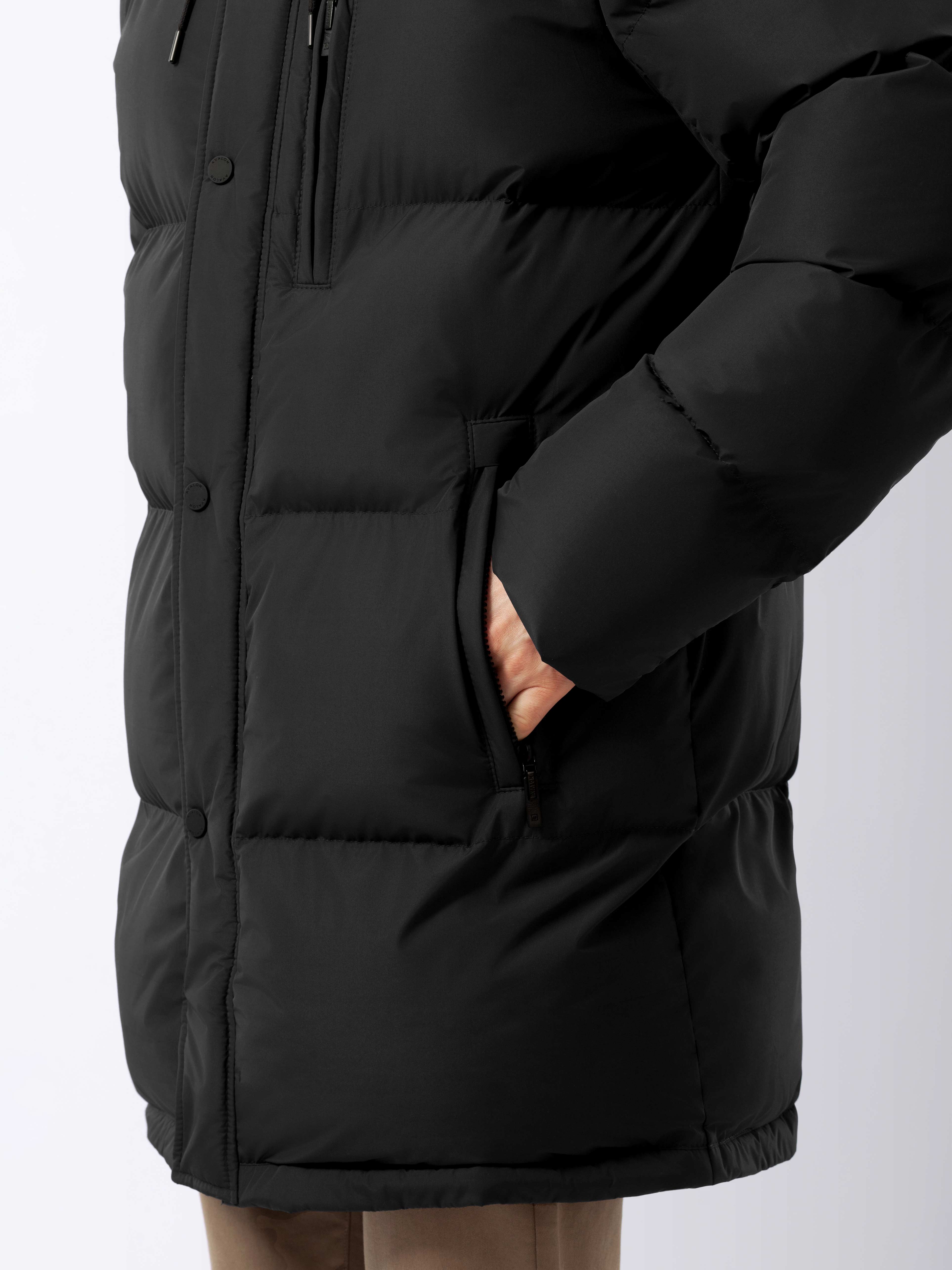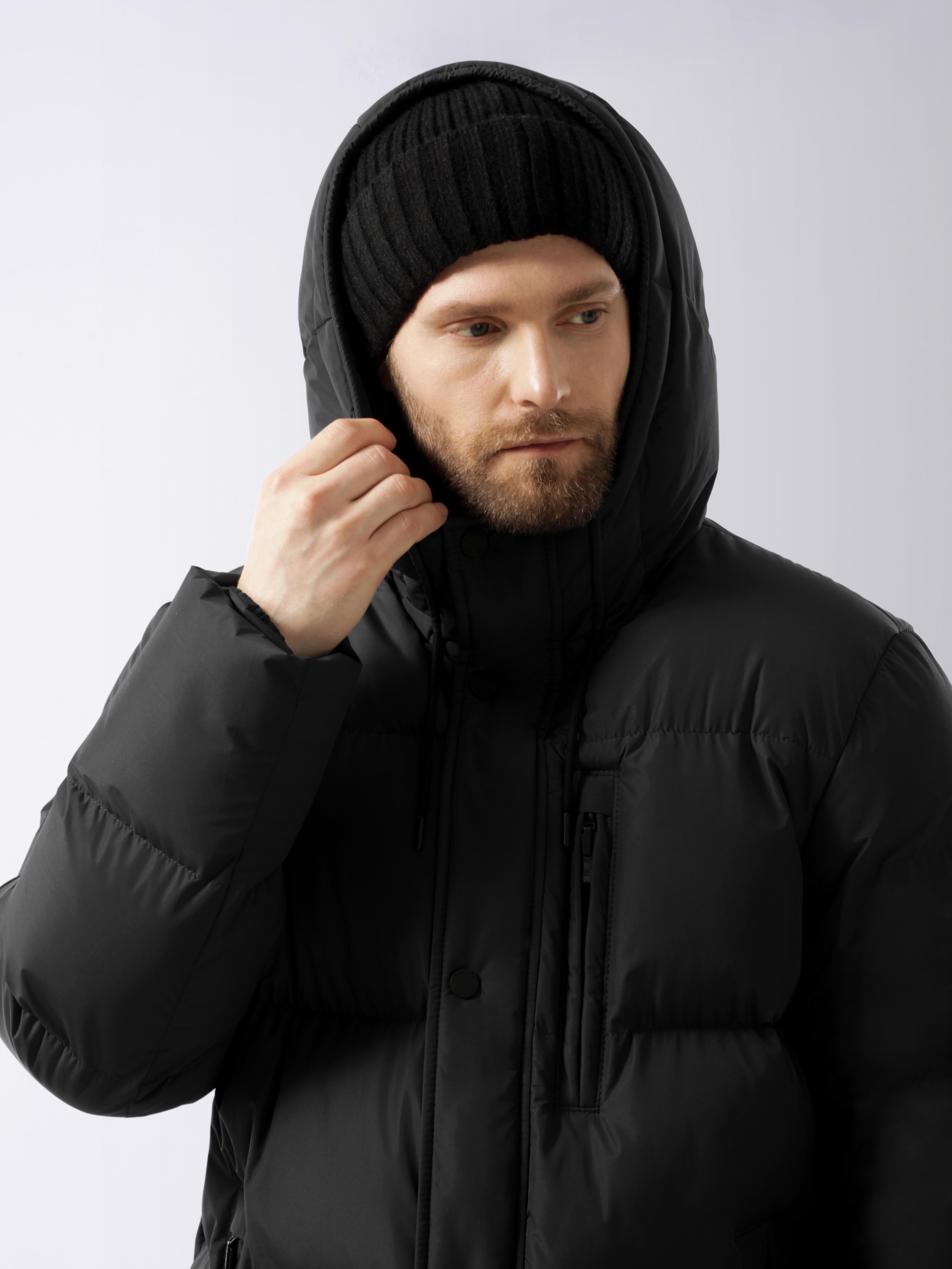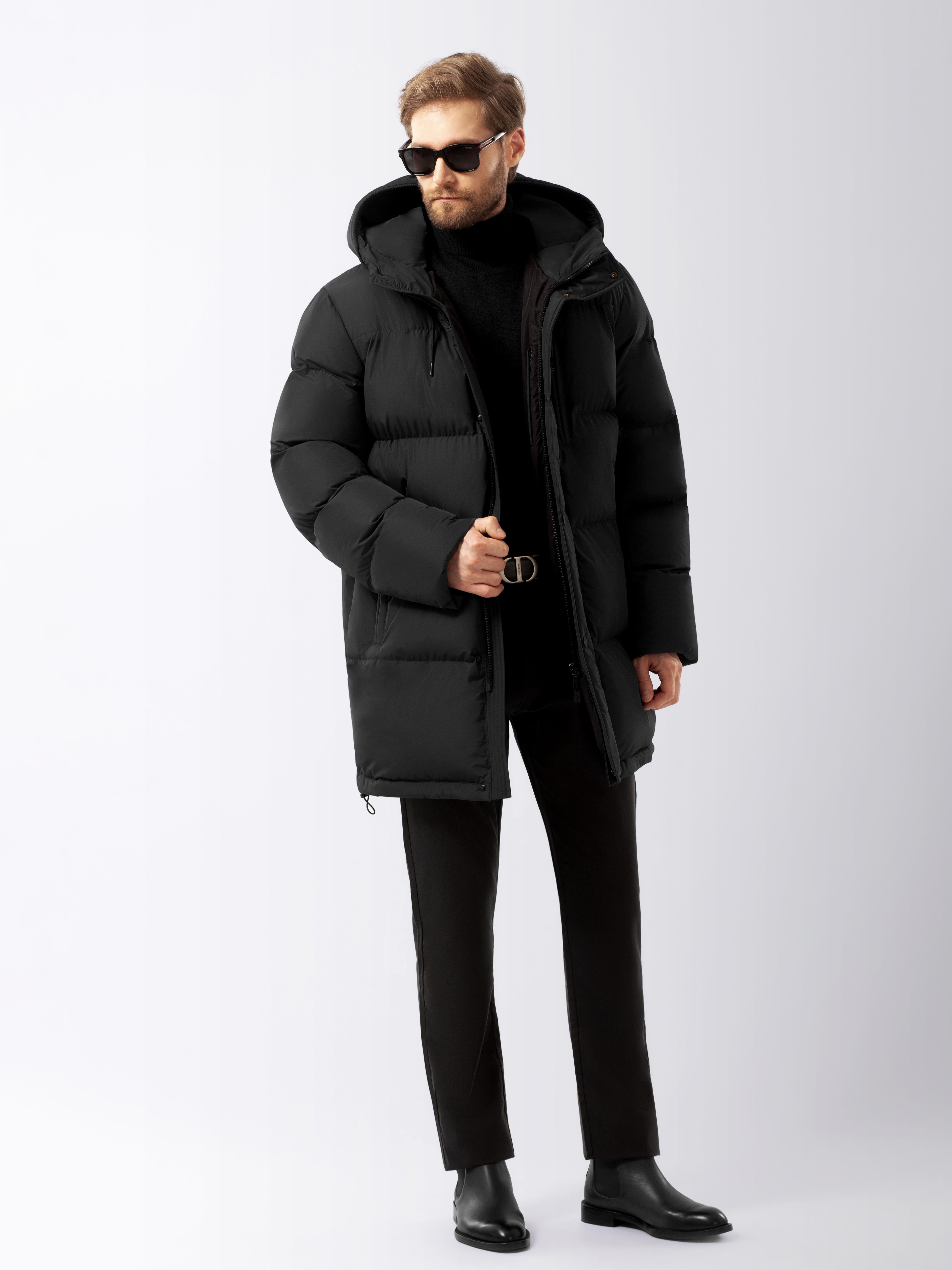 Пуховик мужской зимний из плотной плащевой ткани утеплен надёжным слоем био-пуха высокого качества. Удлинённая куртка прямого кроя, с классическим воротником-стойкой, удобной застёжкой на молнии и фирменные кнопки. Втачной покрой рукава. Стильный пуховик с капюшоном имеет удобные карманы на молниях, мешковины карманов выполнены из мягкого эко меха. Застёжка по борту на молнию и фирменные кнопки. Ветрозащитная планка вдоль молнии способствует сохранению тепла внутри пуховика.
