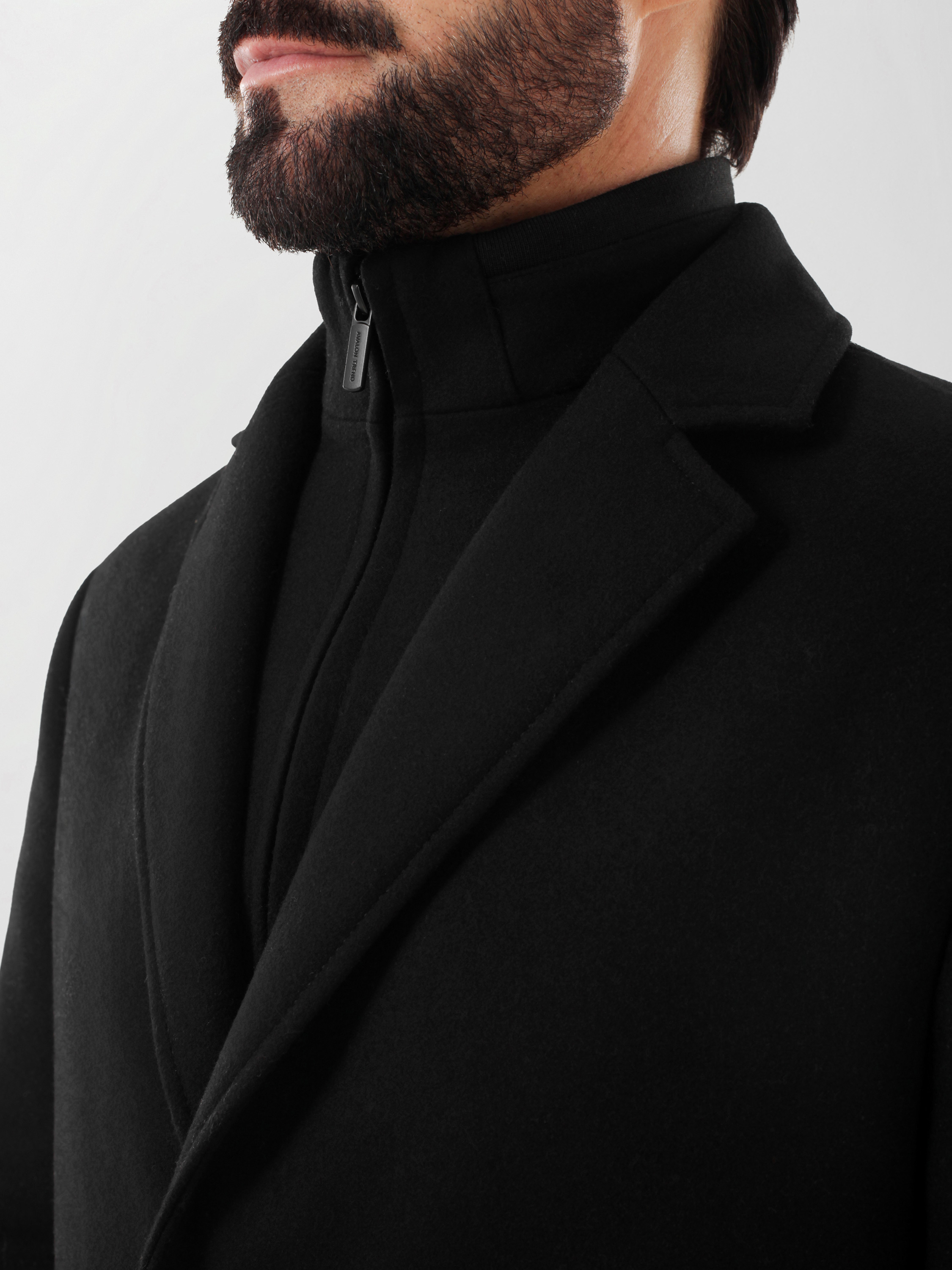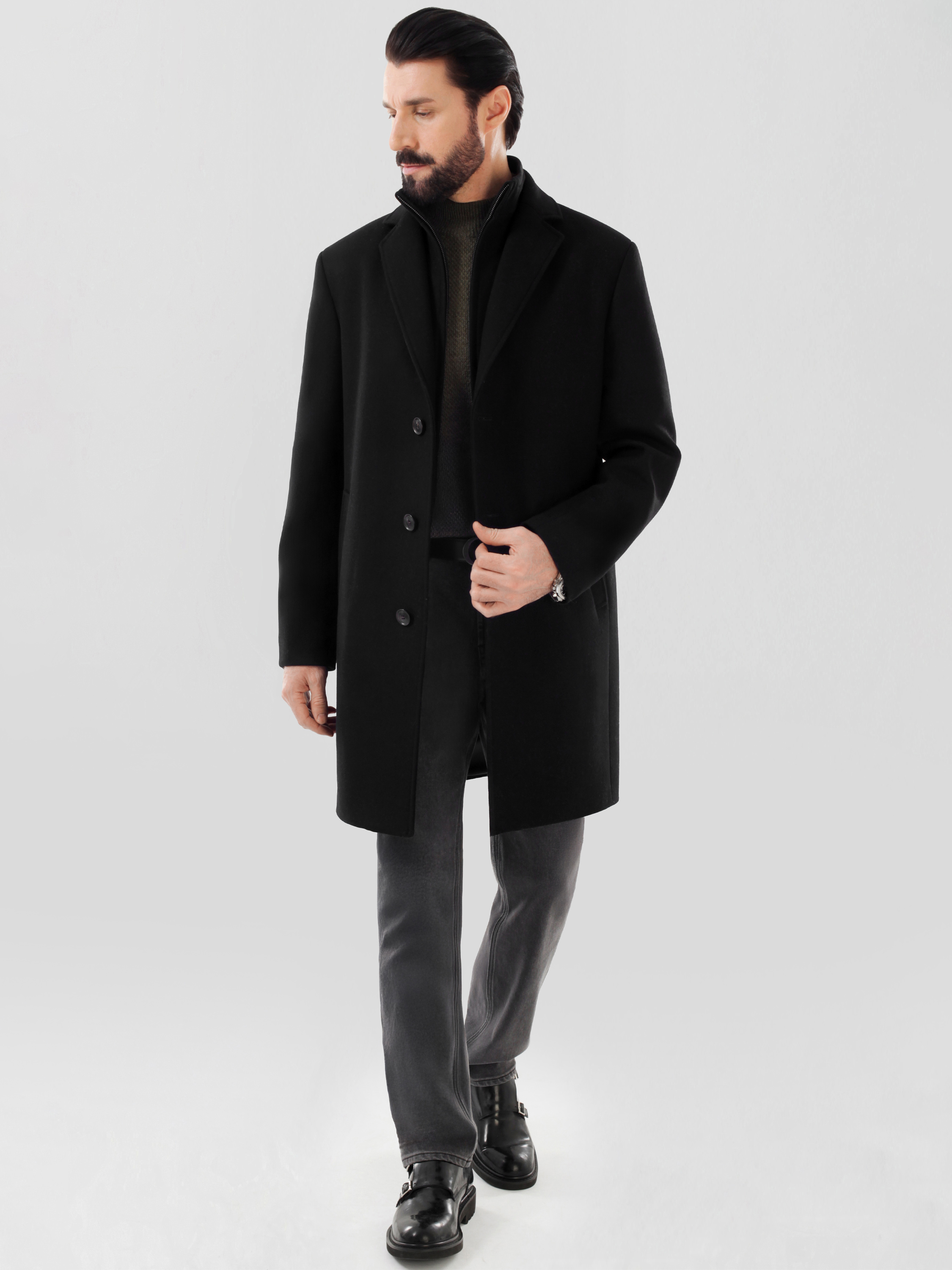 Мужское шерстяное пальто с английским воротником и съёмной манишкой станет прекрасной основой для образов в классическом и Smart-Casual стилях. Манишка из шерстяной ткани с комфортным воротником– стойкой защищает от ветра в прохладную погоду, надежно фиксируется на молниях и потайных пуговицах. Шлица по среднему шву спинки обеспечивает комфорт при ходьбе.