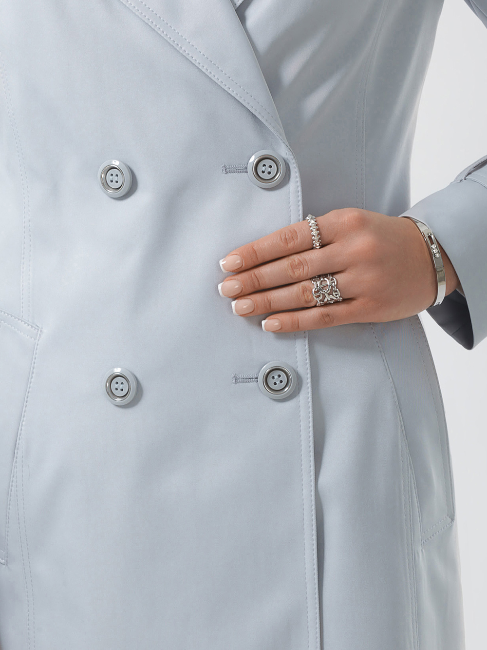 Комфортный полуприлегающий силуэт, эффектный английский воротник на стойке, карманы-листочки, удобная застёжка на акцентные пуговицы.