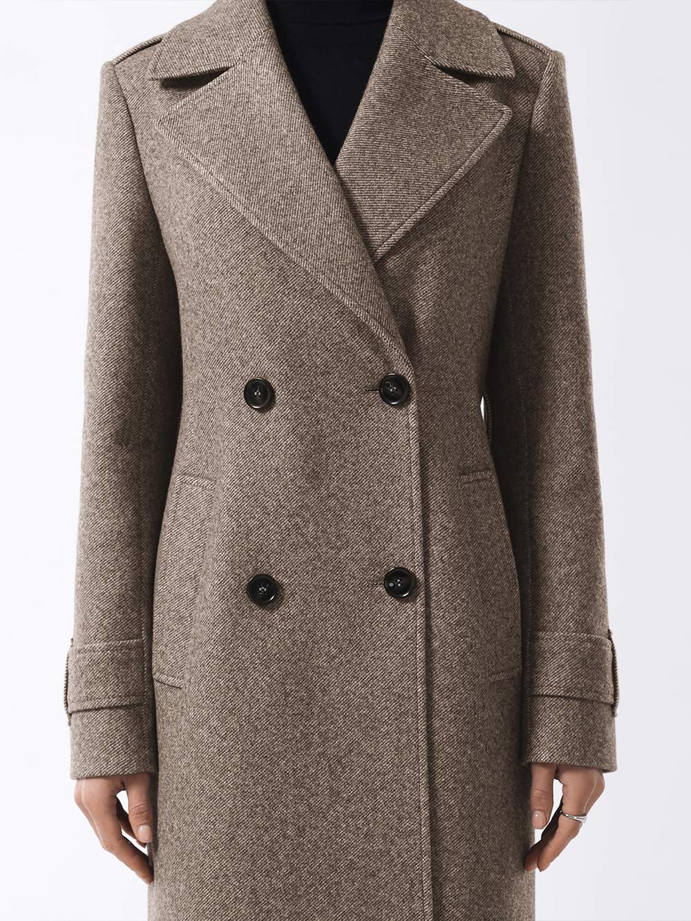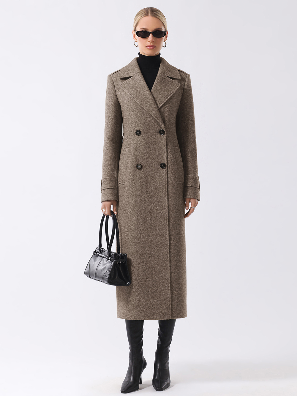 Трендовый двубортный тренч в длине макси. Пальто выполнено из фактурной ткани в диагональ. Полуприлегающий силуэт, лаконичный крой. Втачные погоны и паты подчеркивают стиль. Комфортные втачные рукава. Английский воротник с модными широкими лацканами. Удобные карманы - листочки, застежка на фирменные пуговицы. Шлица в среднем шве спинки. Пальто декорировано отделочными строчками.