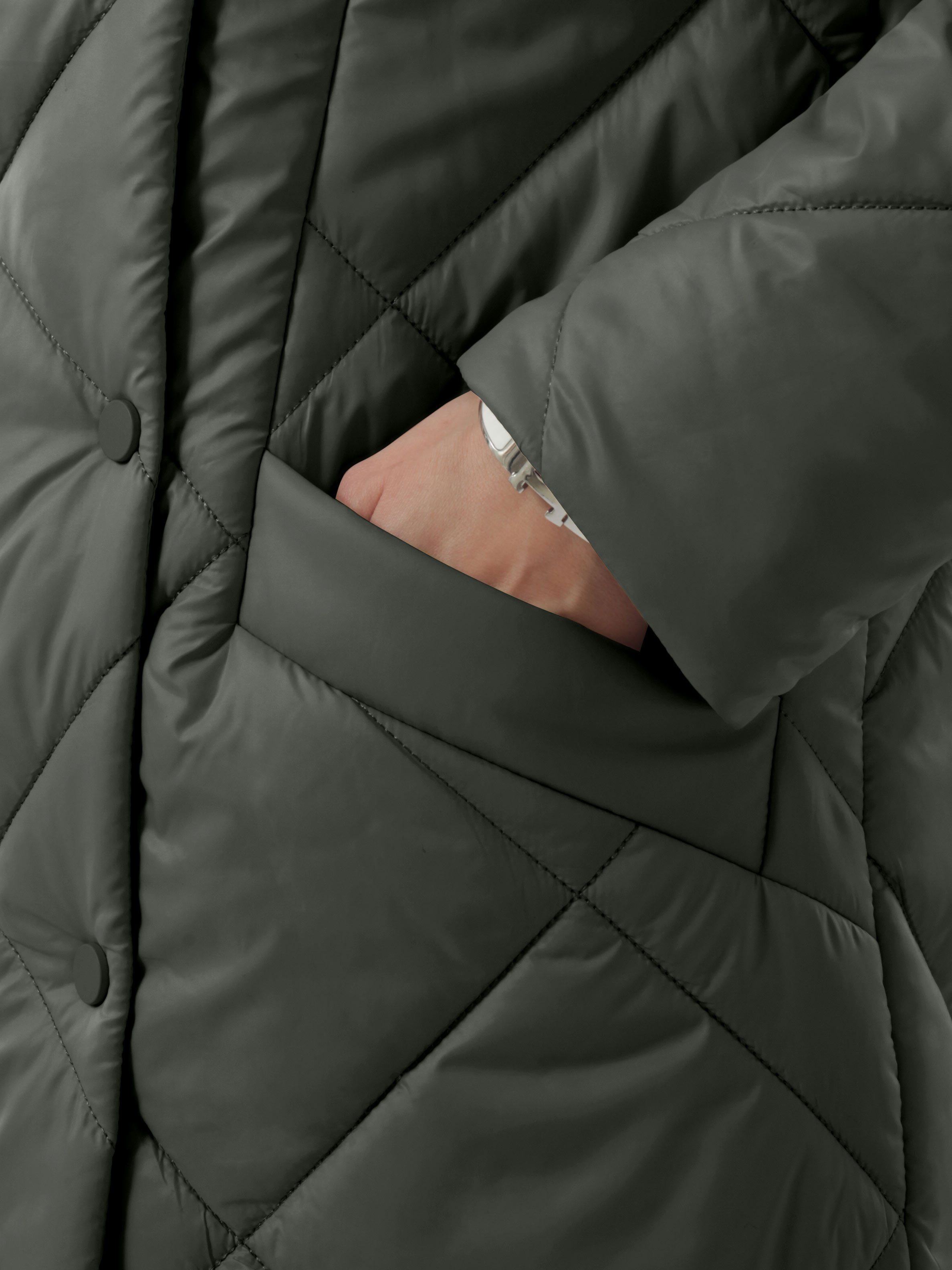 Классические втачные рукава с возможностью отворота. Красивый современный капюшон с утягивающей кулиской на фиксаторах. Карманы прорезные с листочками. Надежная застежка на установочные кнопки и молнию.