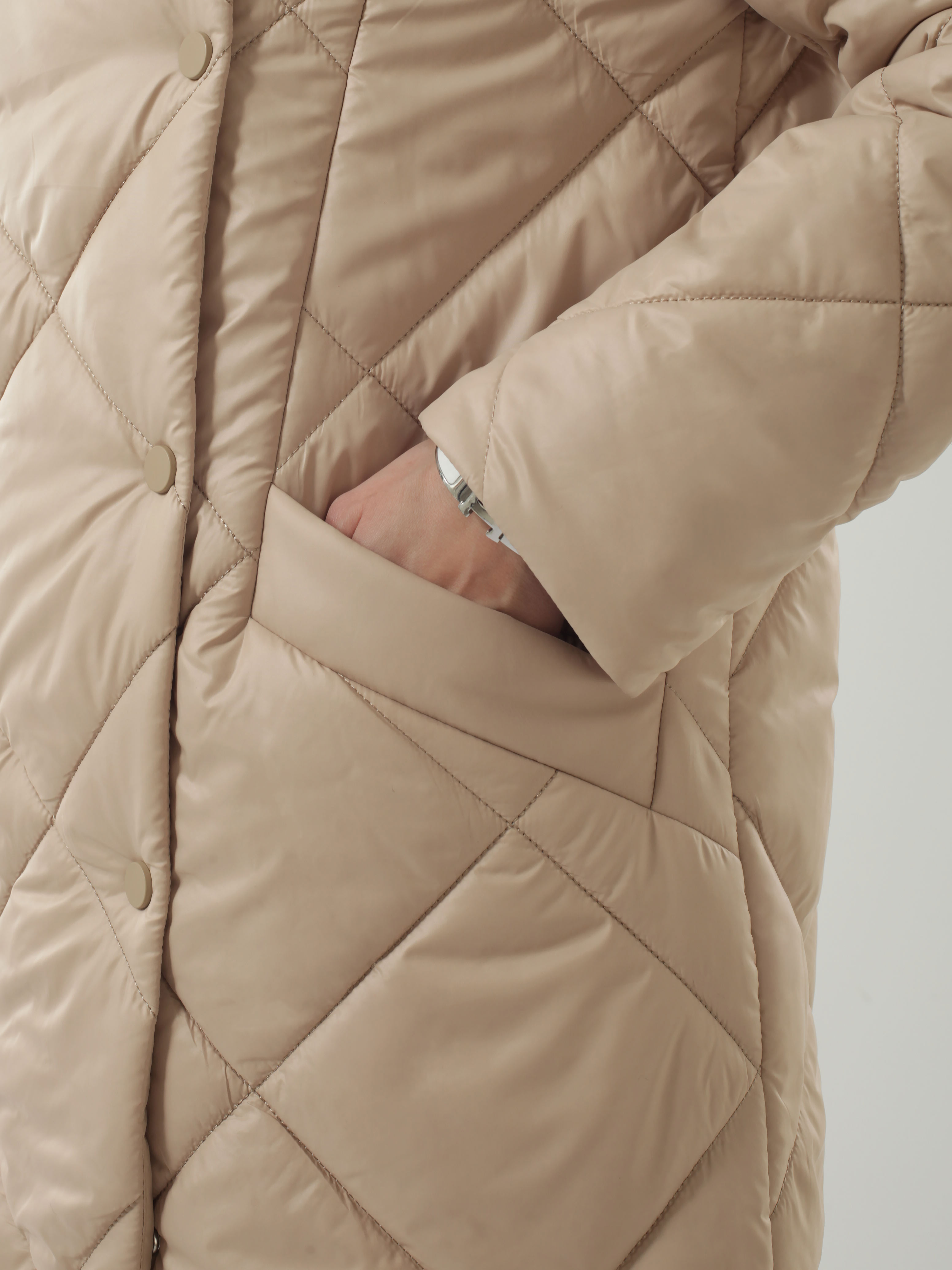 Классические втачные рукава с возможностью отворота. Красивый современный капюшон с утягивающей кулиской на фиксаторах. Карманы прорезные с листочками. Надежная застежка на установочные кнопки и молнию.