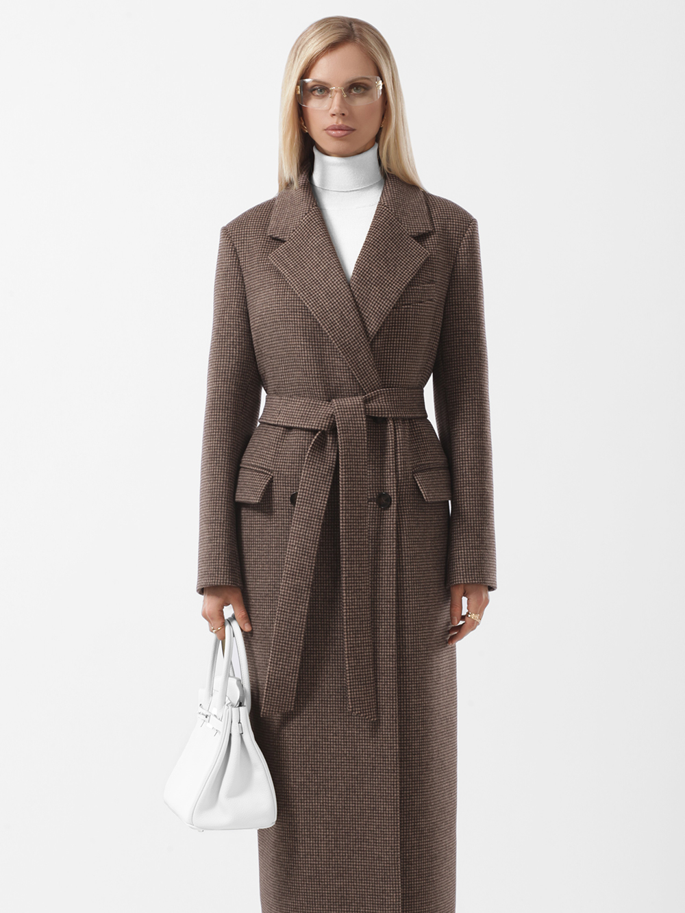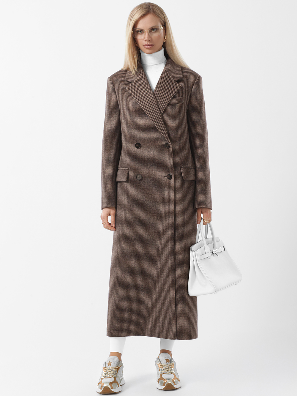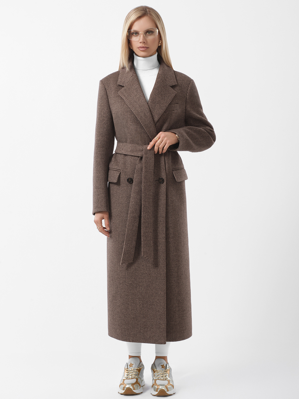 Трендовое пальто оверсайз с расширенной линией плечевого пояса. Модель актуального объёмного прямого силуэта из популярной шерстяной ткани с классическим переплетением "гусиная лапка". Актуальный лаконичный крой, комфортные втачные рукава. Английский воротник пиджачного типа. Декоративный нагрудный карман. Удобные прорезные карманы с клапанами, застежка на фирменные пуговицы. Шлица в среднем шве спинки. Пояс в комплекте.