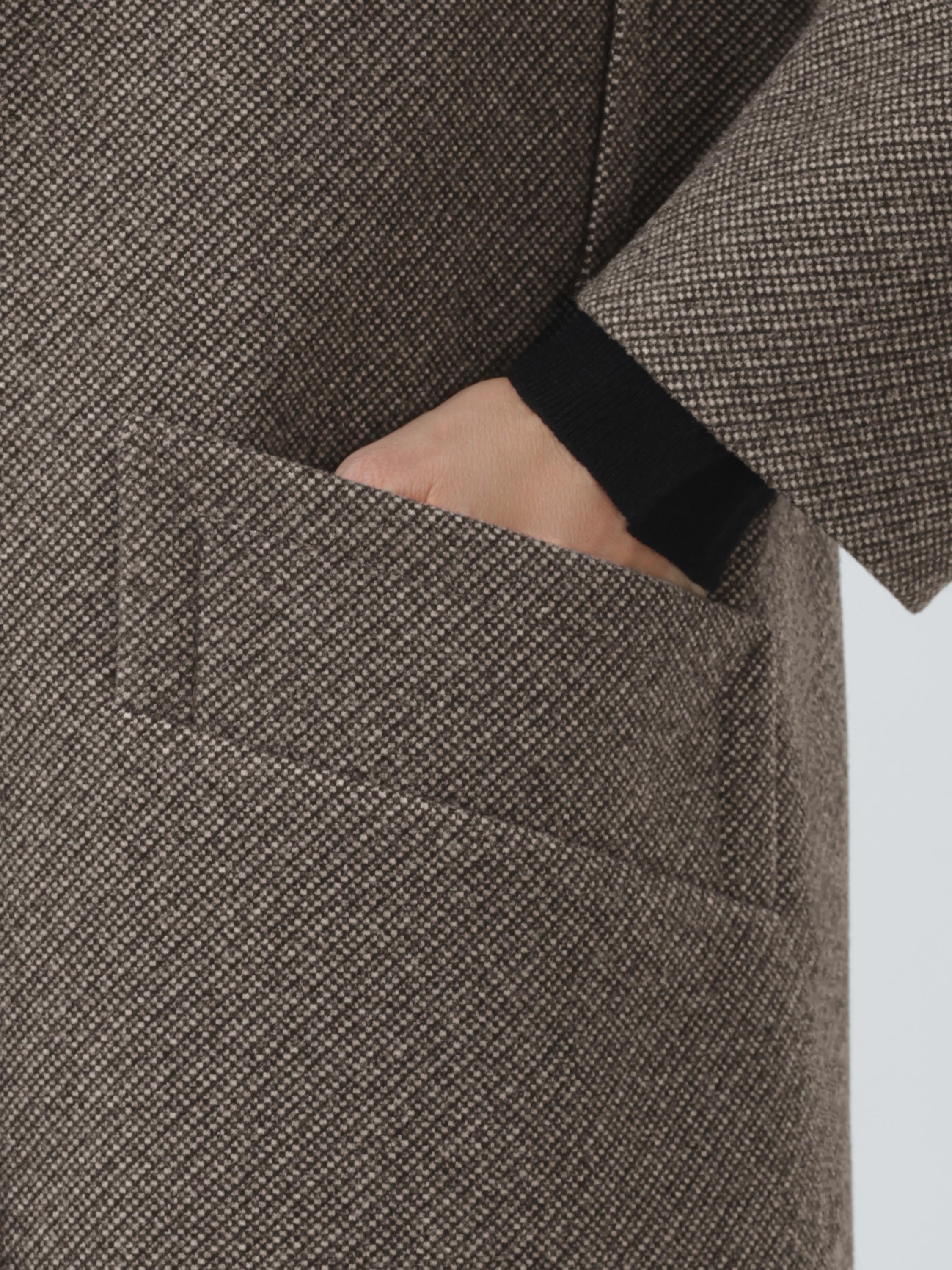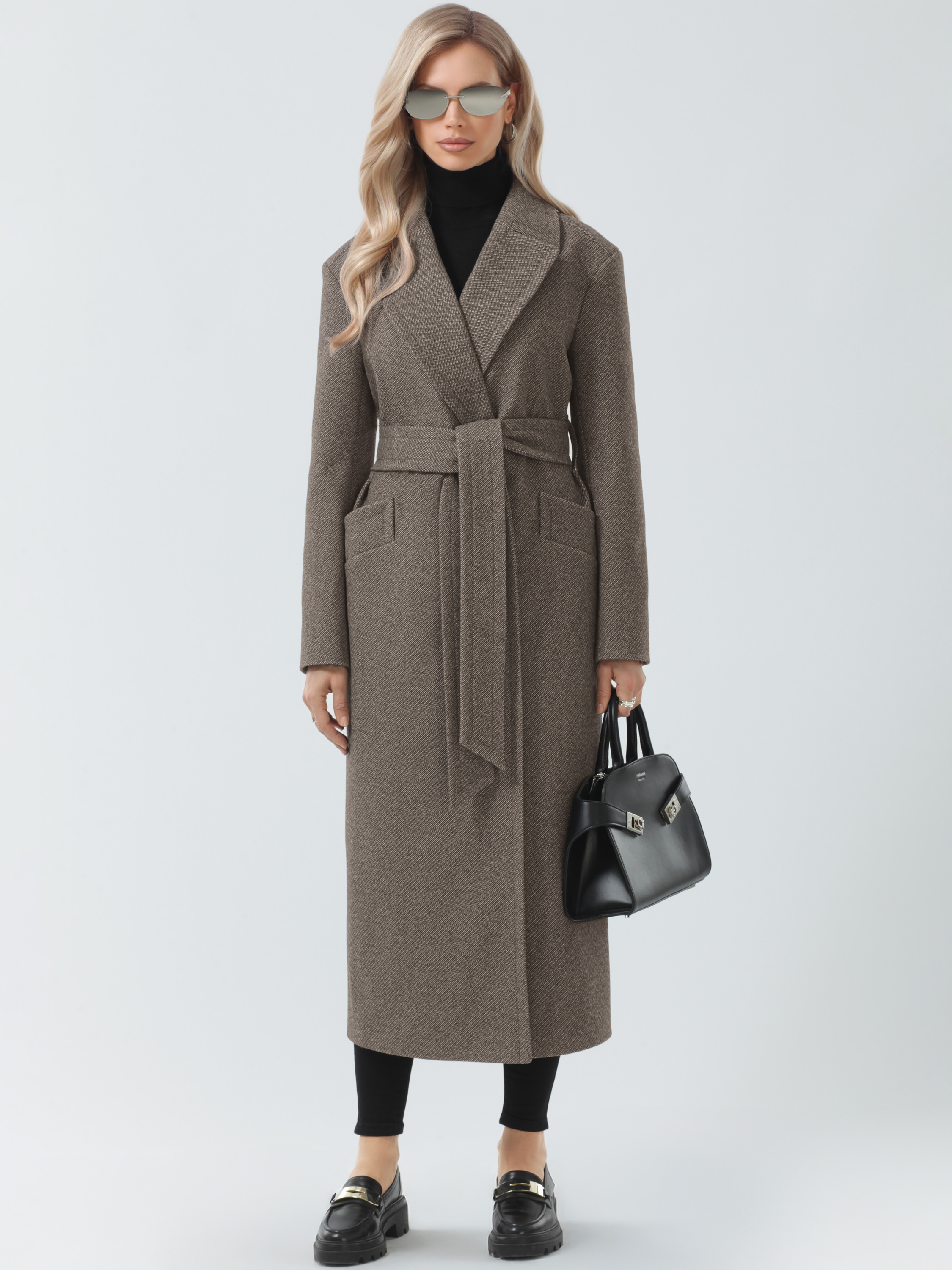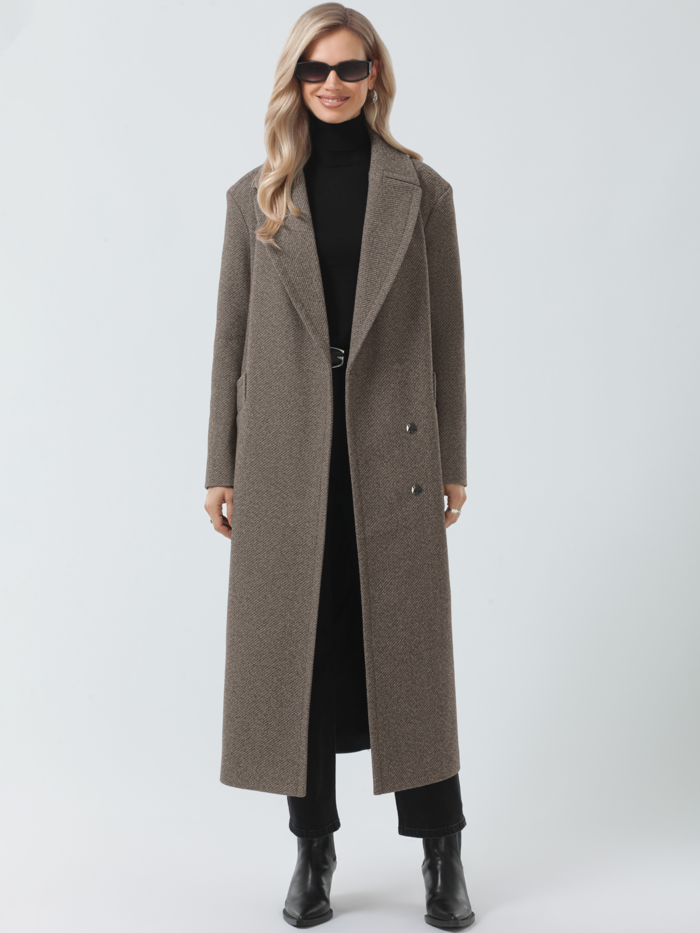 Модное пальто c длиной макси из плотной фактурной ткани. Прямой силуэт, спокойный крой. Немного заниженная линия проймы. Втачные кокетки имитируют погоны, подчеркивая плавную линию плеч. Английский воротник. Застежка на пришивные кнопки, удобные прорезные карманы с листочками. Шлица в среднем шве спинки. Пояс в комплекте. Пальто декорировано отделочными строчками.