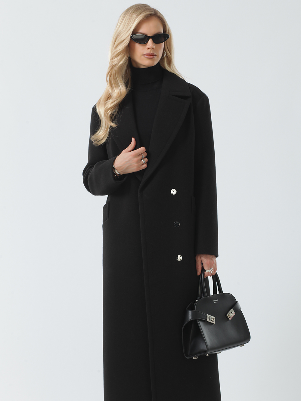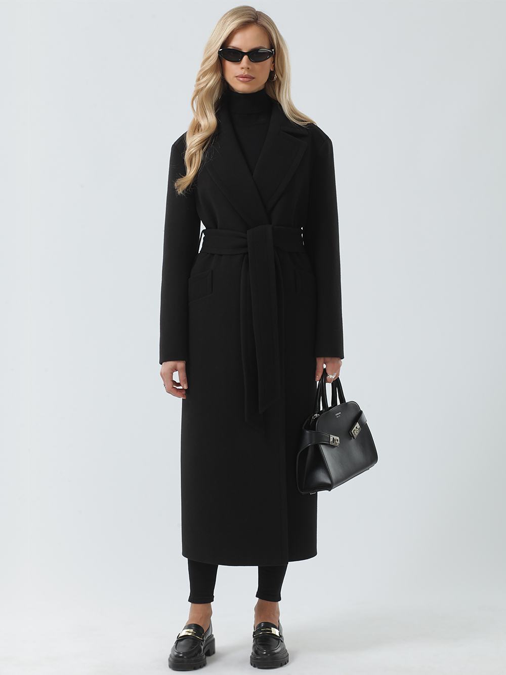Модное длинное пальто из плотной мягкой ткани. Прямой силуэт, спокойный крой. Немного заниженная линия проймы. Втачные кокетки имитируют погоны, подчеркивая плавную линию плеч. Английский воротник. Застежка на пришивные кнопки, удобные прорезные карманы с листочками. Шлица в среднем шве спинки. Пояс в комплекте. Пальто декорировано отделочными строчками.