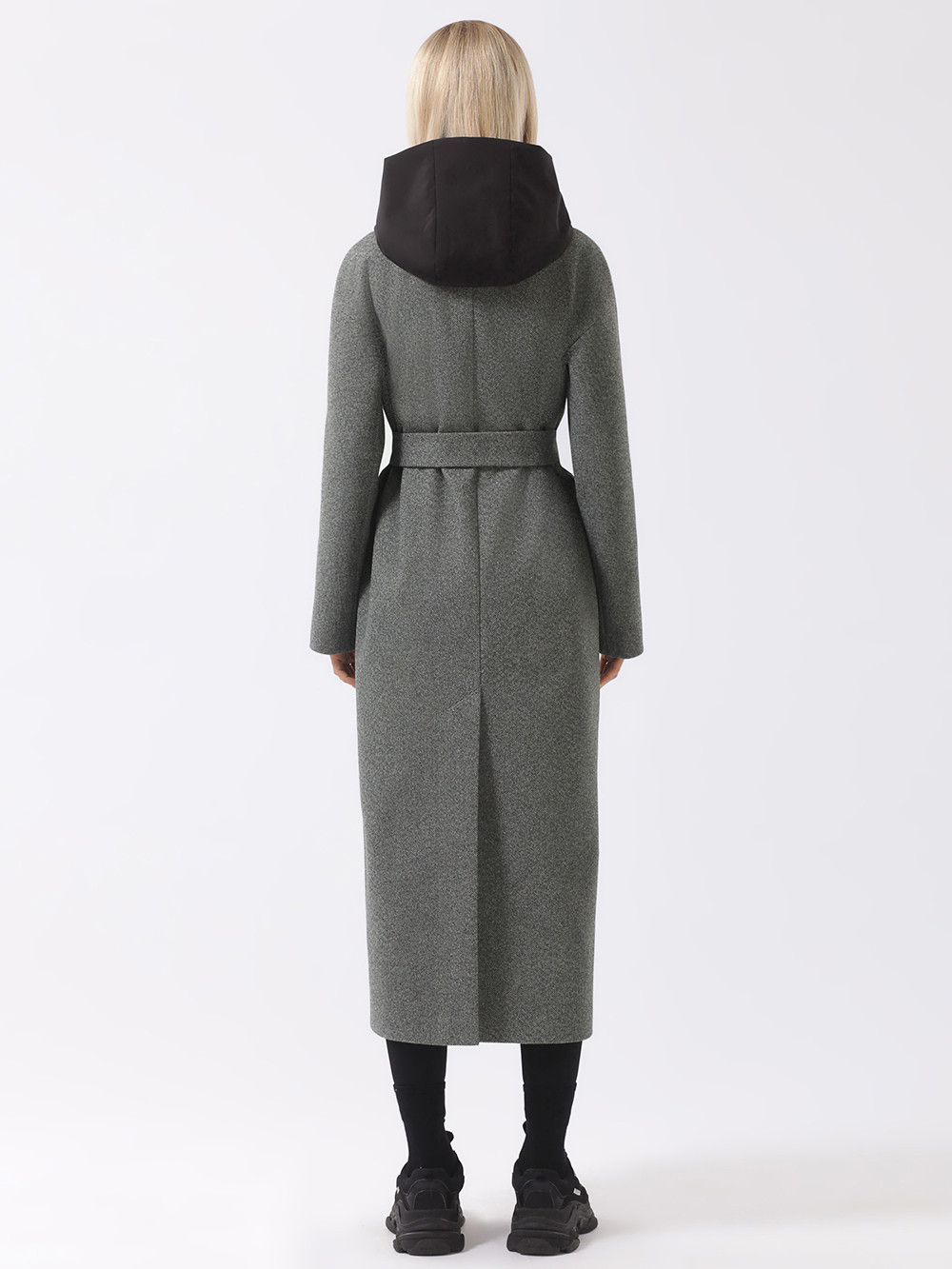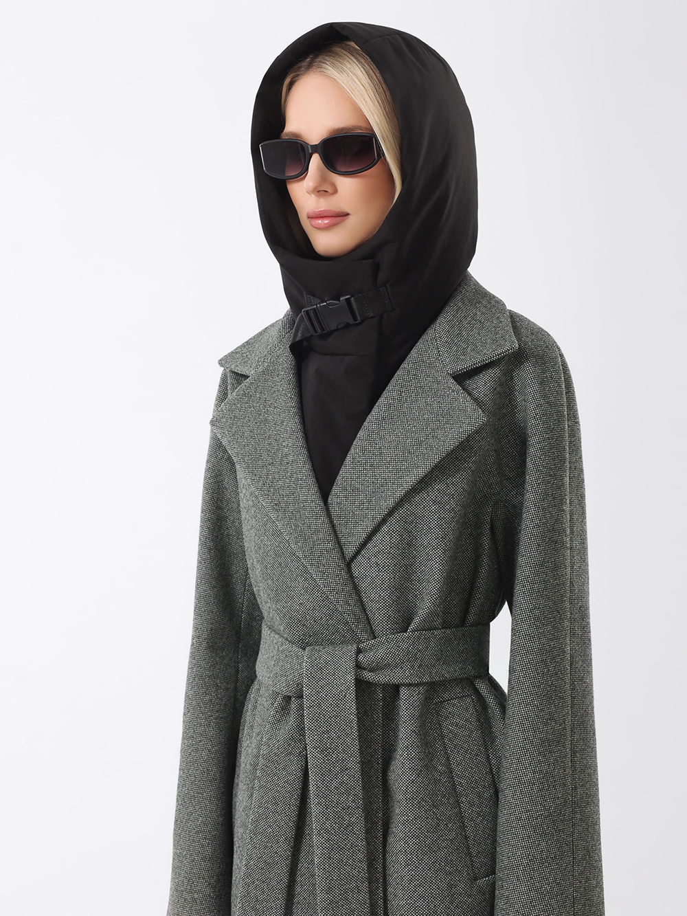 Супермодное пальто в длине макси. Модель свободного силуэта выполнена в классическом твиде. Актуальный лаконичный крой. Плавная линия плеча, комфортные комбинированные рукава с возможностью отворотов. Воротник – невысокая стойка – раскладывается в английский. Съёмная манишка с капюшоном из плотной плащевой ткани на утеплителе. Манишка фиксируется на пуговицы, застёгивается с помощью пряжки – фастекс на тесьме. Удобные карманы - листочки, застежка на фирменные пуговицы. Шлица в среднем шве спинки.