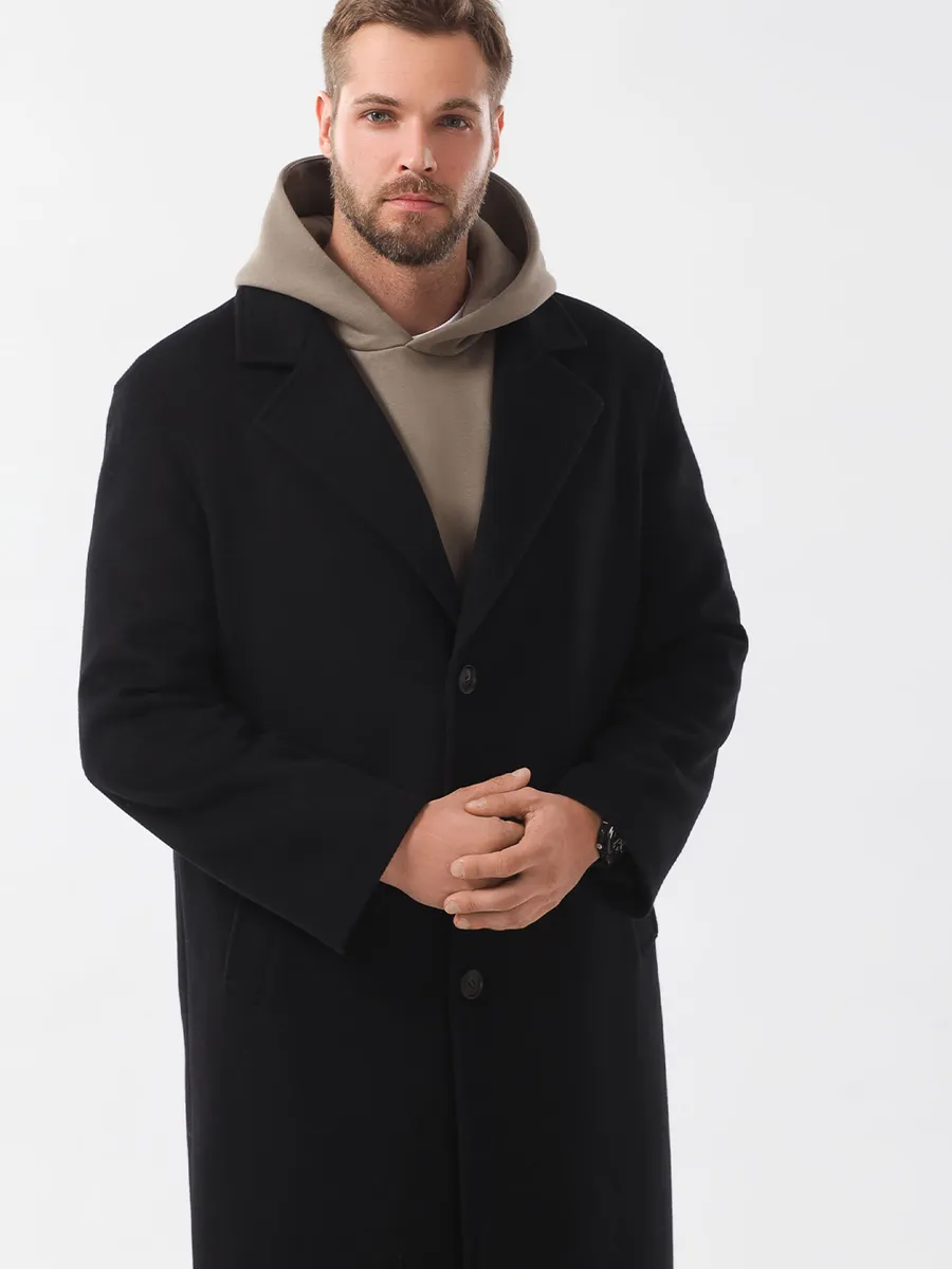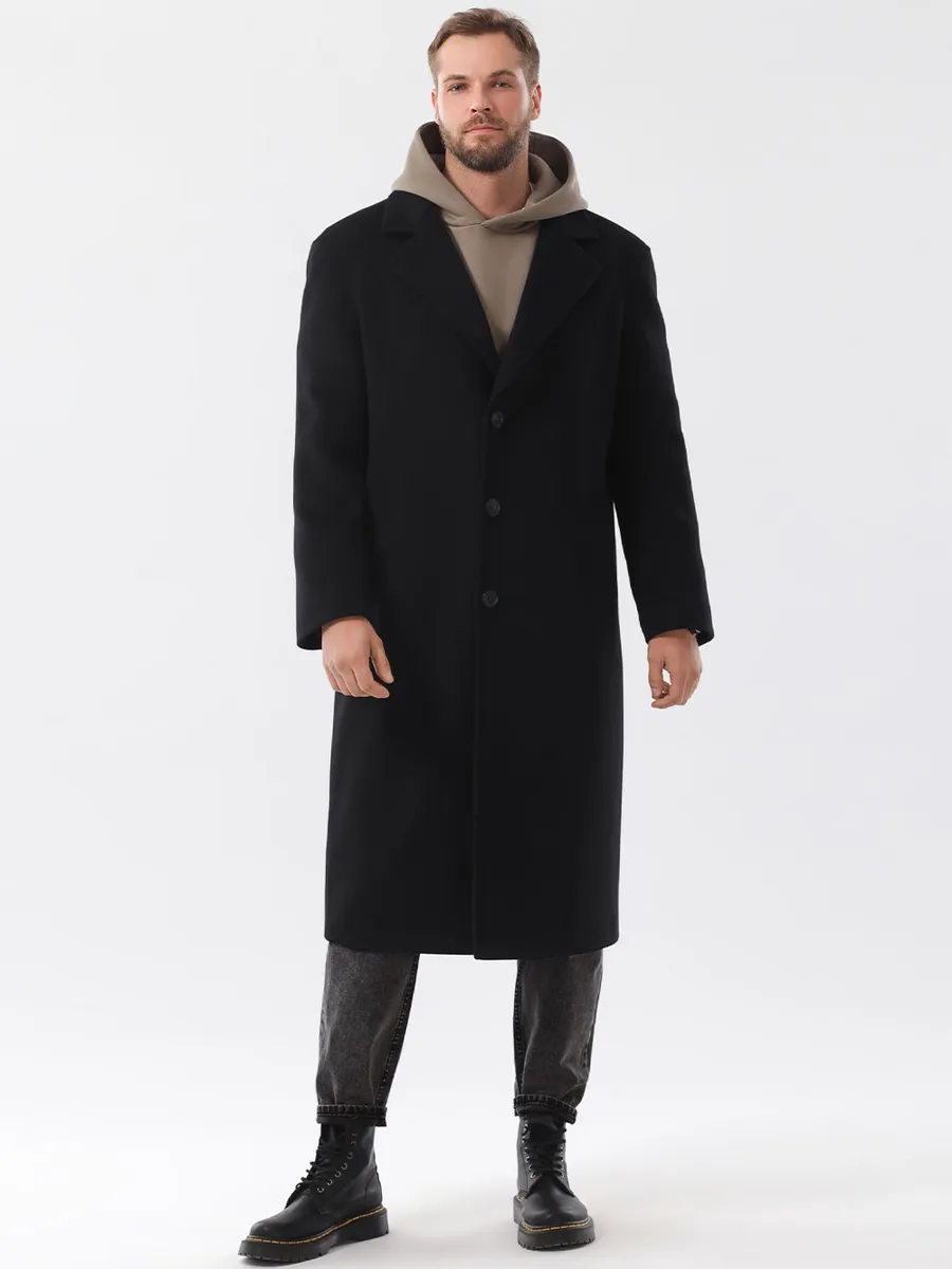 Стильное однобортное пальто оверсайз свободного кроя, прямого силуэта. Покрой рукава рубашечный, двухшовный, достаточно свободный, слегка углублена пройма – все это позволяет носить пальто на худи. Воротник английский пиджачного типа с удобным уровнем застежки по борту на качественные фирменные пуговицы. Для удобства прорезные карманы-листочки расположены под небольшим наклоном.