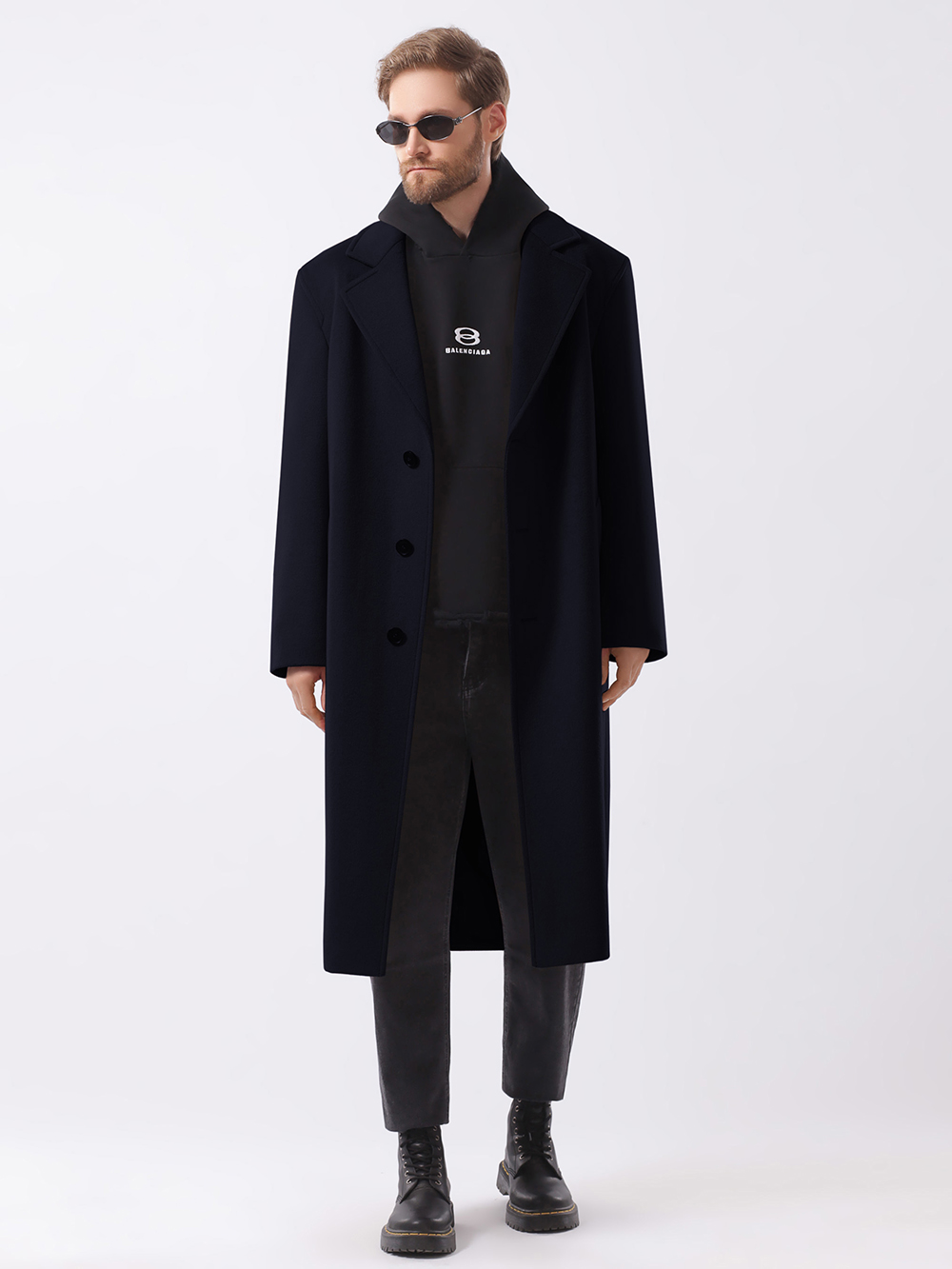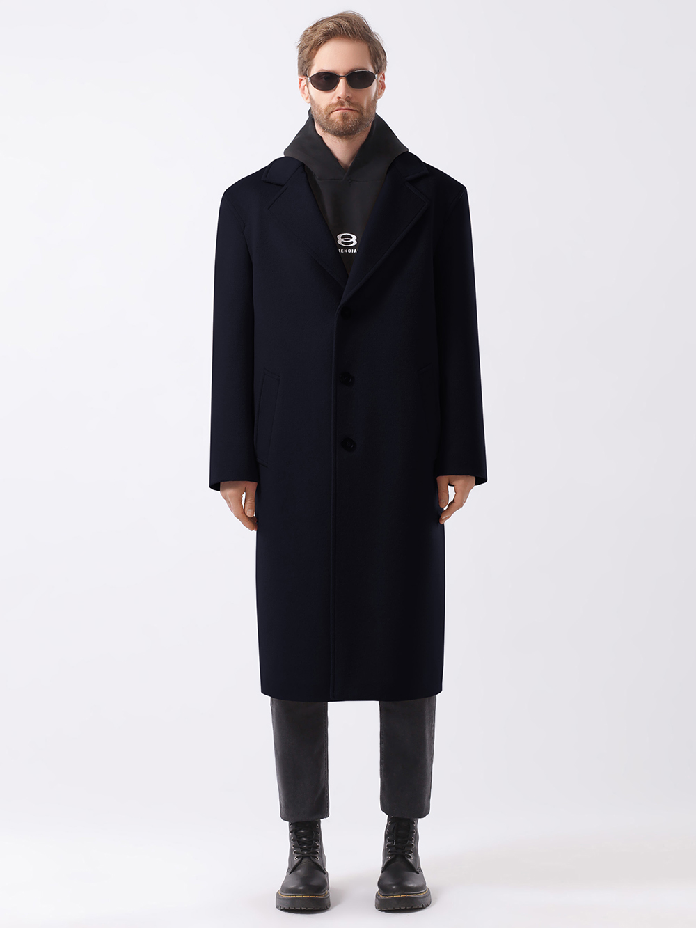 Стильное однобортное пальто оверсайз свободного кроя, прямого силуэта. Покрой рукава рубашечный, двухшовный, достаточно свободный, слегка углублена пройма – все это позволяет носить пальто на худи. Воротник английский пиджачного типа с удобным уровнем застежки по борту на качественные фирменные пуговицы. Для удобства прорезные карманы-листочки расположены под небольшим наклоном.