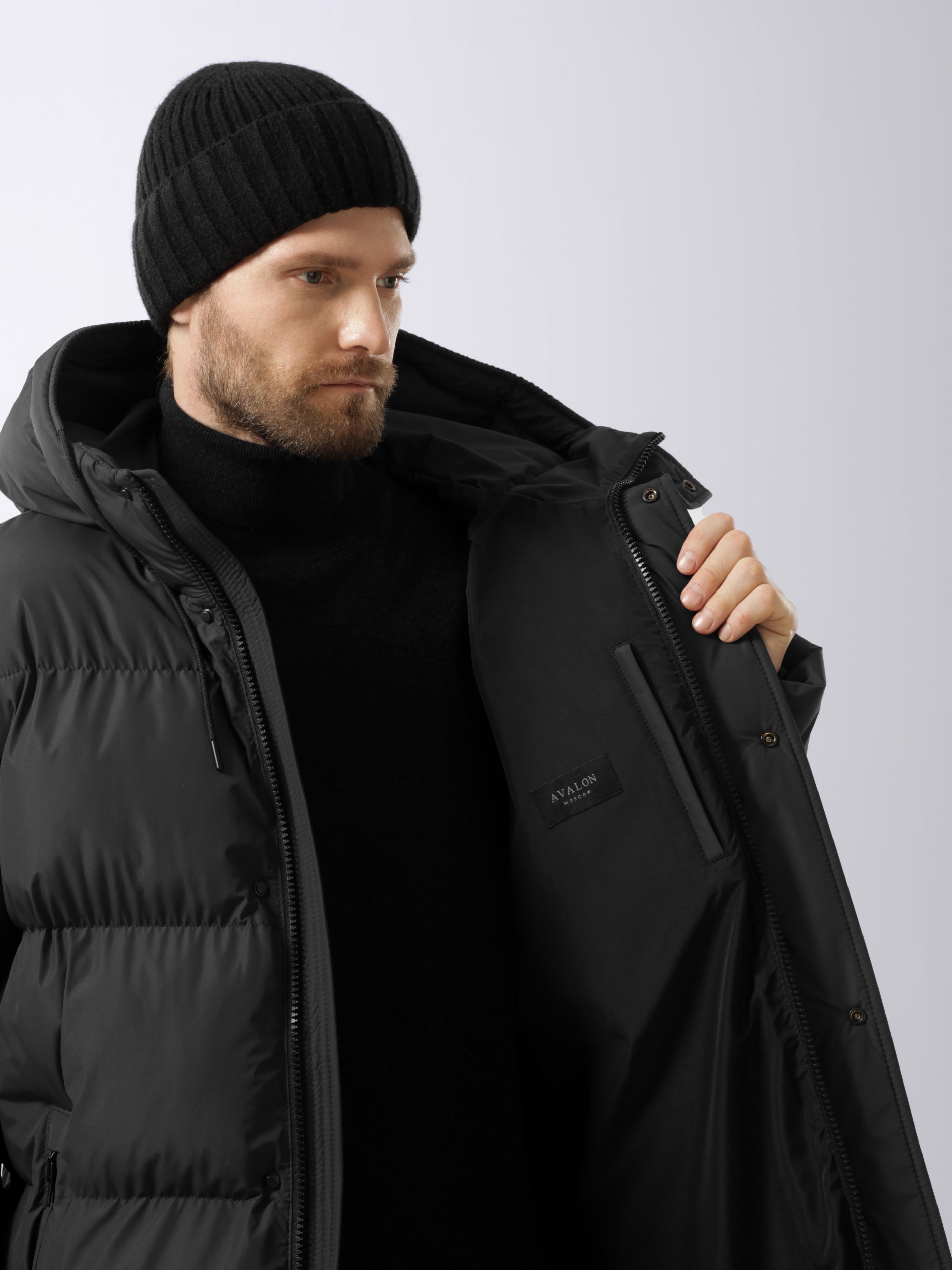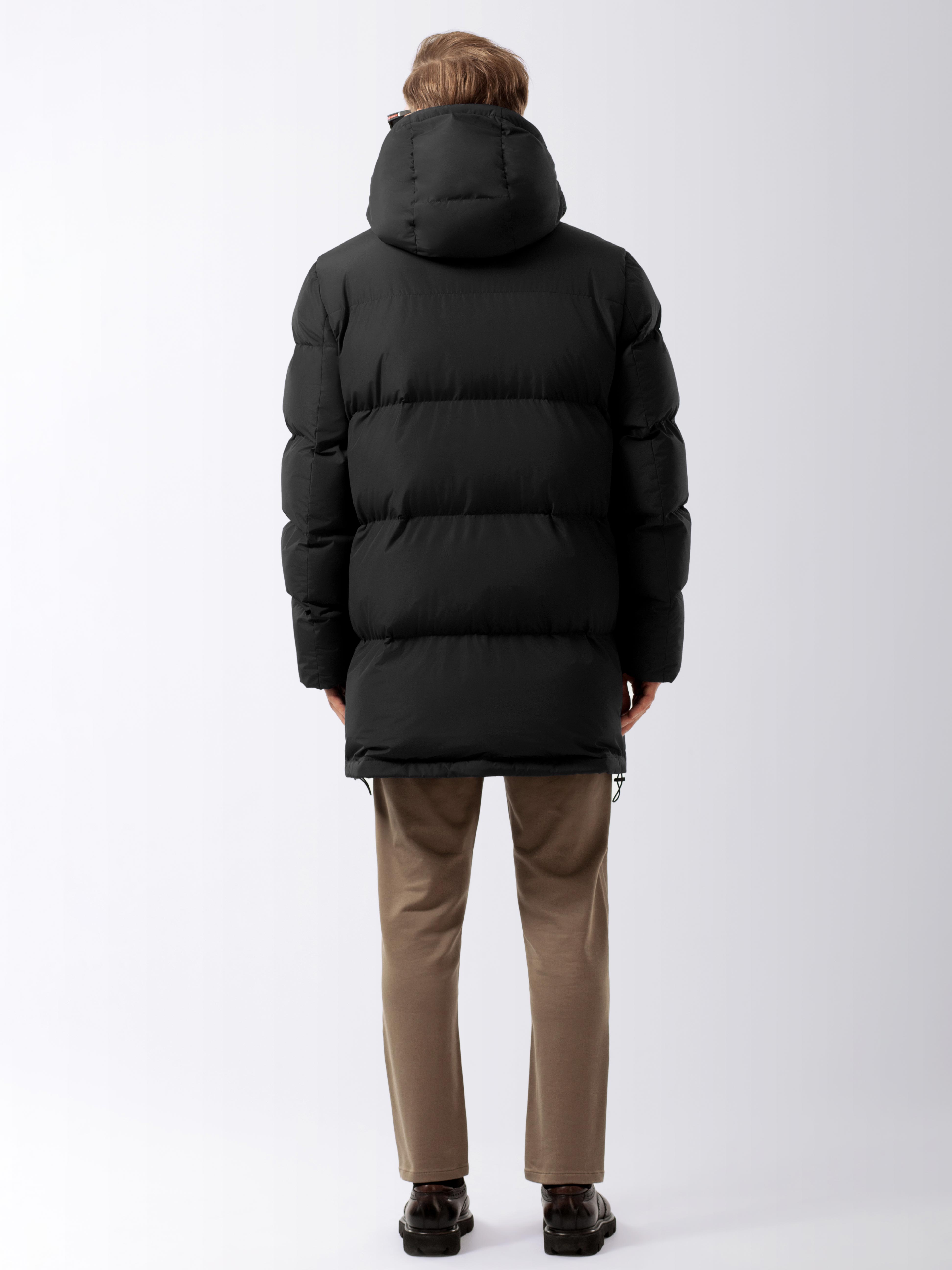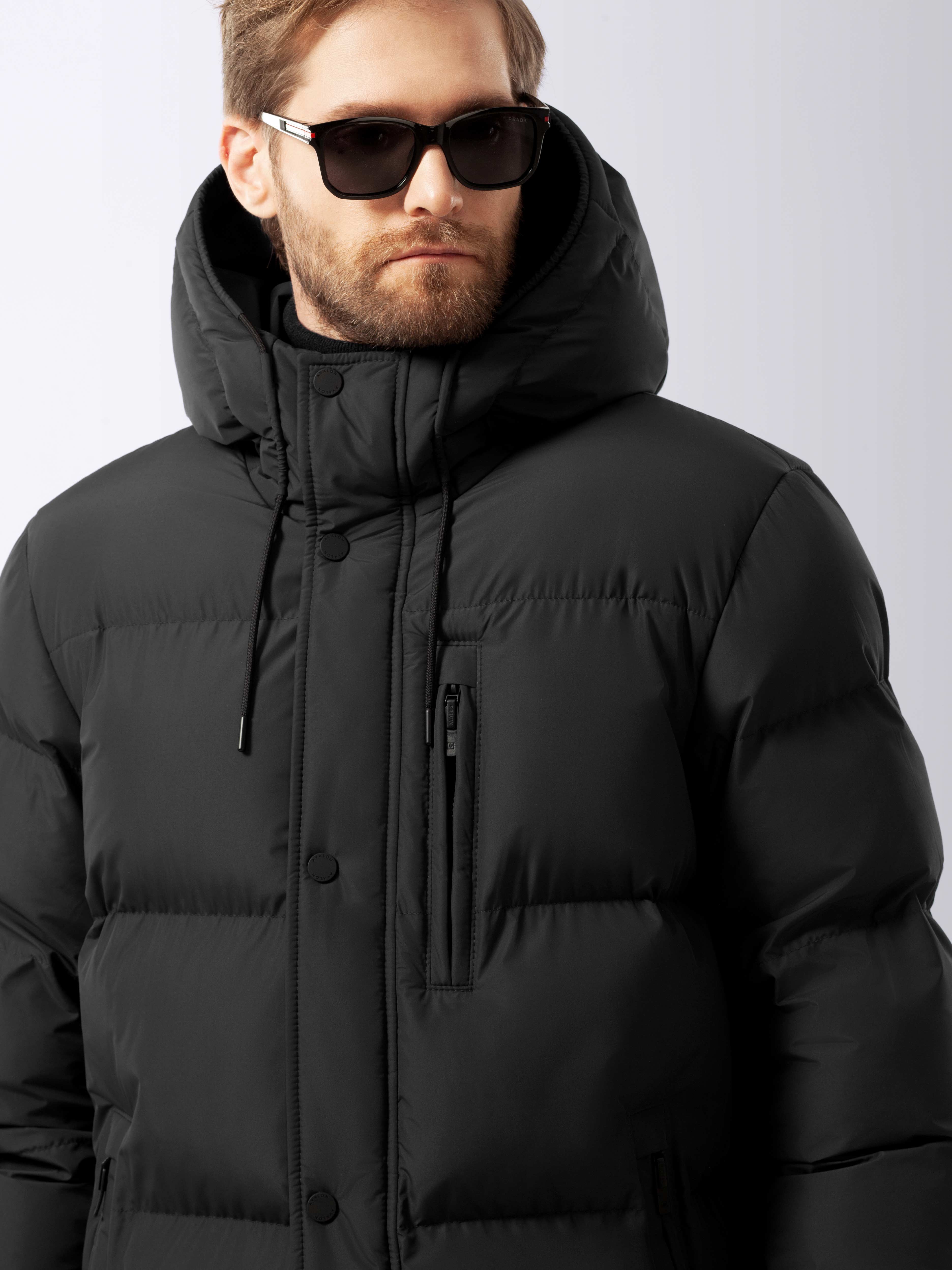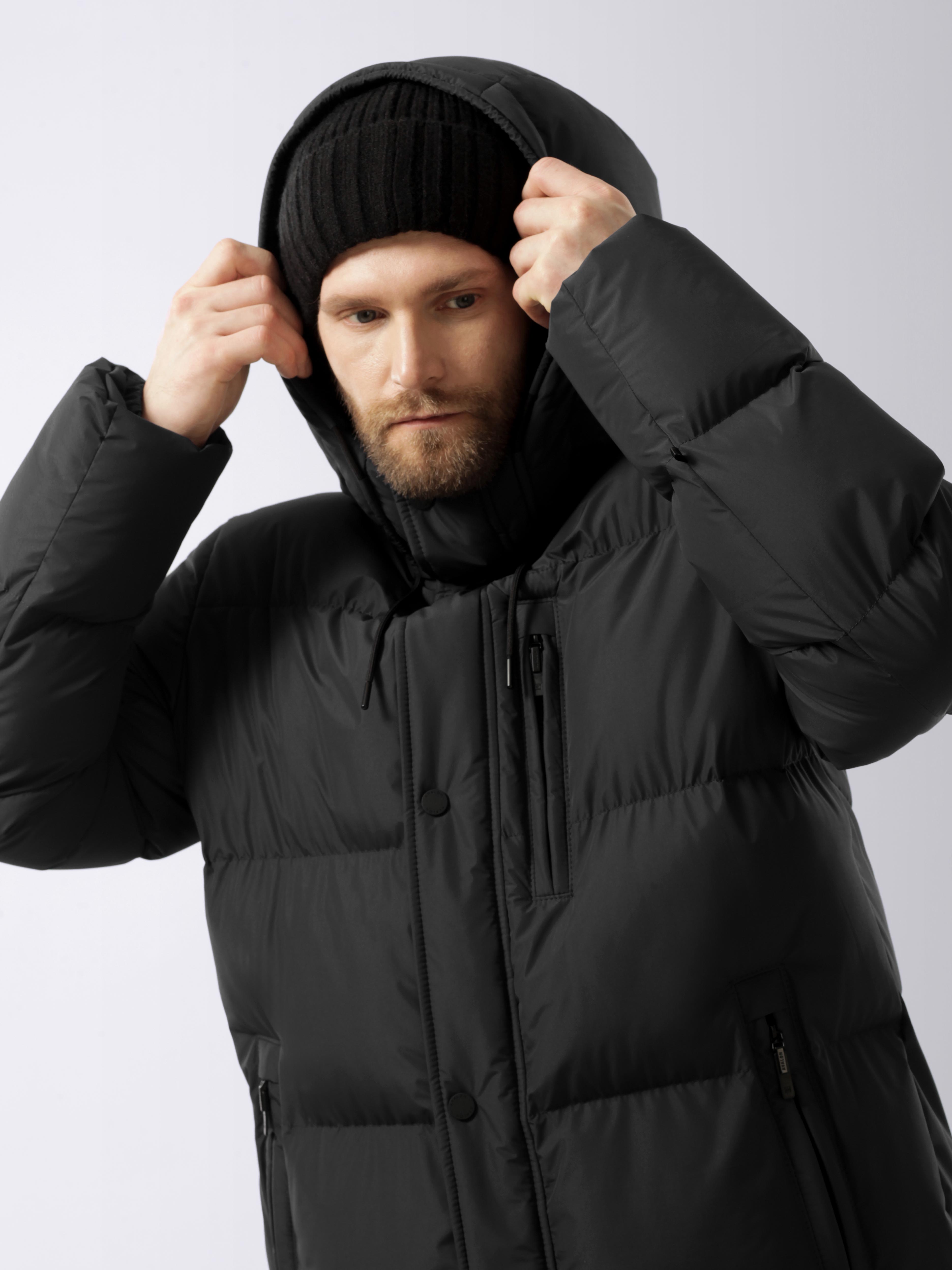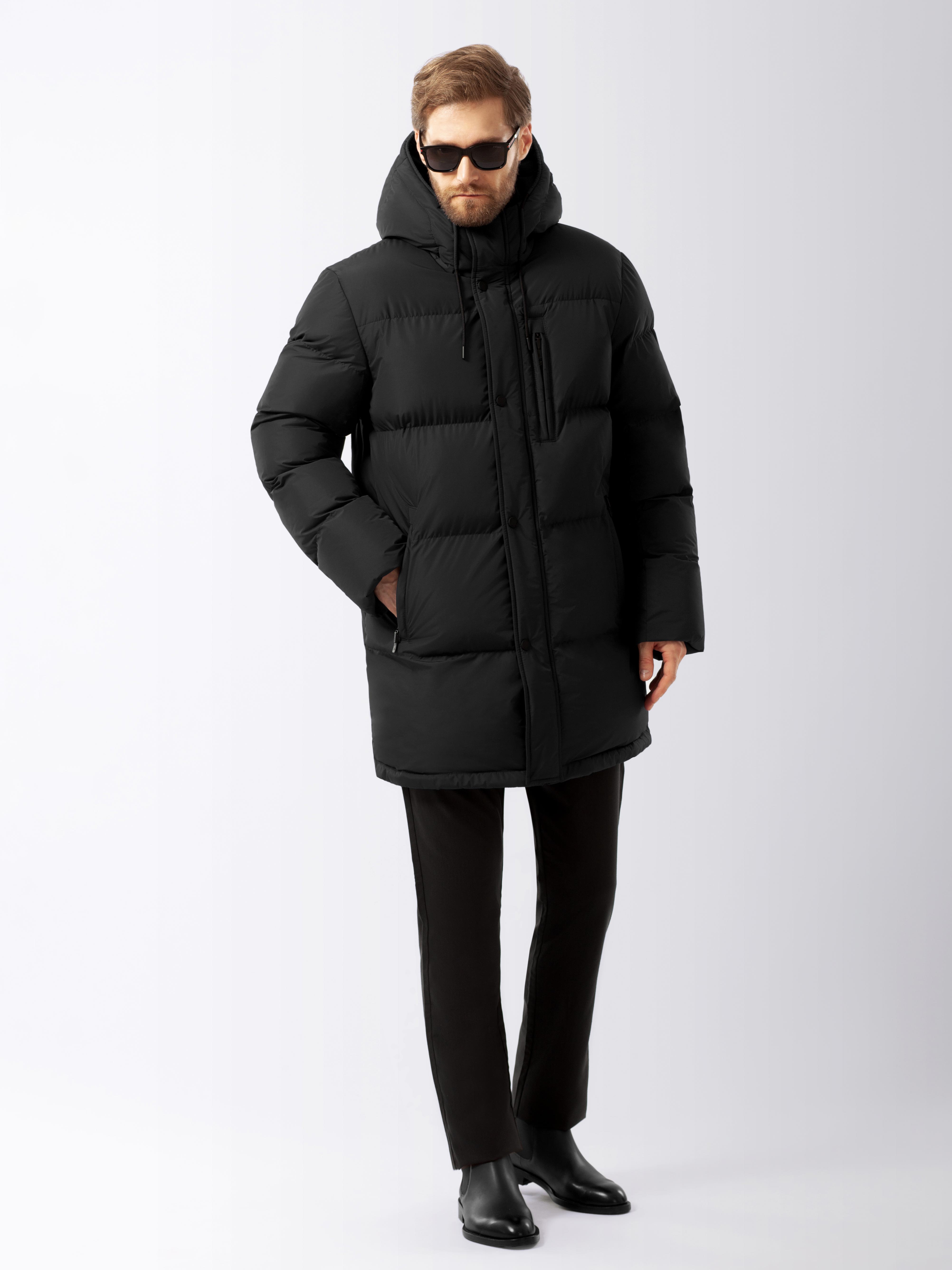 Пуховик мужской зимний из плотной плащевой ткани утеплен надёжным слоем био-пуха высокого качества. Удлинённая куртка прямого кроя, с классическим воротником-стойкой, удобной застёжкой на молнии и фирменные кнопки. Втачной покрой рукава. Стильный пуховик с капюшоном имеет удобные карманы на молниях, мешковины карманов выполнены из мягкого эко меха. Застёжка по борту на молнию и фирменные кнопки. Ветрозащитная планка вдоль молнии способствует сохранению тепла внутри пуховика.