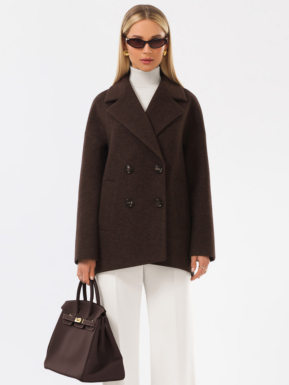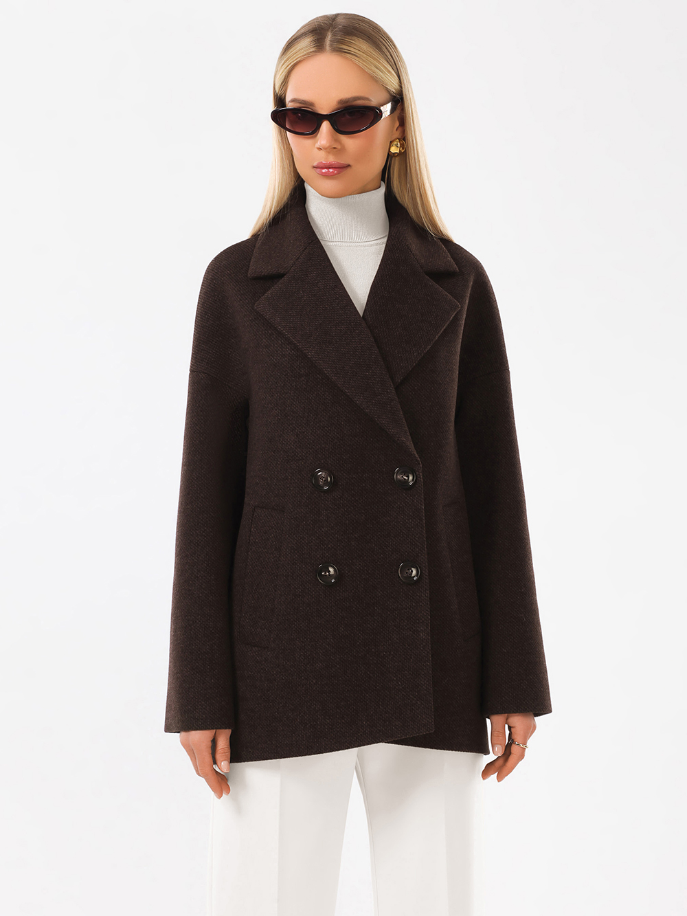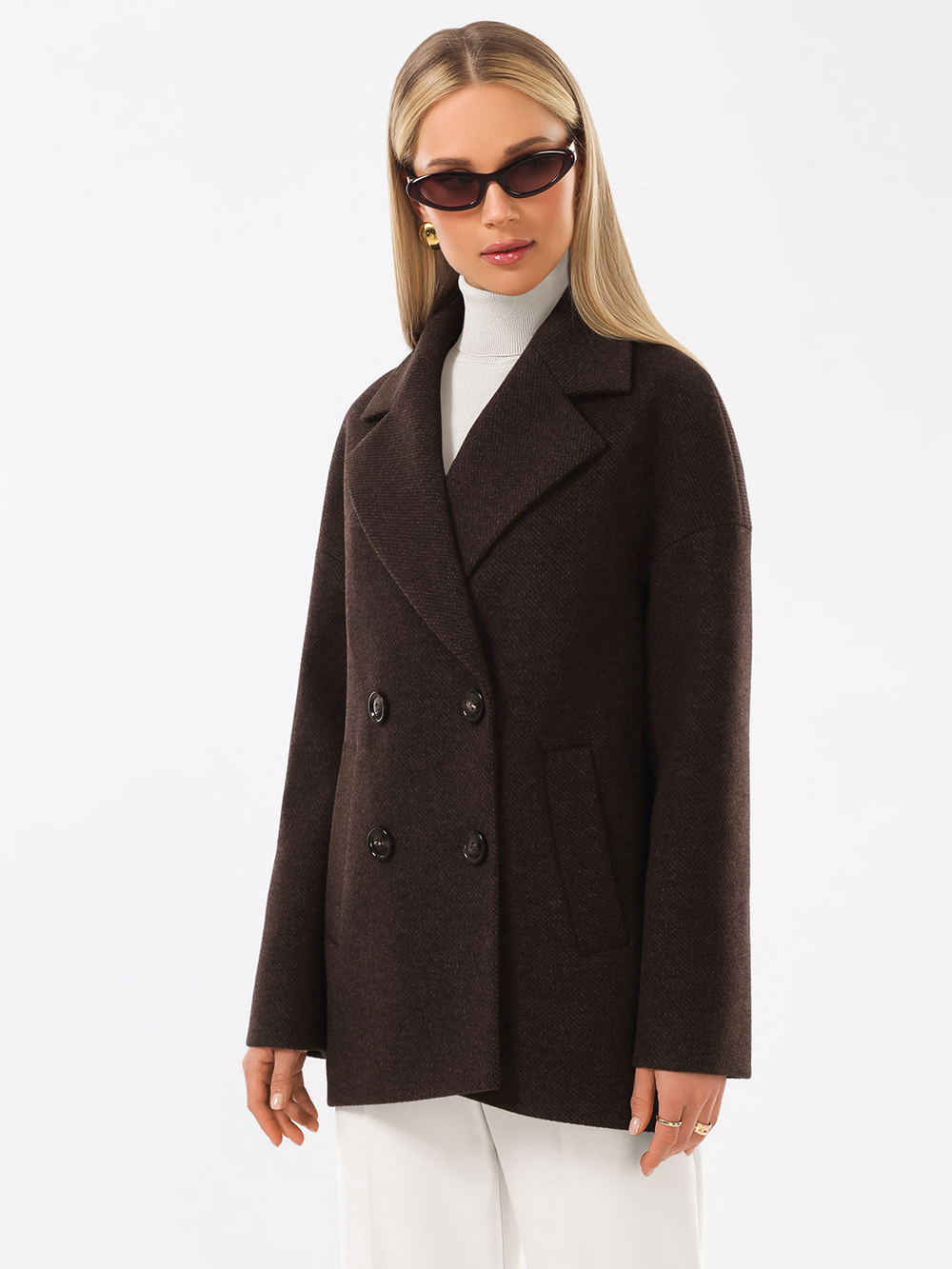 Модное короткое пальто из мягкой шерстяной ткани в твидовом переплетении. Свободный, зауженный книзу силуэт и асимметричная длина (полочка чуть короче спинки) создают утонченный, но динамичный образ. В мягком покрое рукава предусмотрена ромбовидная ластовица, что гарантирует комфорт и удобство при движении. Застежка на пуговицы, удобные карманы - листочки, английский воротник с четкой линией обрезки. Размер рекомендовано подбирать по бОльшему показателю - либо по объёму груди, либо по бёдрам. Температурный режим носит рекомендательный характер до +5 °C, далее все зависит от индивидуальной переносимости температур.