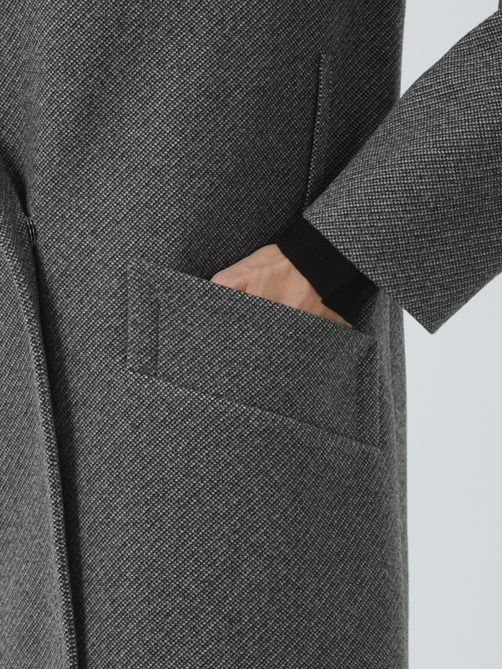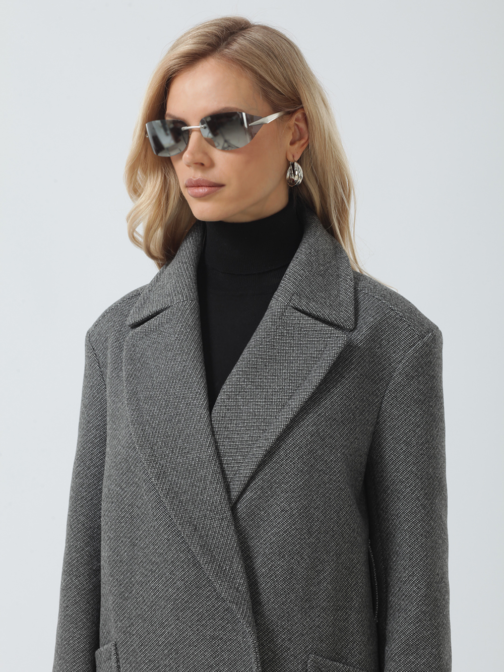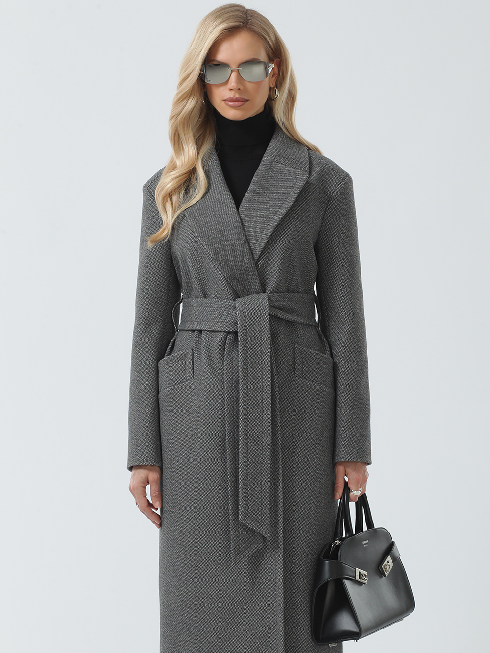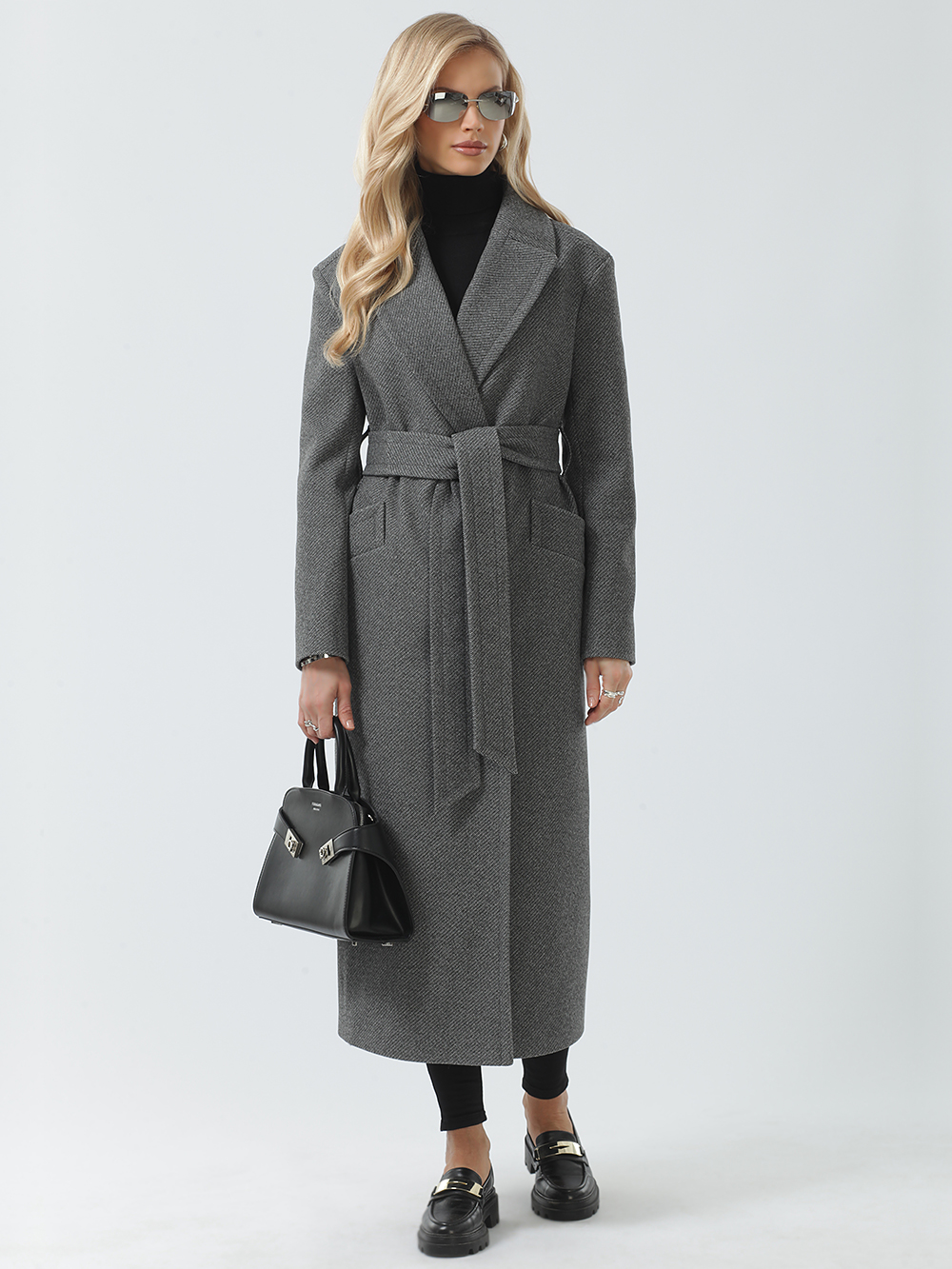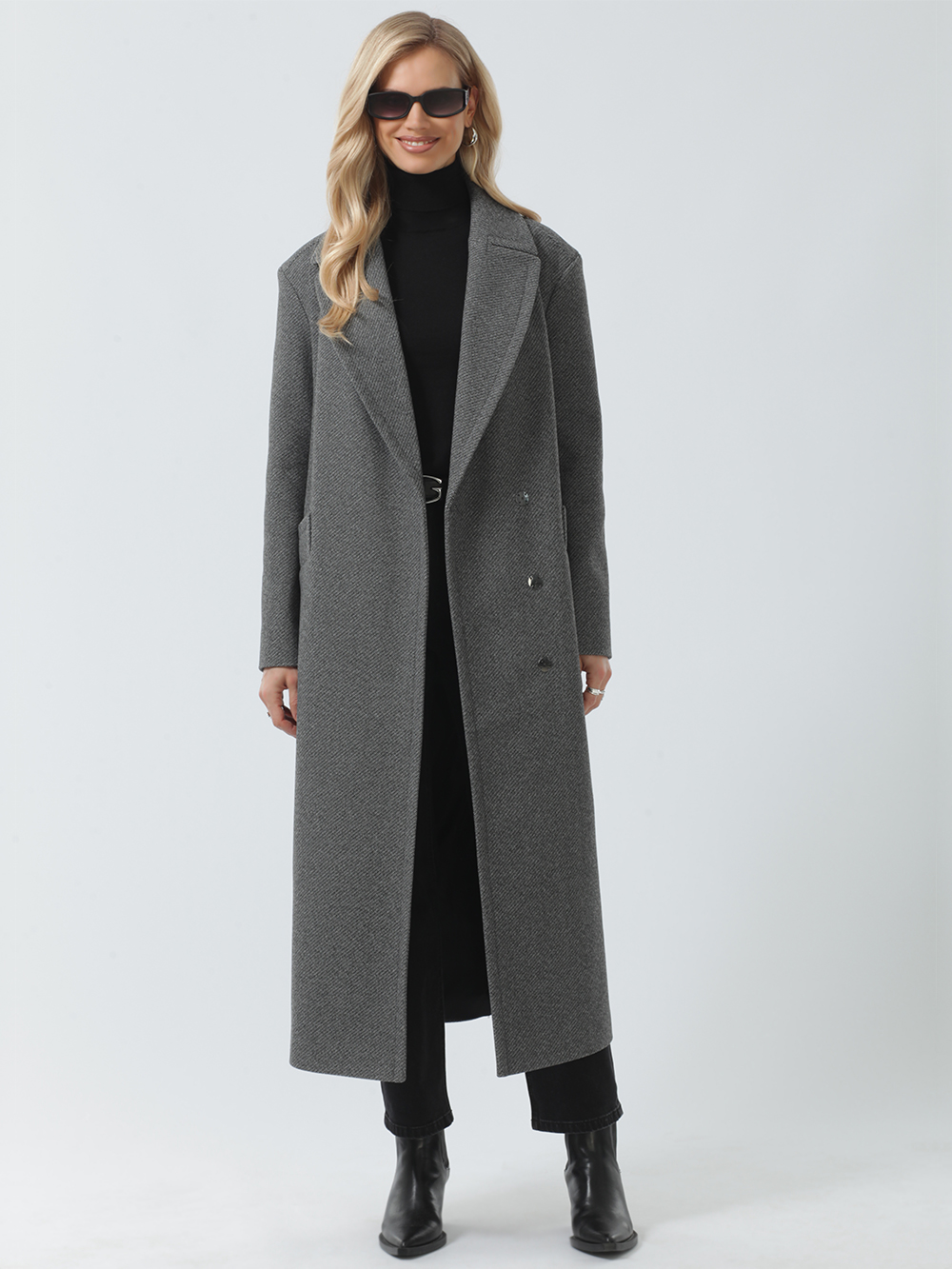 Модное пальто c длиной макси из плотной фактурной ткани. Прямой силуэт, спокойный крой. Немного заниженная линия проймы. Втачные кокетки имитируют погоны, подчеркивая плавную линию плеч. Английский воротник. Застежка на пришивные кнопки, удобные прорезные карманы с листочками. Шлица в среднем шве спинки. Пояс в комплекте. Пальто декорировано отделочными строчками.