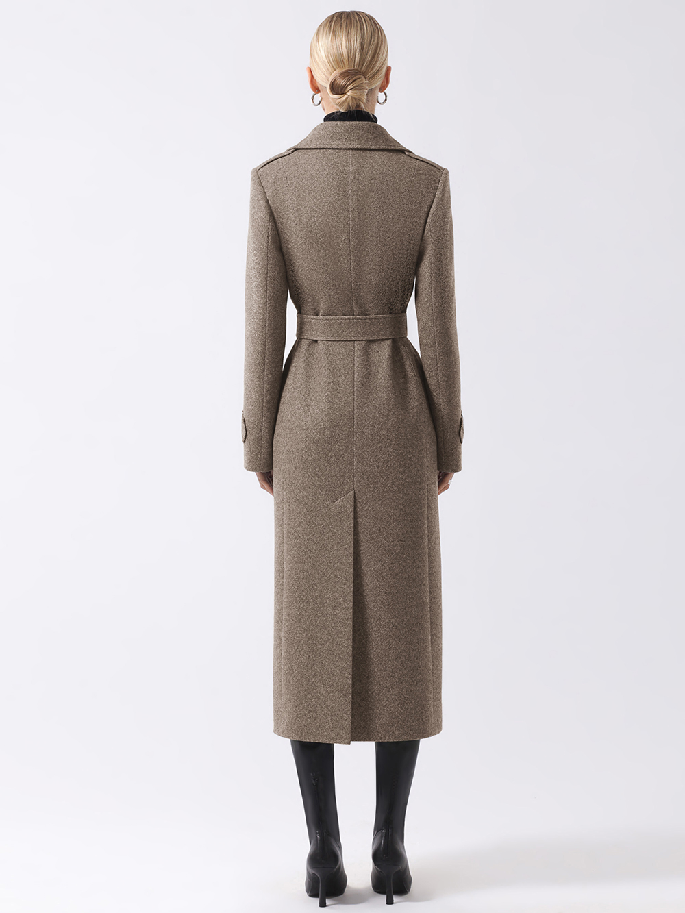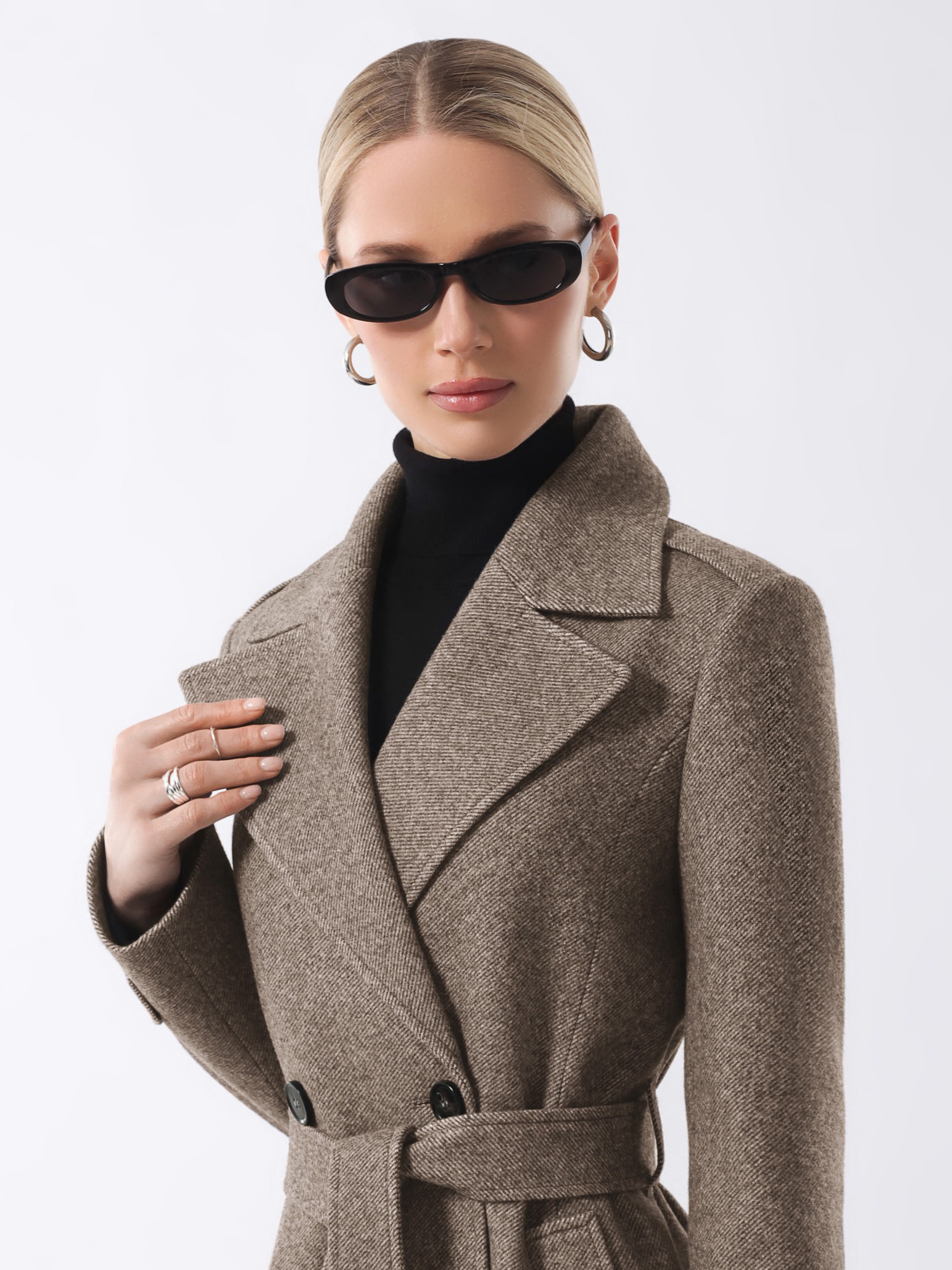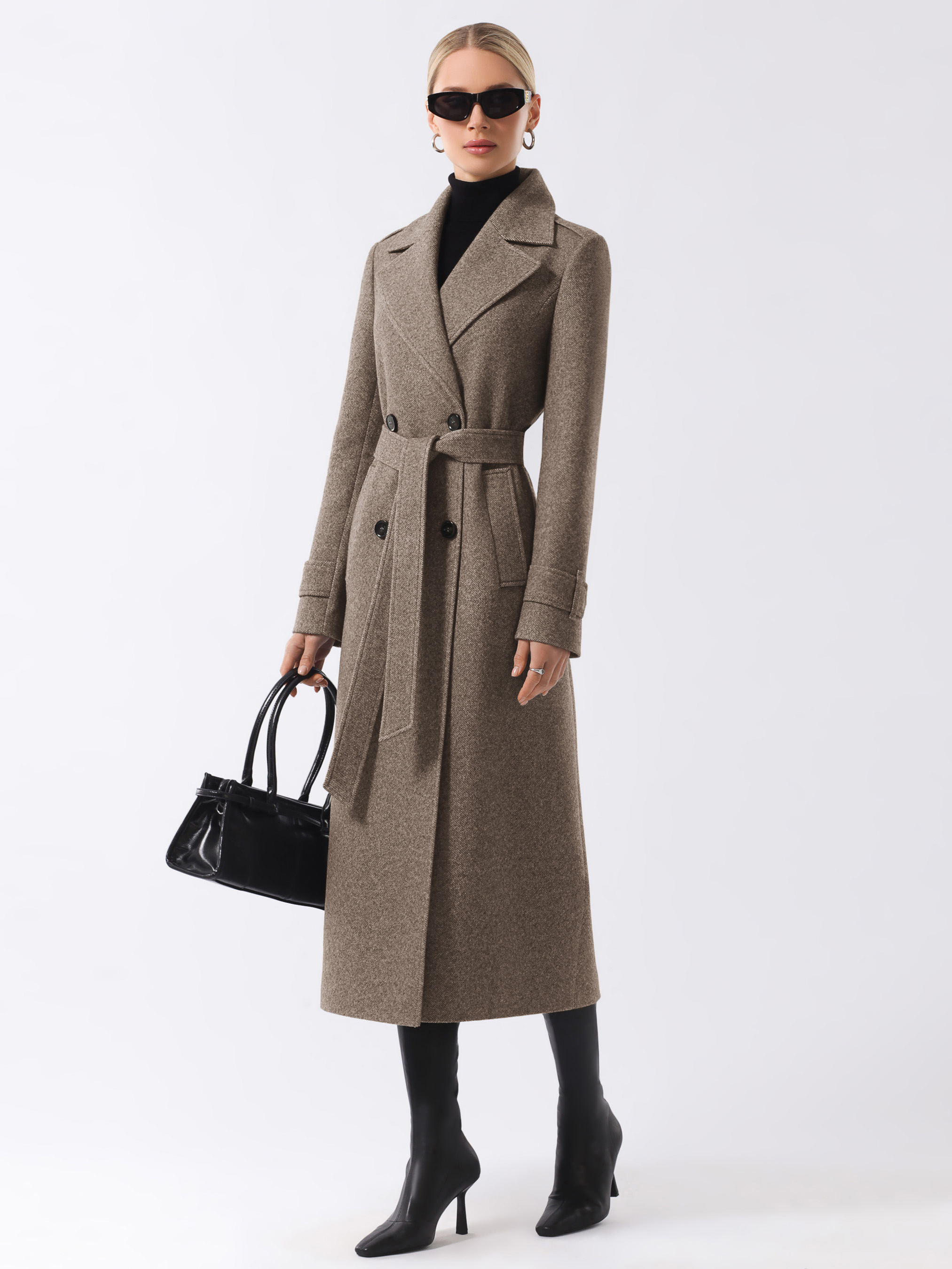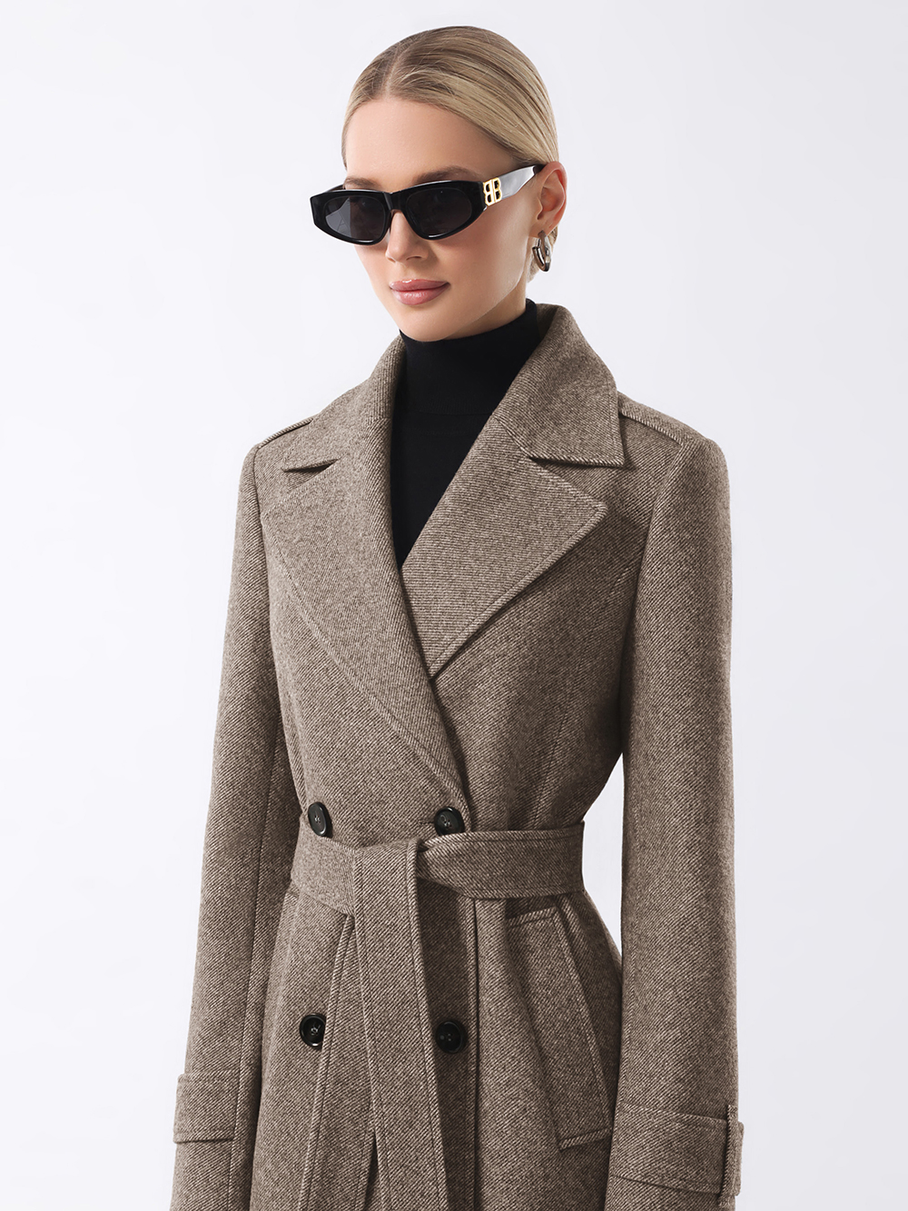 Трендовый двубортный тренч в длине макси. Пальто выполнено из фактурной ткани в диагональ. Полуприлегающий силуэт, лаконичный крой. Втачные погоны и паты подчеркивают стиль. Комфортные втачные рукава. Английский воротник с модными широкими лацканами. Удобные карманы - листочки, застежка на фирменные пуговицы. Шлица в среднем шве спинки. Пальто декорировано отделочными строчками.