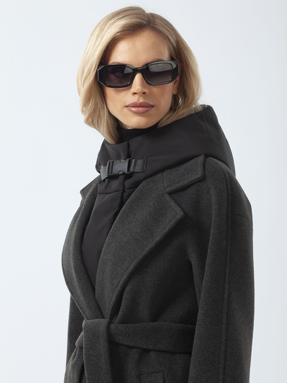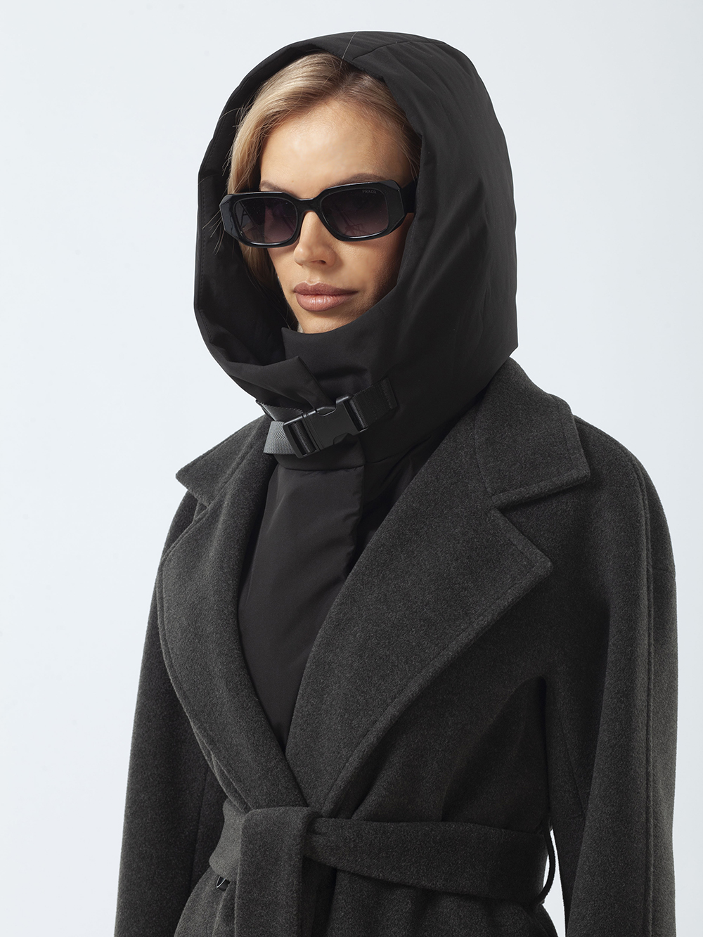 Актуальный лаконичный крой. Плавная линия плеча, комфортные комбинированные рукава с возможностью отворотов. Воротник – невысокая стойка – раскладывается в английский. Съёмная манишка с капюшоном из плотной плащевой ткани на утеплителе. Манишка фиксируется на пуговицы, застёгивается с помощью пряжки – фастекс на тесьме. Удобные карманы - листочки, застежка на фирменные пуговицы. Шлица в среднем шве спинки.