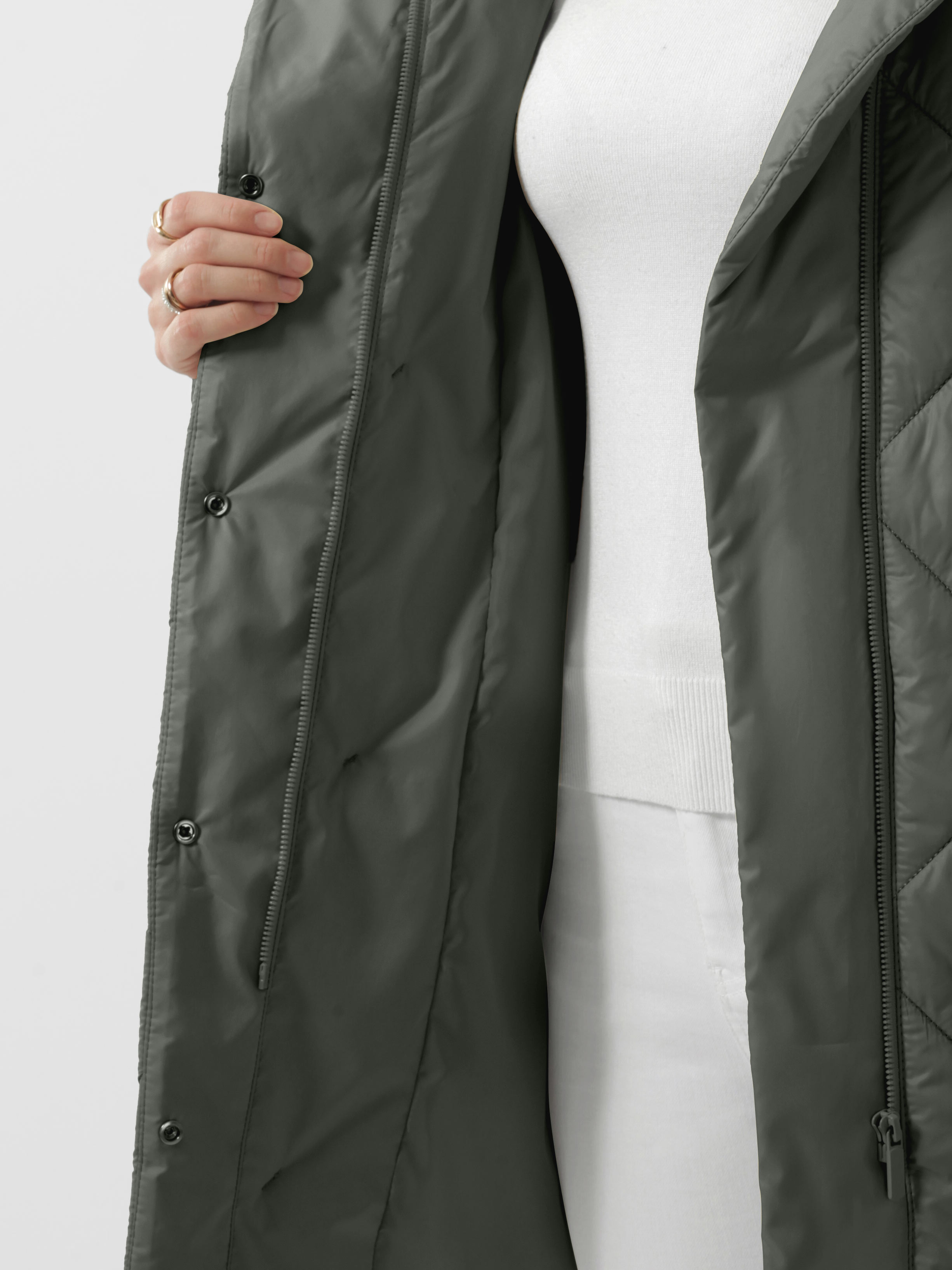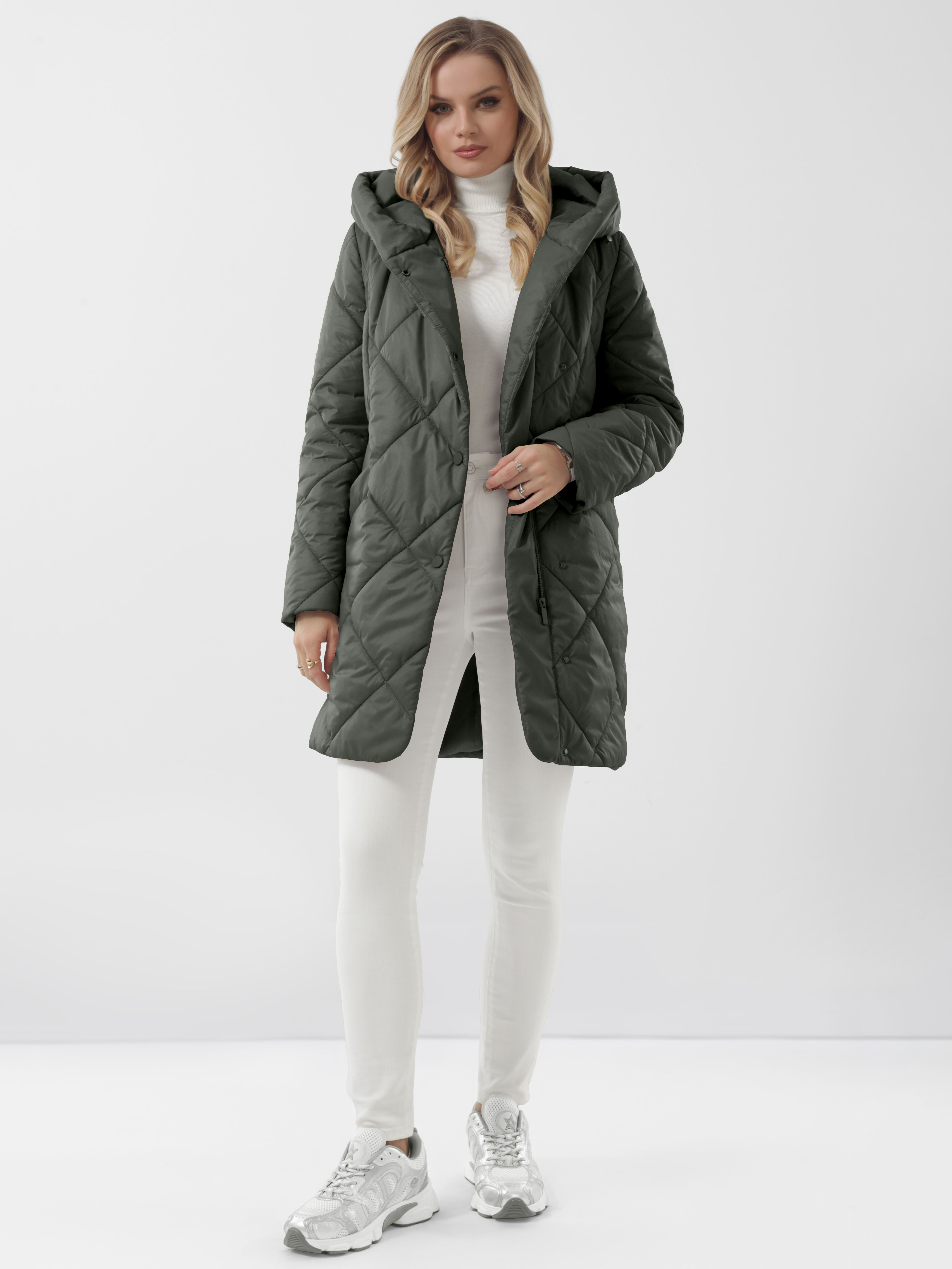 Классические втачные рукава с возможностью отворота. Красивый современный капюшон с утягивающей кулиской на фиксаторах. Карманы прорезные с листочками. Надежная застежка на установочные кнопки и молнию.
