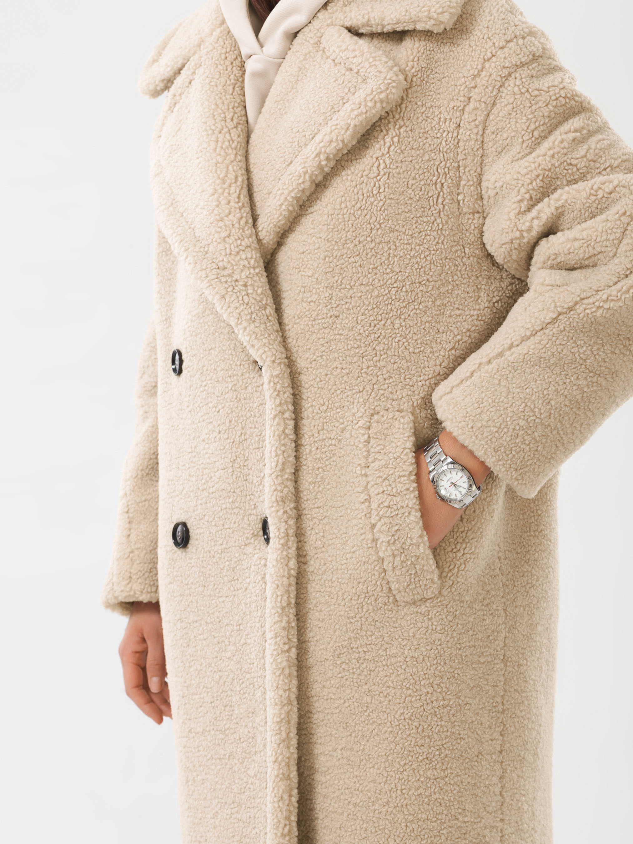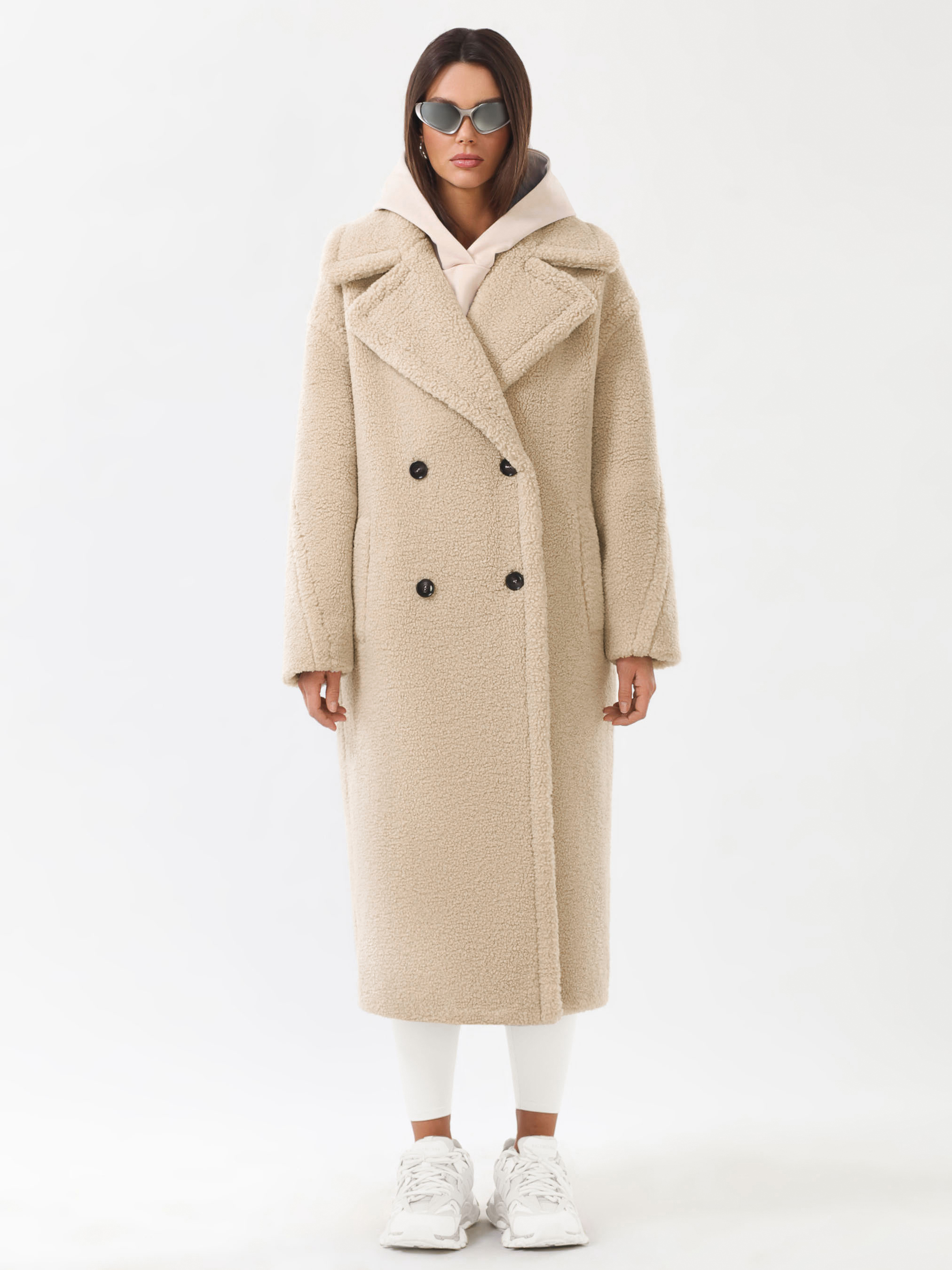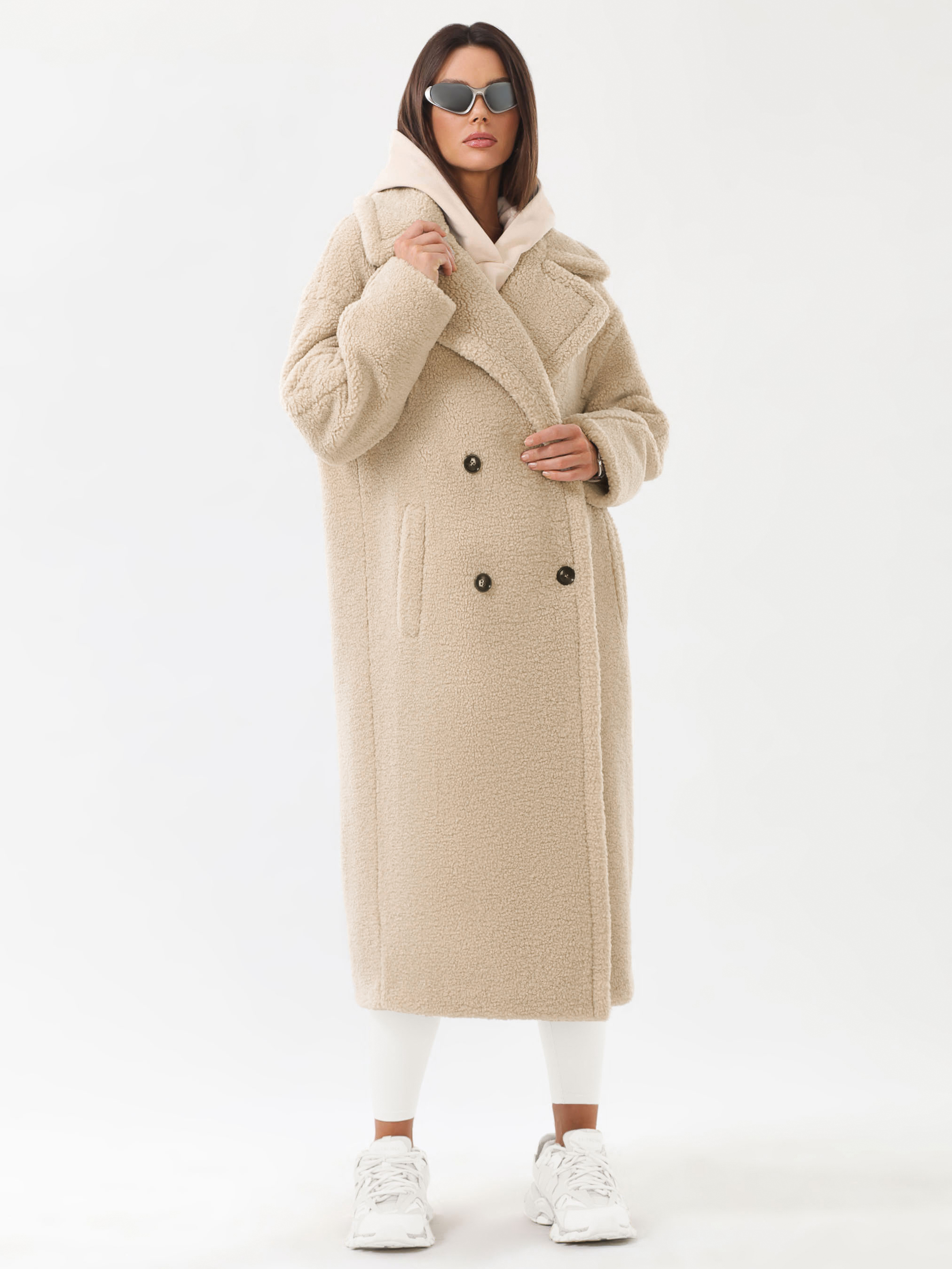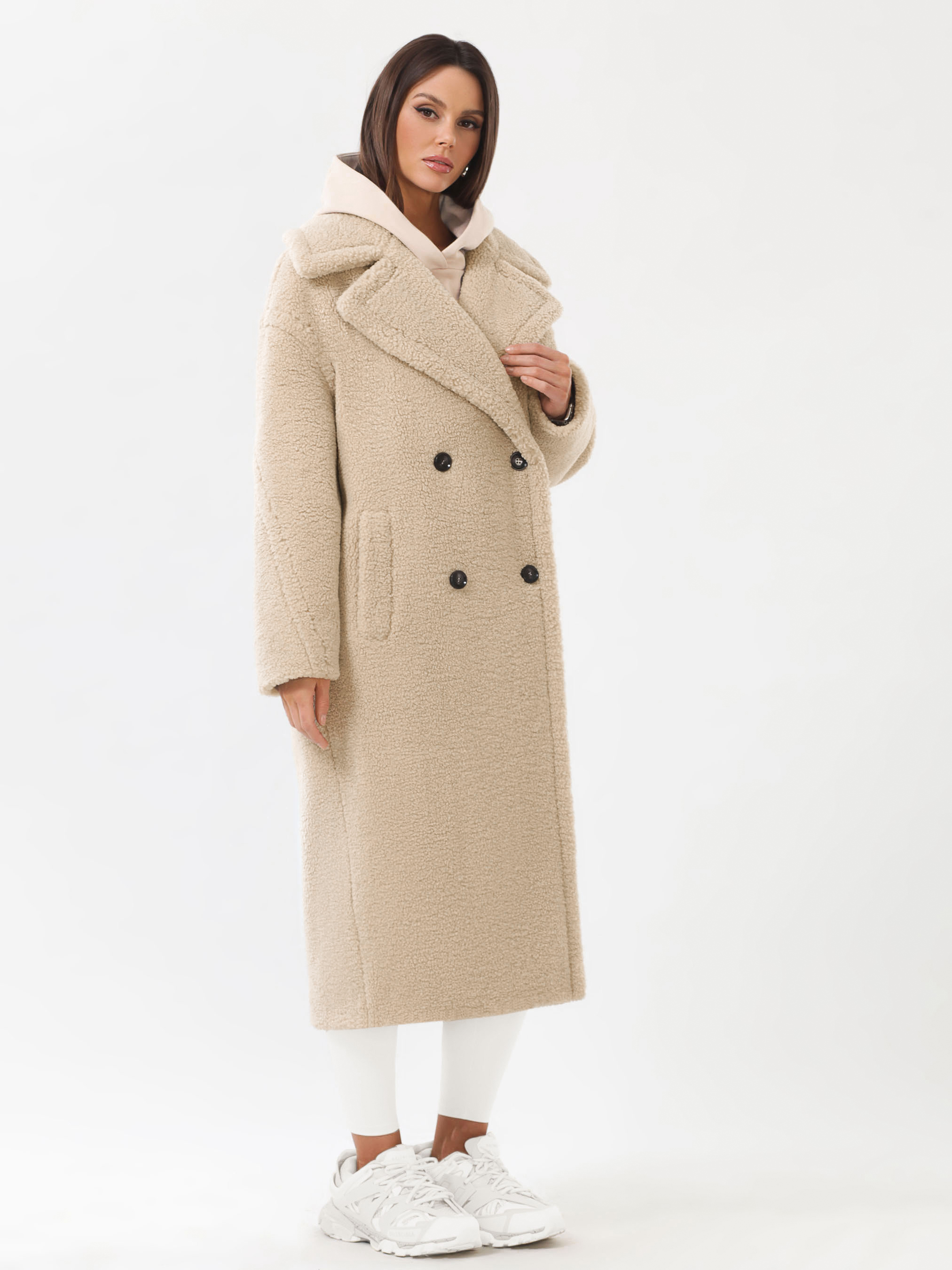 Длинная модная шуба из качественной имитации натуральной овчины с добавлением шерсти. Длина изделия 115,0 см. Модель утеплена легким слоем синтепона. Шубка свободного силуэта, с плавной линией плеча. Рубашечный покрой рукава с углубленной проймой и с фигурной резкой. Классический английский воротник с магнитом в лацкане.