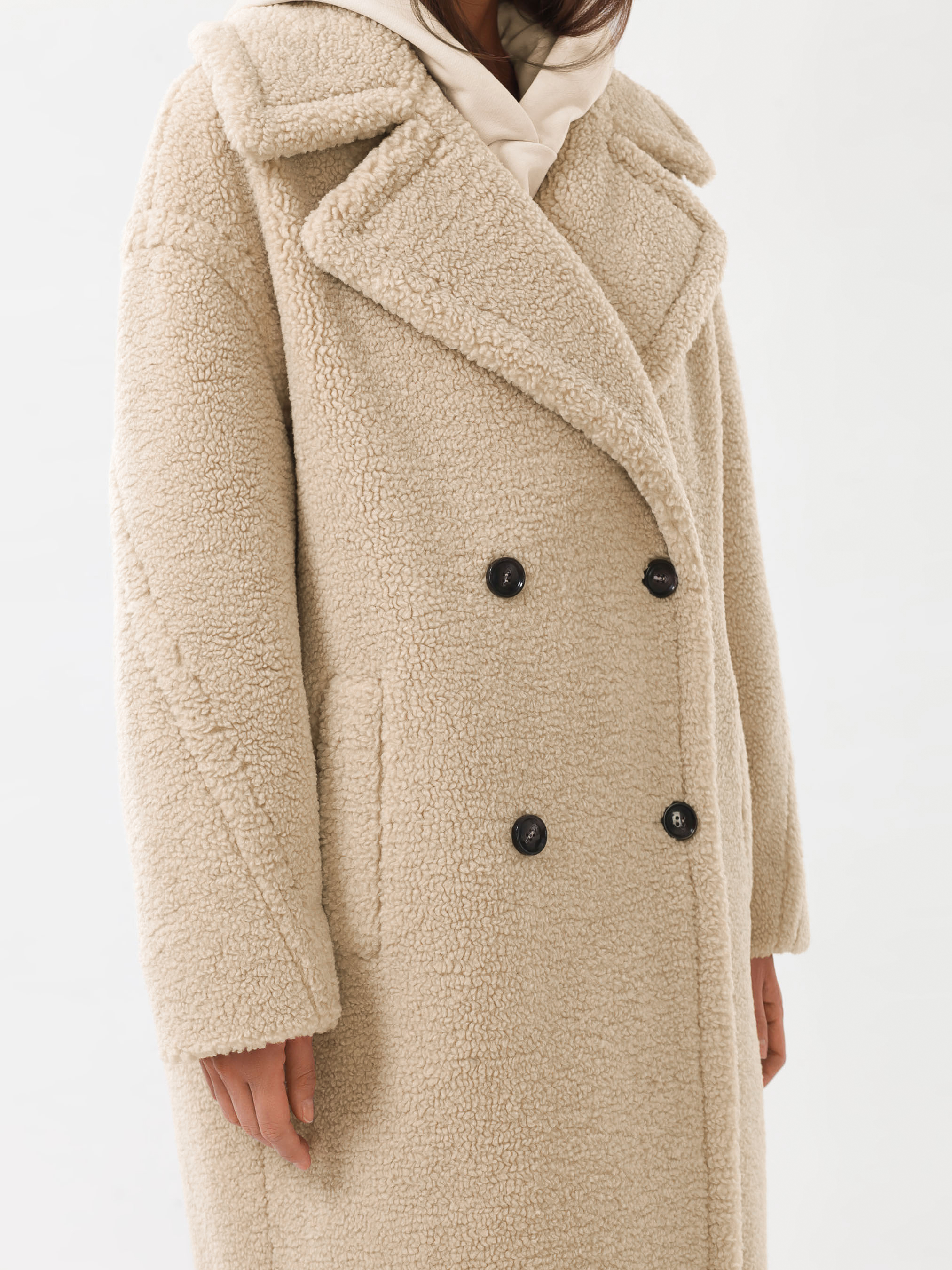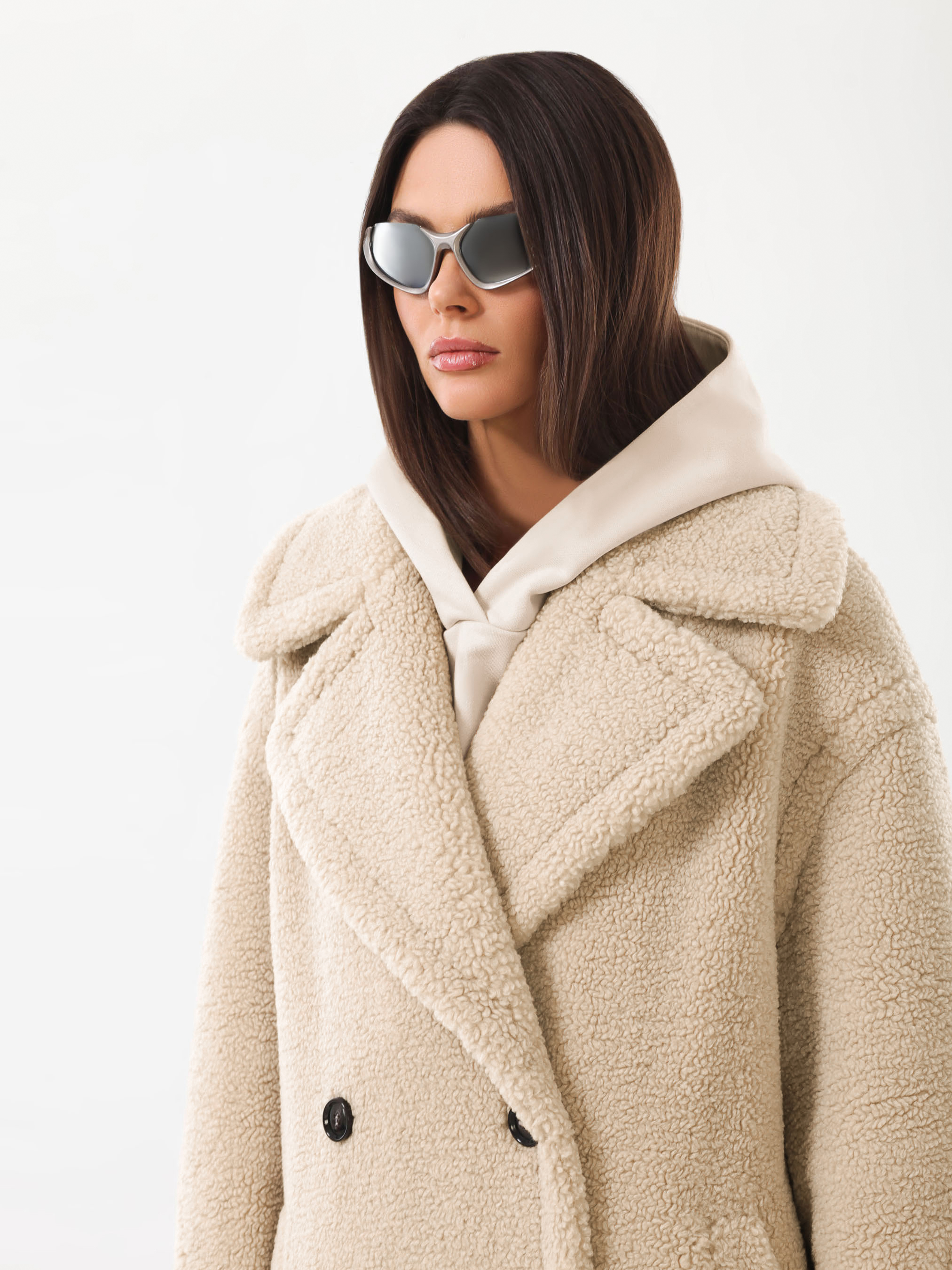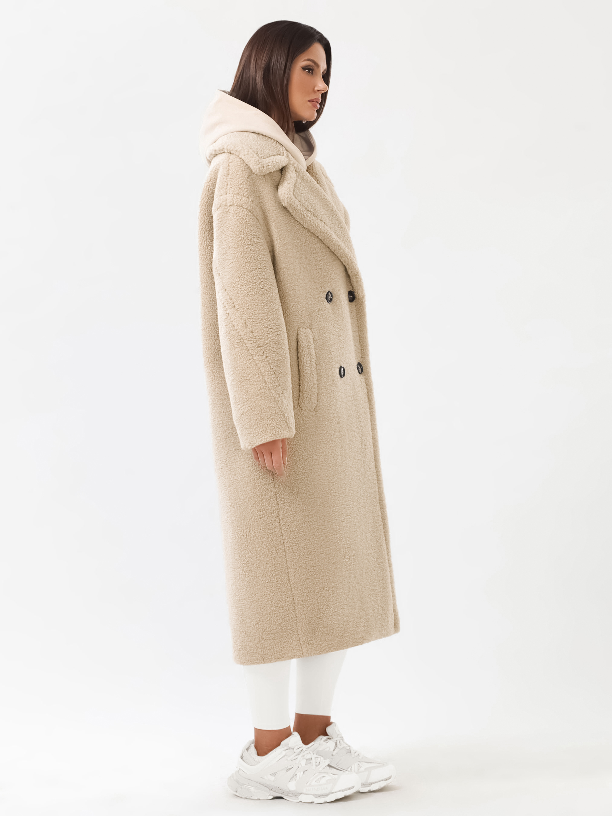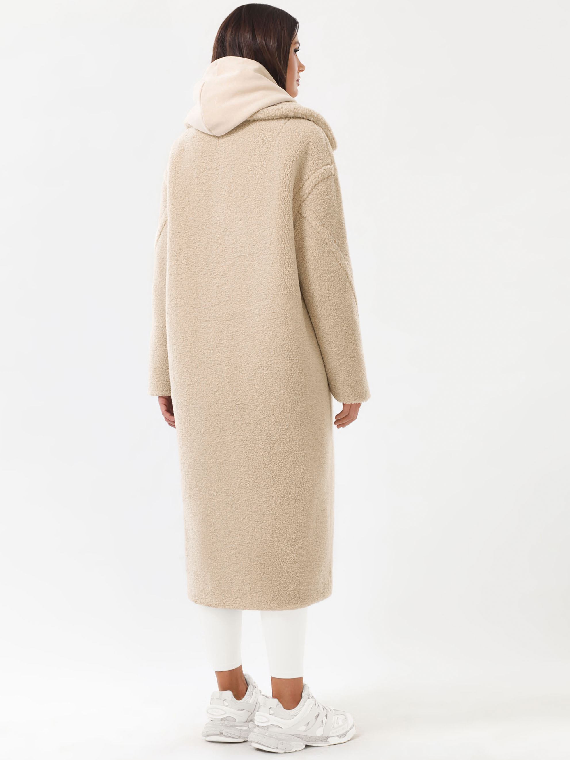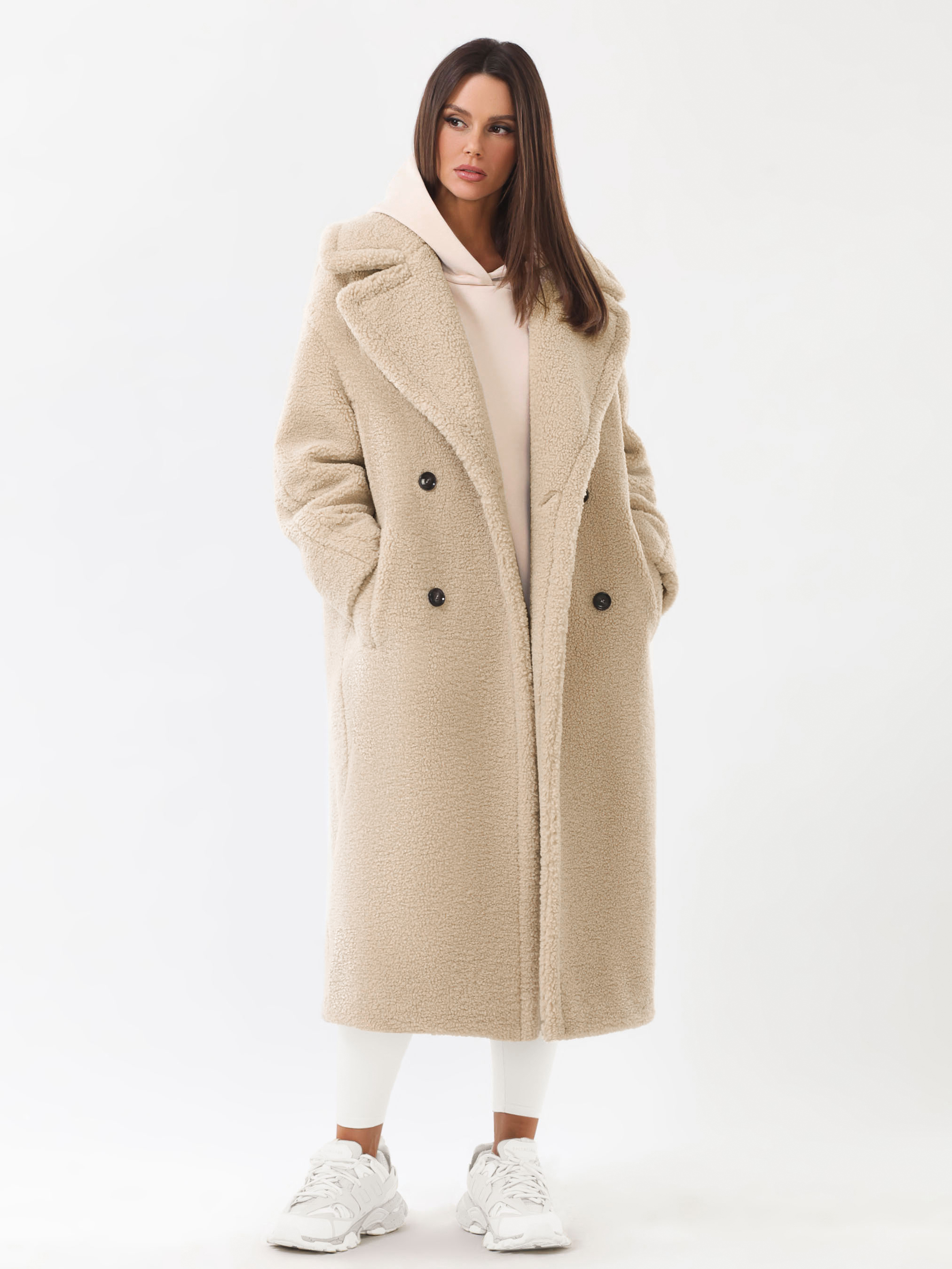 Длинная модная шуба из качественной имитации натуральной овчины с добавлением шерсти. Длина изделия 115,0 см. Модель утеплена легким слоем синтепона. Шубка свободного силуэта, с плавной линией плеча. Рубашечный покрой рукава с углубленной проймой и с фигурной резкой. Классический английский воротник с магнитом в лацкане.