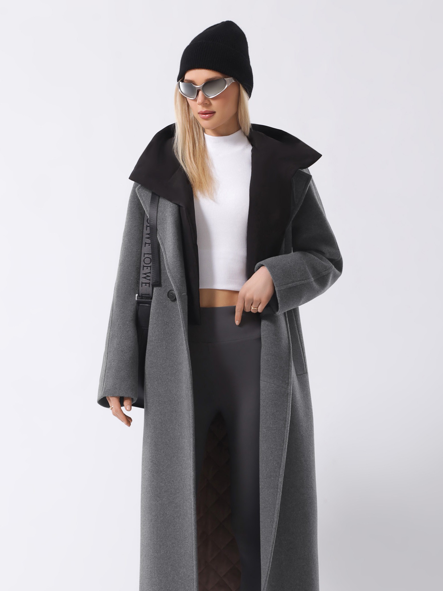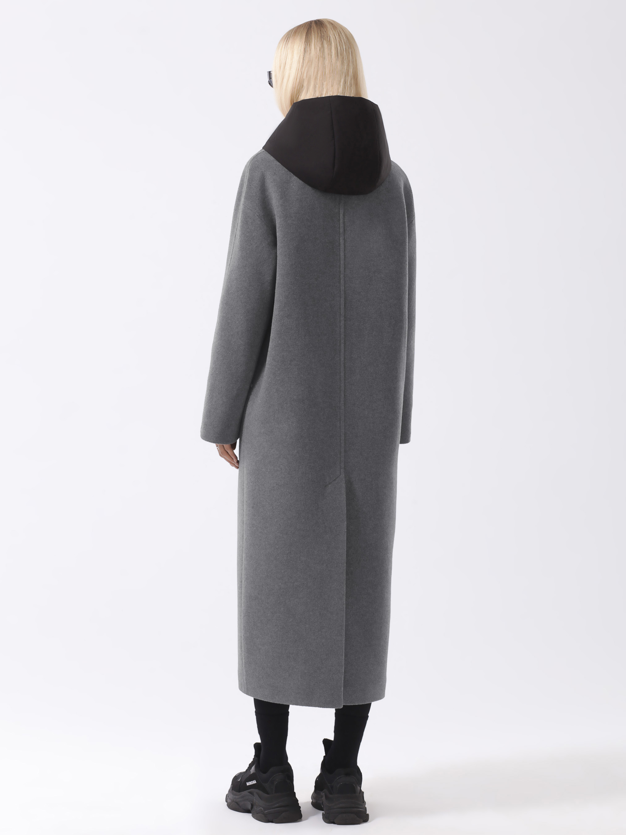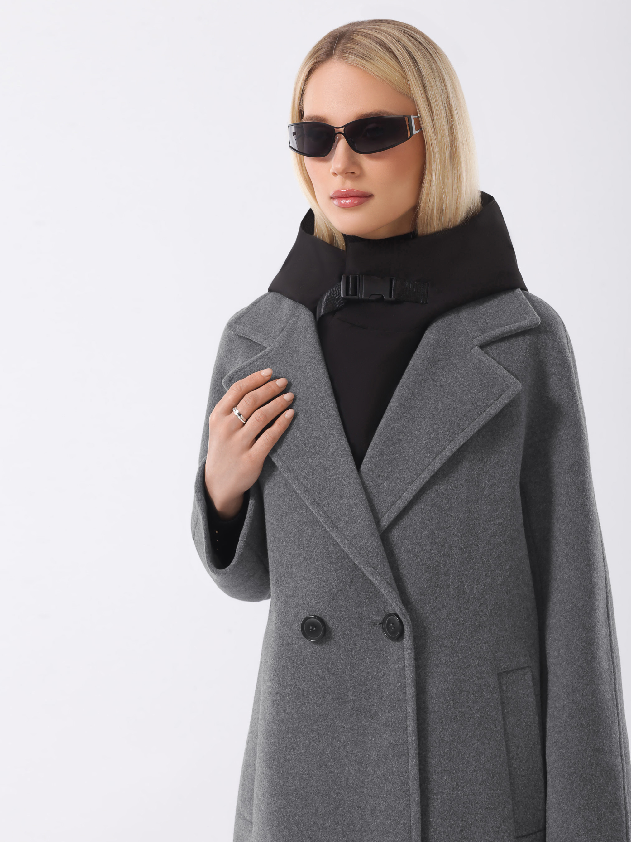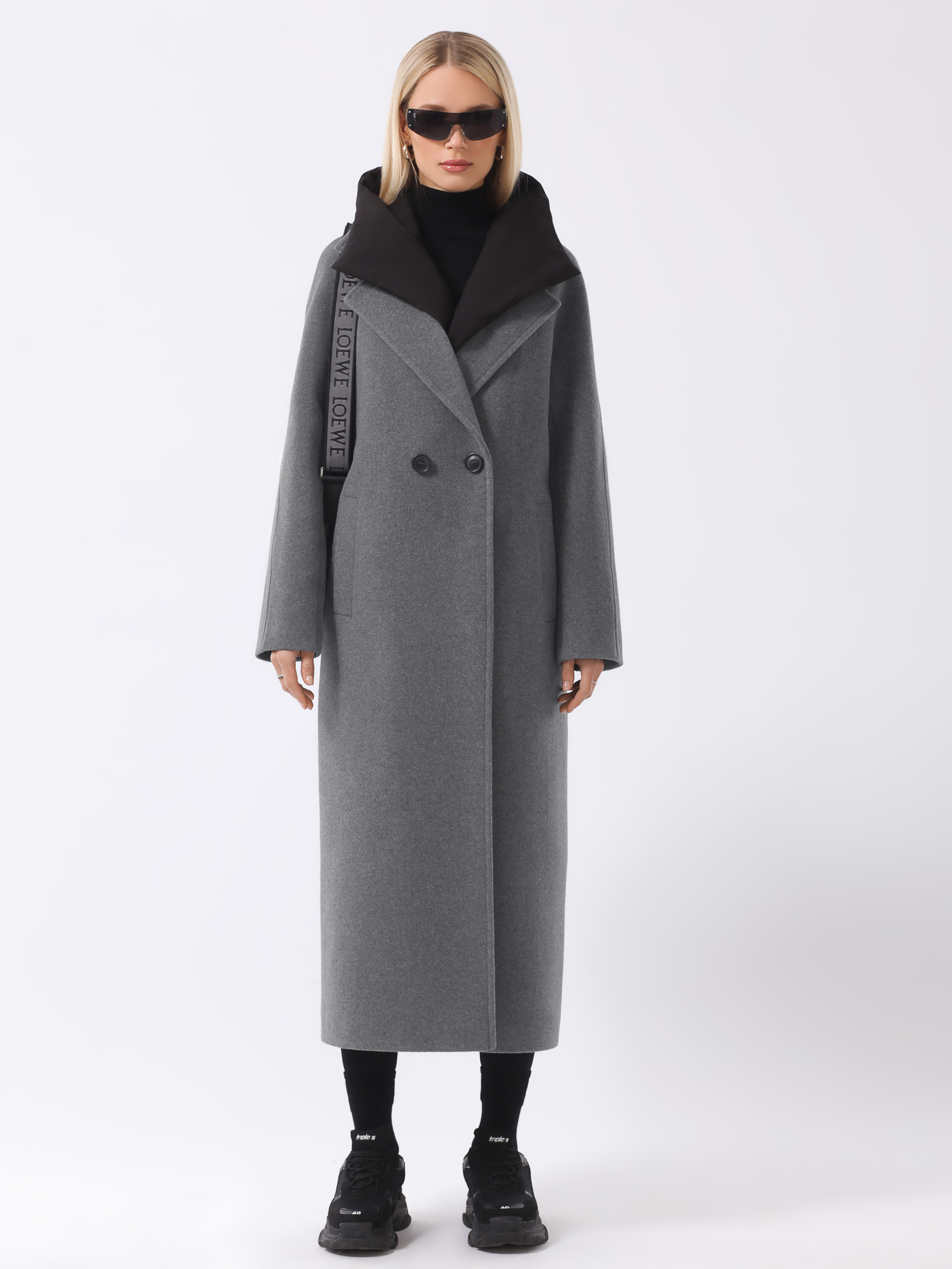 Шерстяное супермодное пальто в длине макси из высококачественного шерстяного драп-велюра. Модель свободного силуэта на стеганом с утеплителем подкладе. Актуальный лаконичный крой. Плавная линия плеча, комфортные комбинированные рукава с возможностью отворотов. Воротник – невысокая стойка – раскладывается в английский. Съёмная манишка с капюшоном из плотной плащевой ткани на синтепоне. Манишка фиксируется на пуговицы, застёгивается с помощью пряжки – фастекс на тесьме и магниты. Удобные карманы - листочки, застежка на фирменные пуговицы. Шлица в среднем шве спинки.