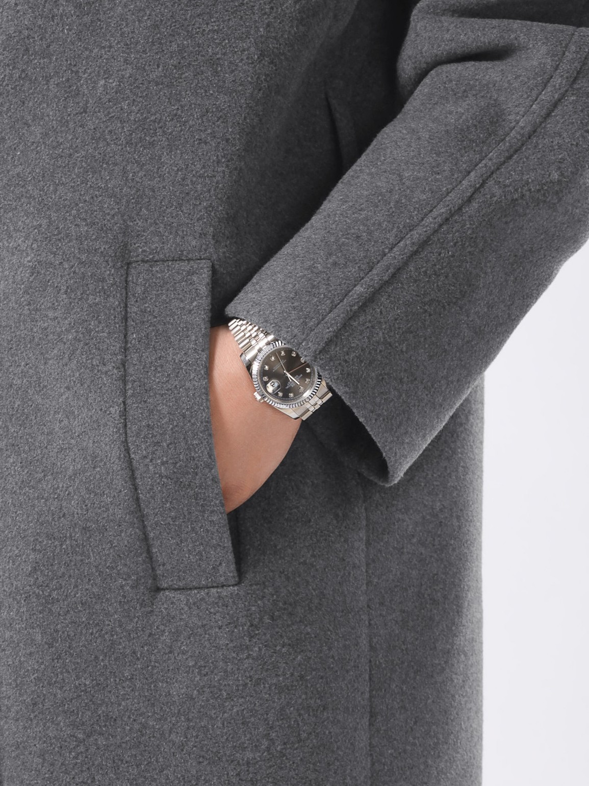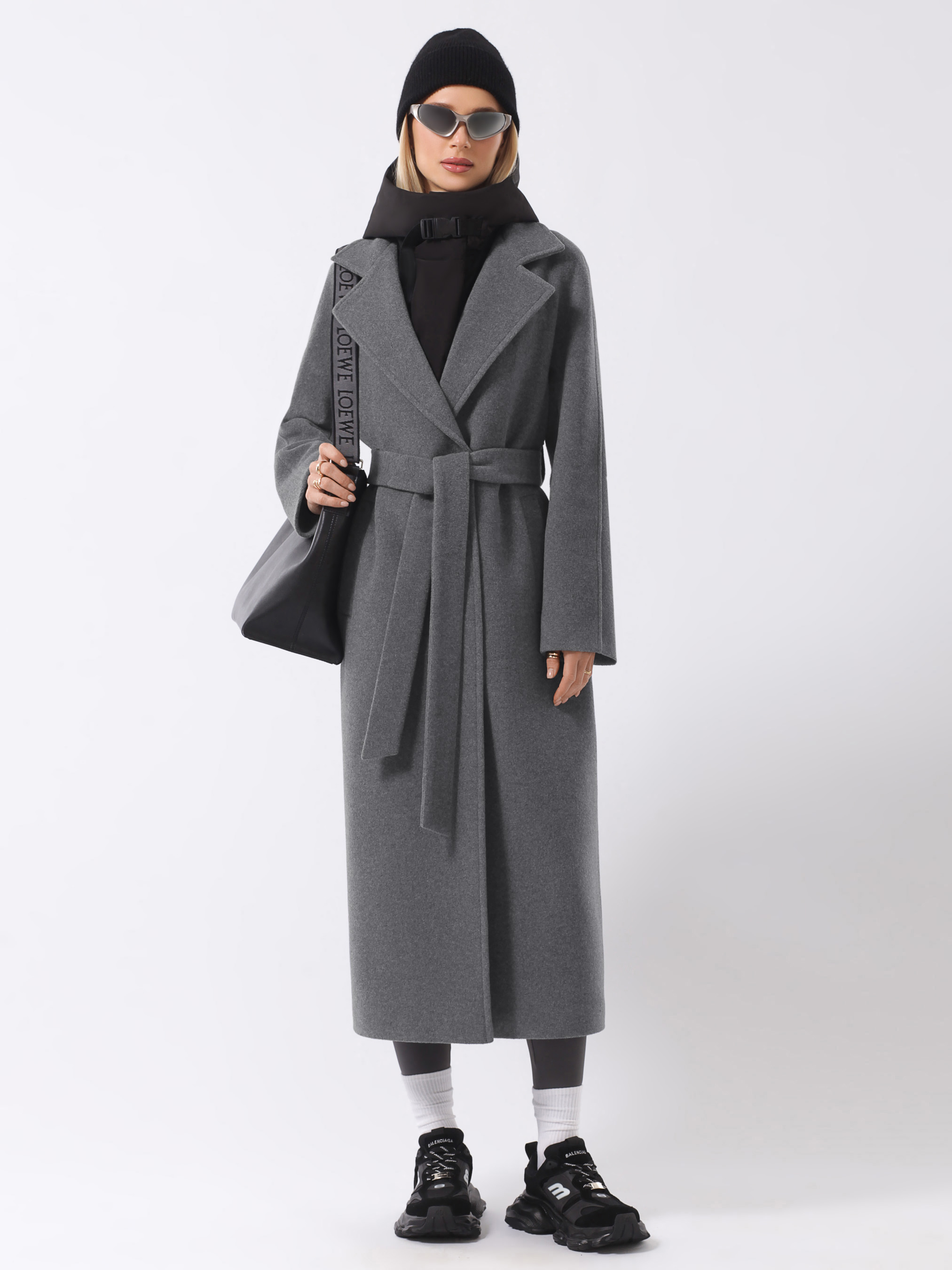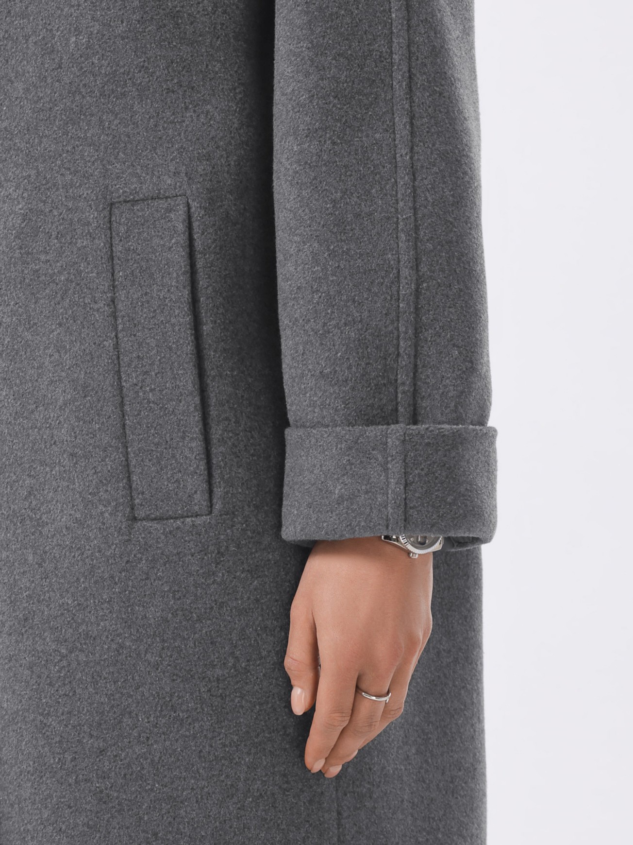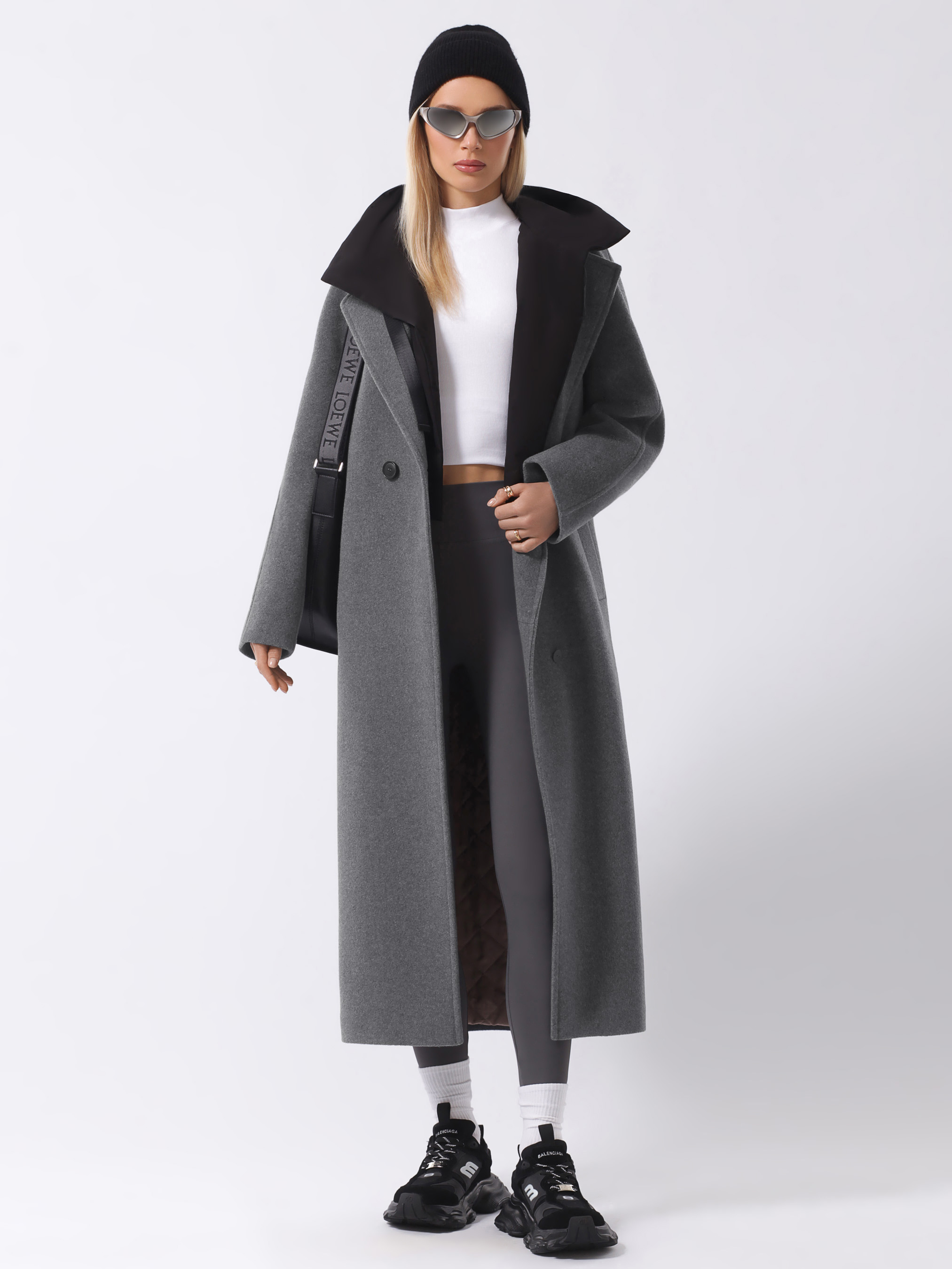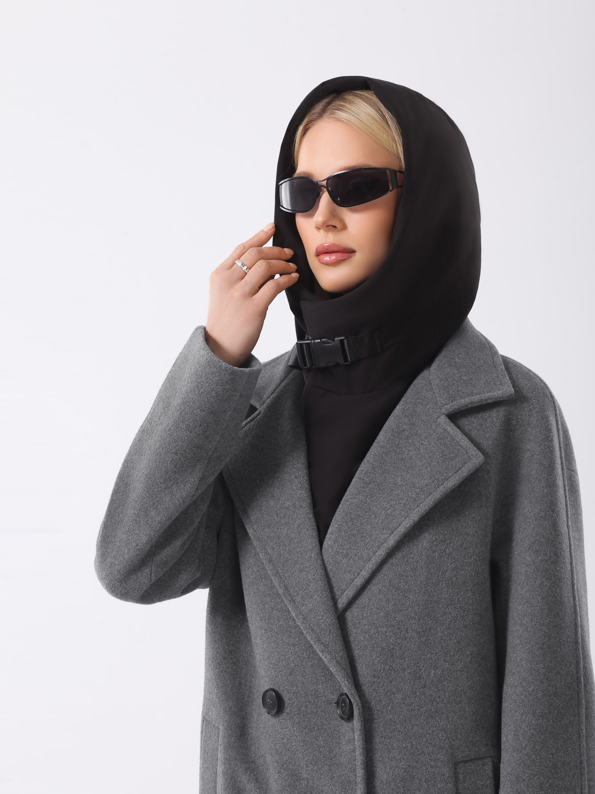 Шерстяное супермодное пальто в длине макси из высококачественного шерстяного драп-велюра. Модель свободного силуэта на стеганом с утеплителем подкладе. Актуальный лаконичный крой. Плавная линия плеча, комфортные комбинированные рукава с возможностью отворотов. Воротник – невысокая стойка – раскладывается в английский. Съёмная манишка с капюшоном из плотной плащевой ткани на синтепоне. Манишка фиксируется на пуговицы, застёгивается с помощью пряжки – фастекс на тесьме и магниты. Удобные карманы - листочки, застежка на фирменные пуговицы. Шлица в среднем шве спинки.