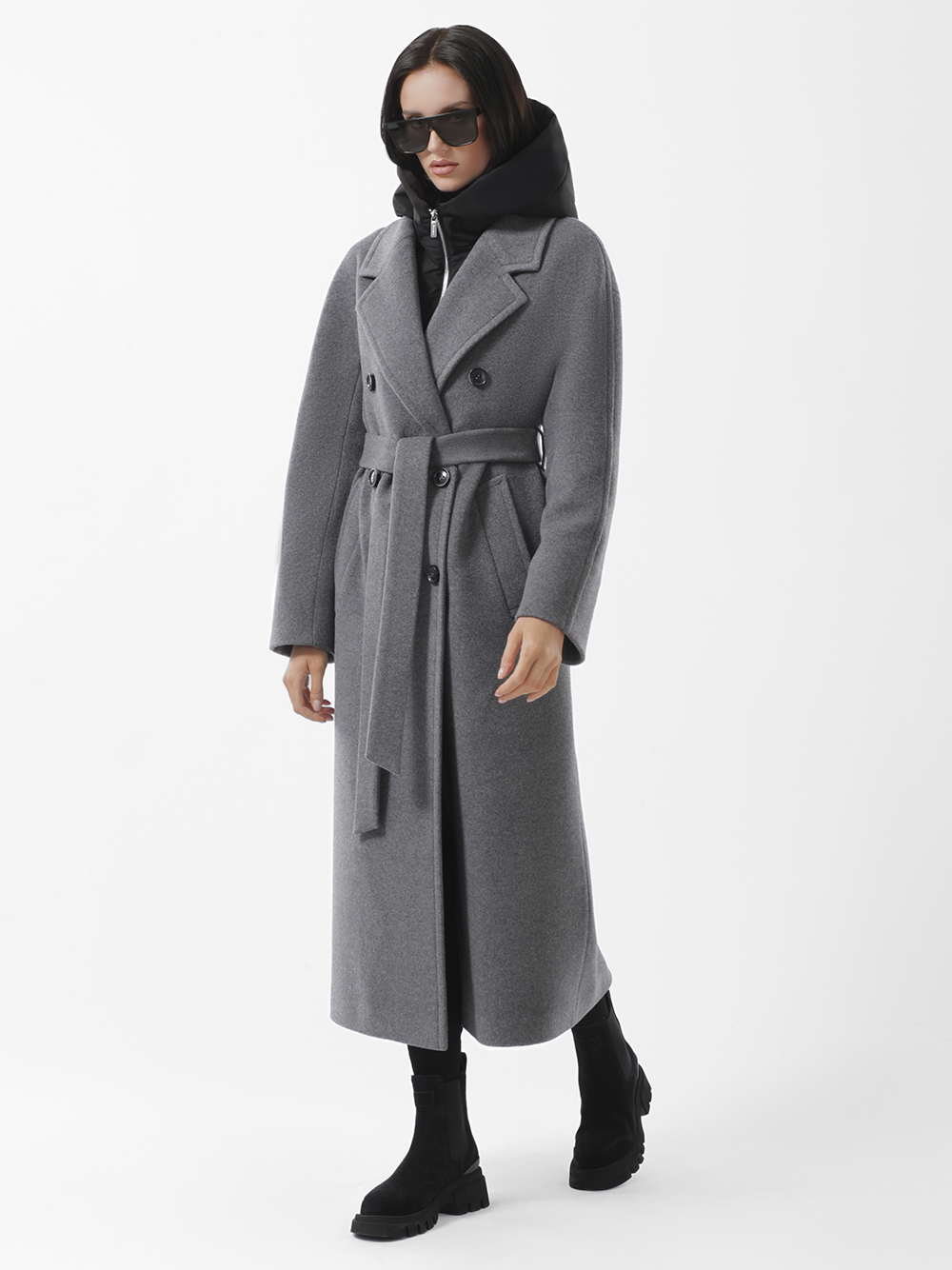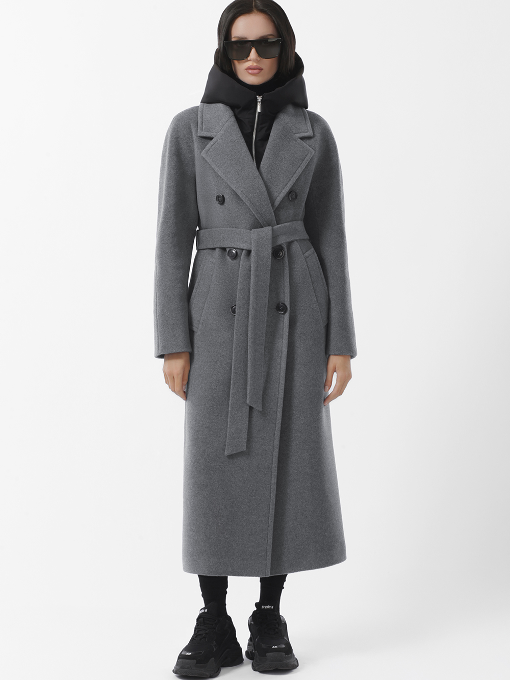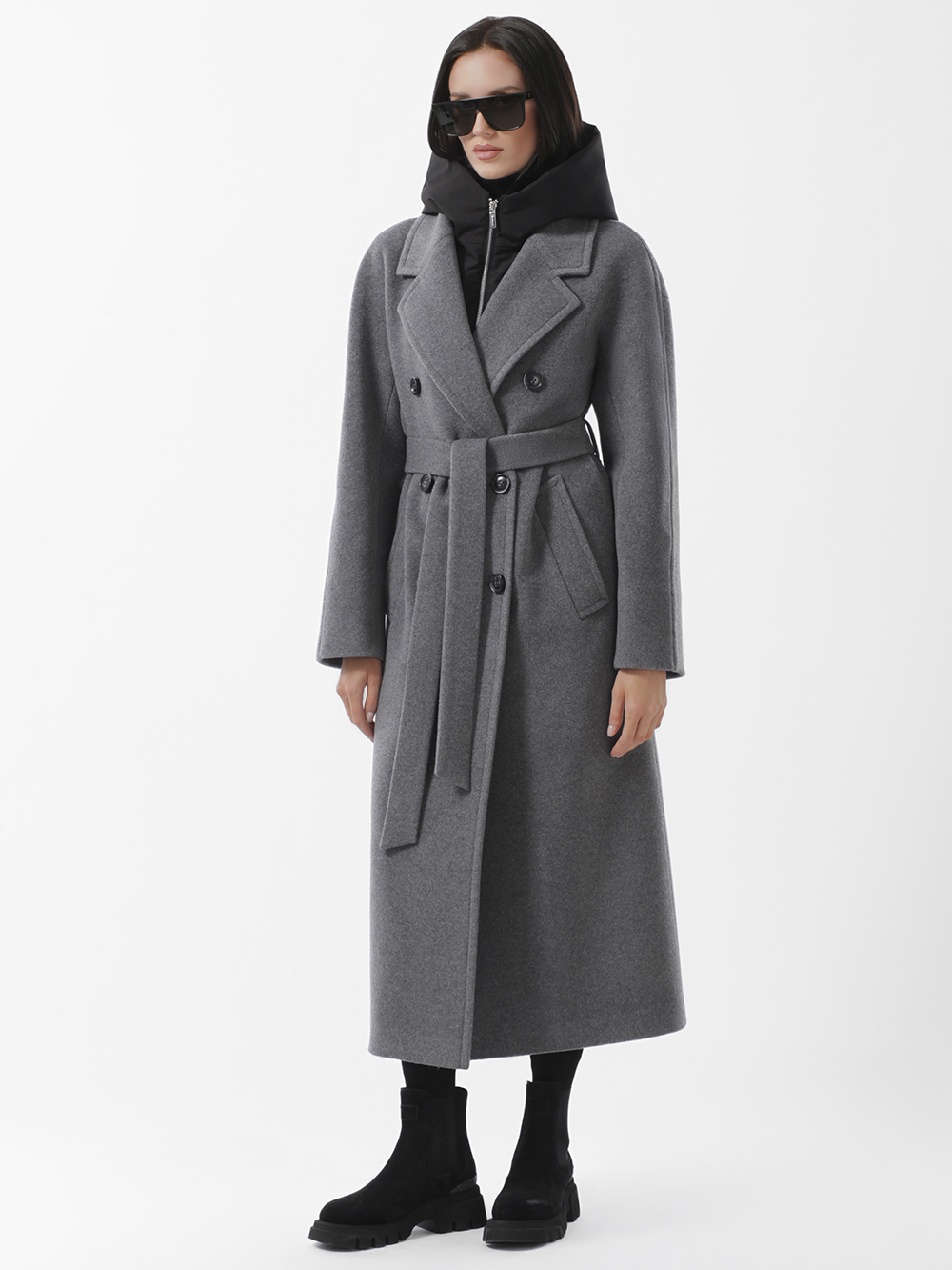 Шерстяное демисезонное пальто оверсайз из высококачественного шерстяного драп-велюра. Плавная линия плеча, комфортные комбинированные рукава с возможностью отворотов. Английский воротник с длинными лацканами. Съёмная манишка из плащевой ткани утеплена синтепоном. Манишка фиксируется на пуговицы, застегивается на молнию. Удобные карманы - листочки, застежка на фирменные пуговицы. Шлица в среднем шве спинки. Пояс в комплекте.
