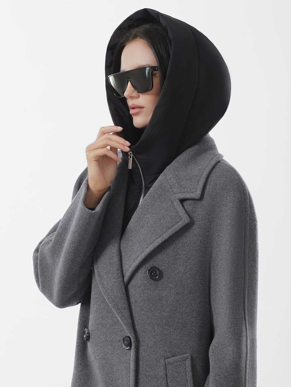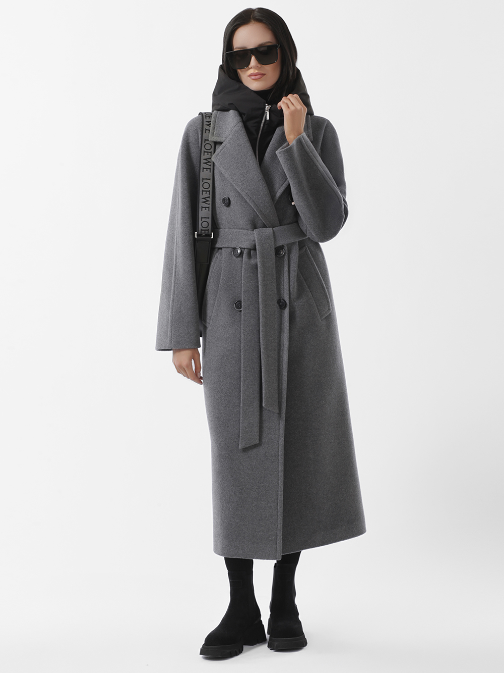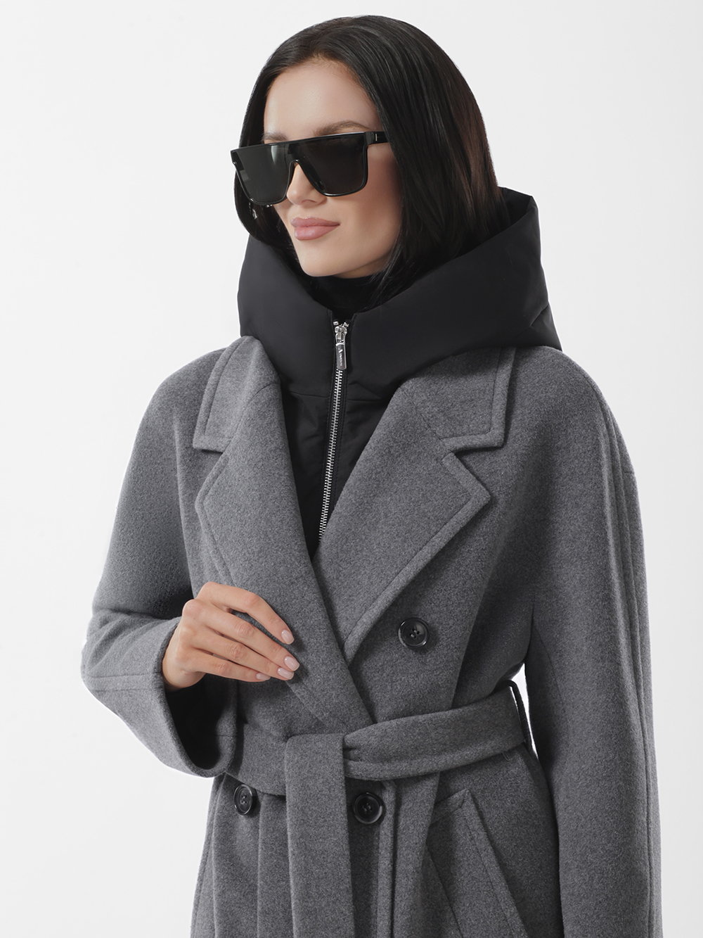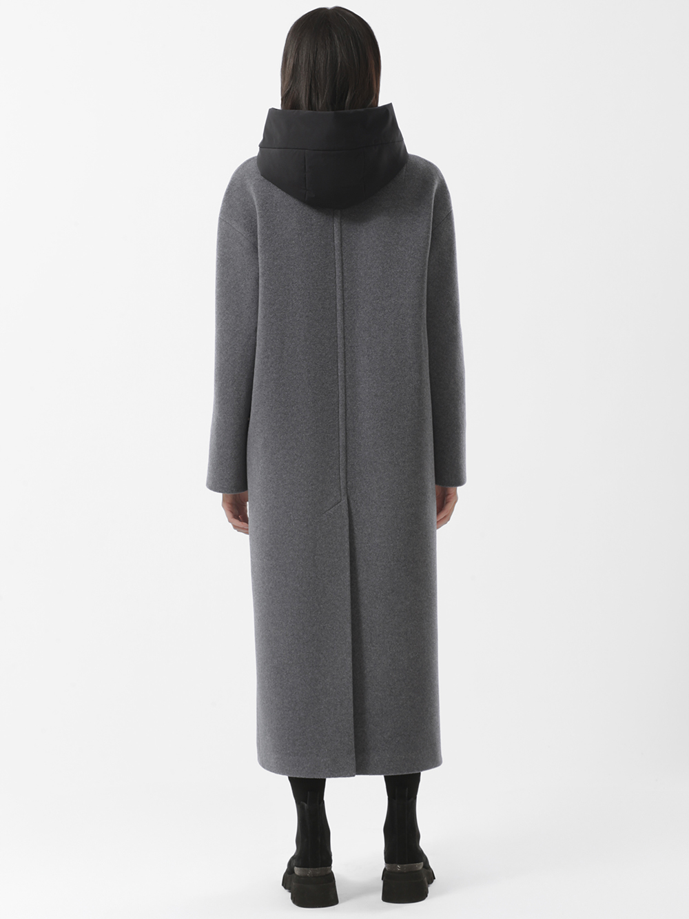 Шерстяное демисезонное пальто оверсайз из высококачественного шерстяного драп-велюра. Плавная линия плеча, комфортные комбинированные рукава с возможностью отворотов. Английский воротник с длинными лацканами. Съёмная манишка из плащевой ткани утеплена синтепоном. Манишка фиксируется на пуговицы, застегивается на молнию. Удобные карманы - листочки, застежка на фирменные пуговицы. Шлица в среднем шве спинки. Пояс в комплекте.