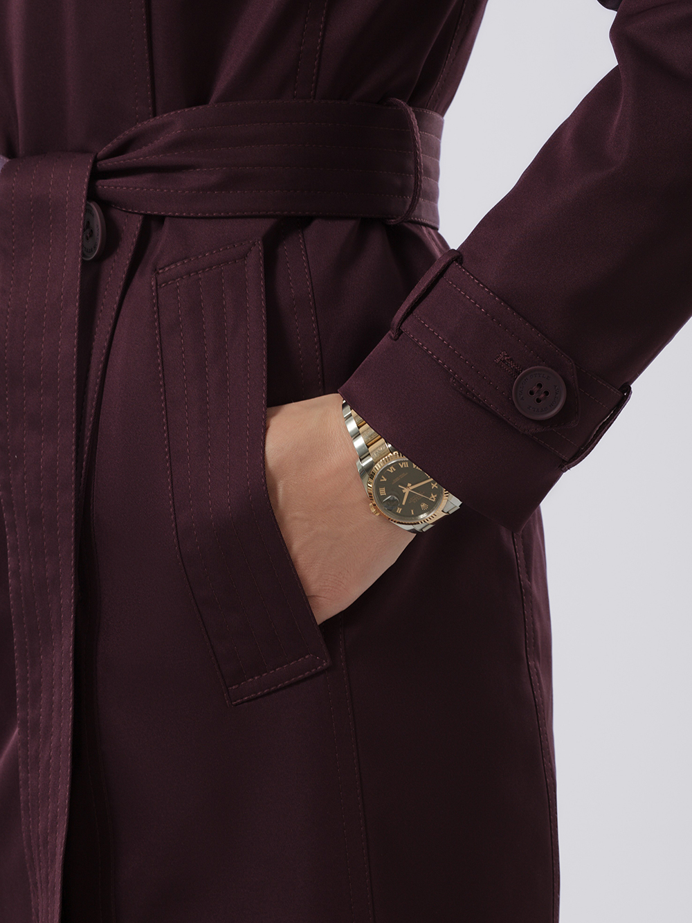 Модель классического полуприталенного кроя с втачными рукавами, декорированными патами на пуговицах. Отложной воротник на невысокой стойке раскладывается в английский или можно зафиксировать съёмным хлястиком. Удобные карманы-листочки, застёжка на фирменные пуговицы. Шлица в среднем шве спинки фиксируется кнопками. Пояс с пряжкой в комплекте.