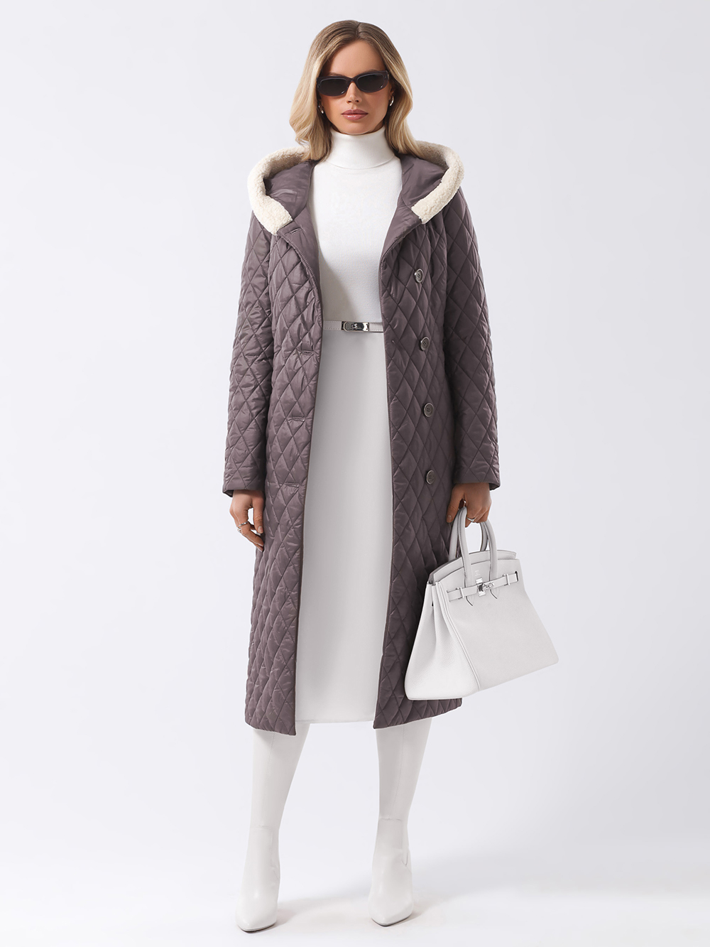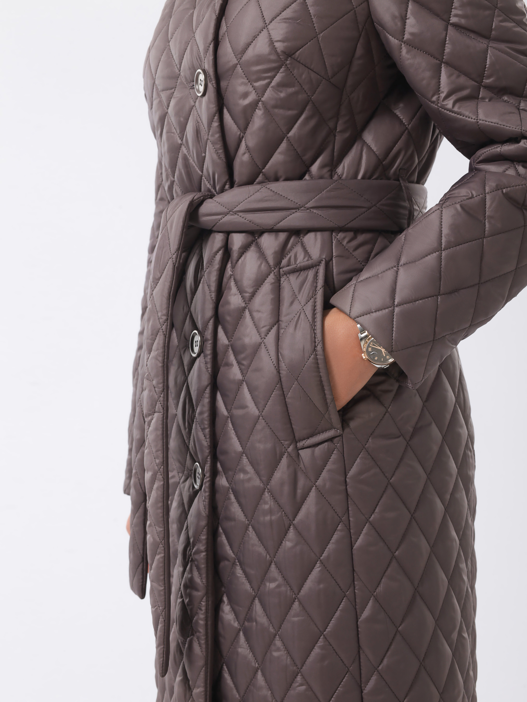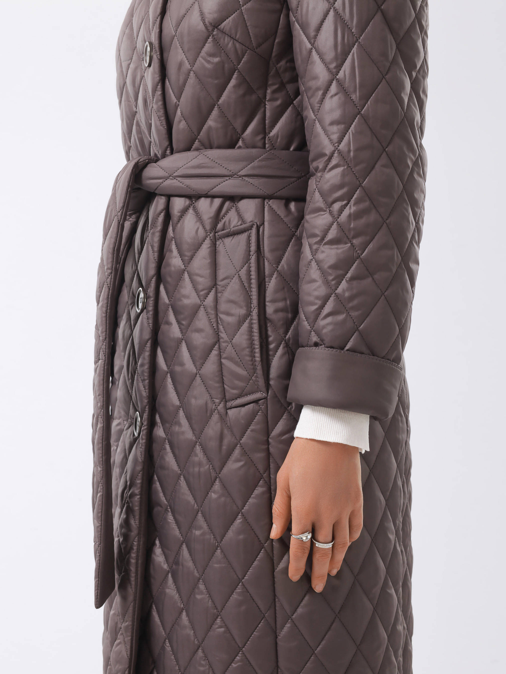 Стеганое теплое пальто из лёгкой плащевой ткани, стеганой с синтепоном. Длина изделия 115 см. Полуприлегающий изящный крой, классические втачные рукава с возможностью отворотов.