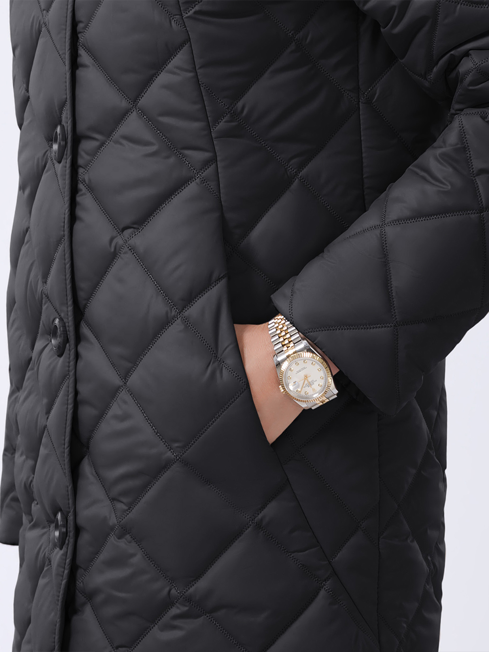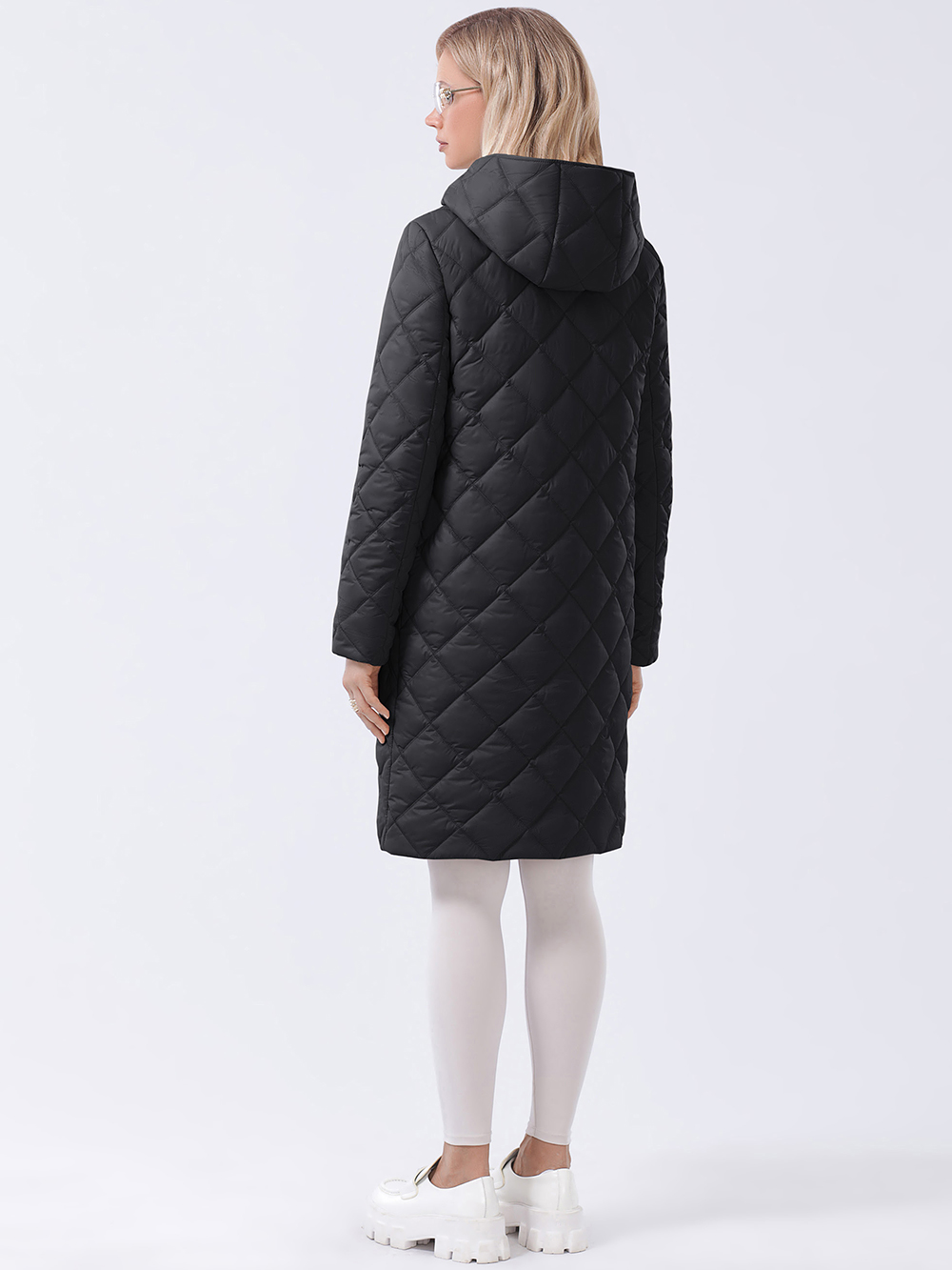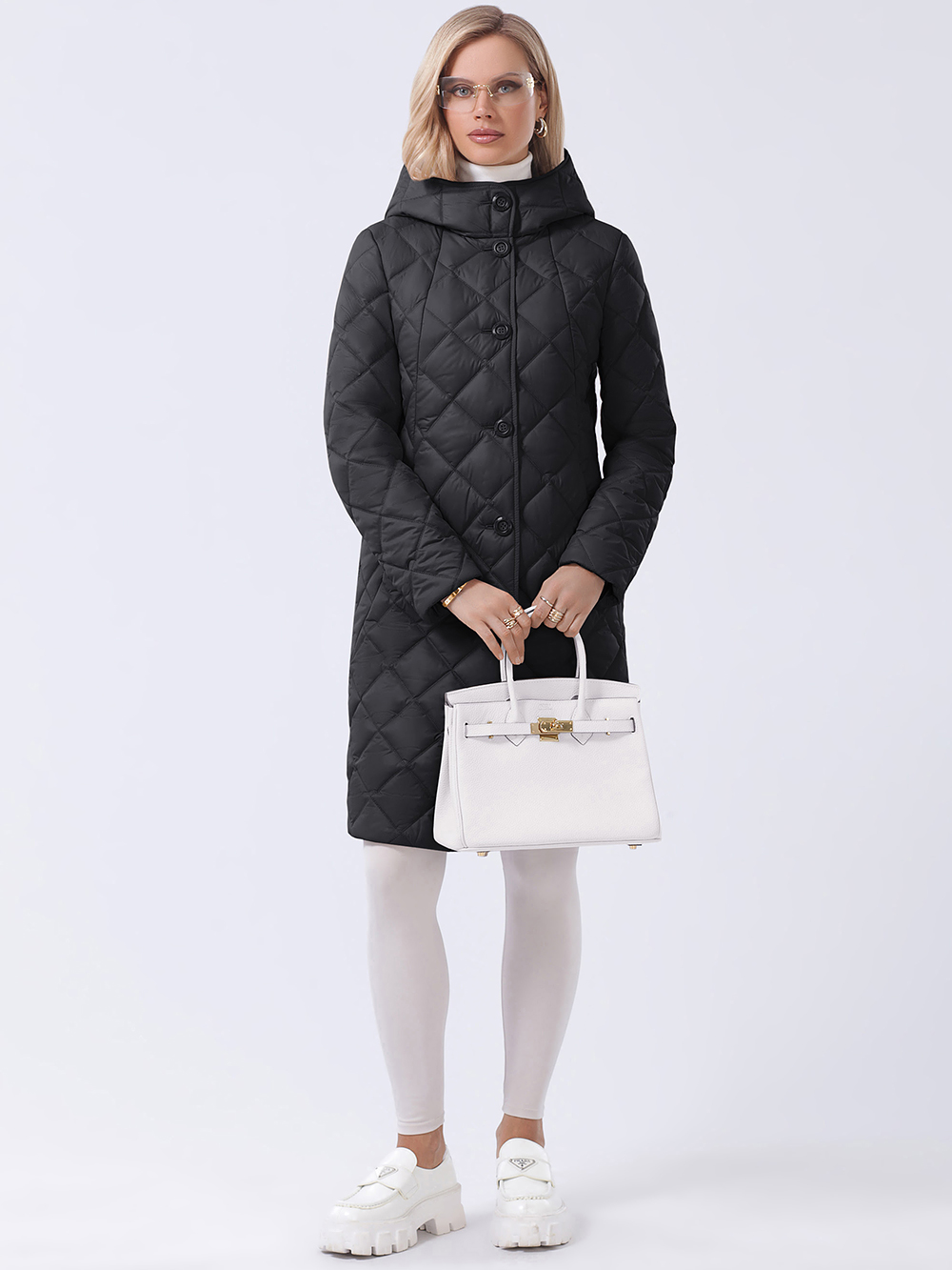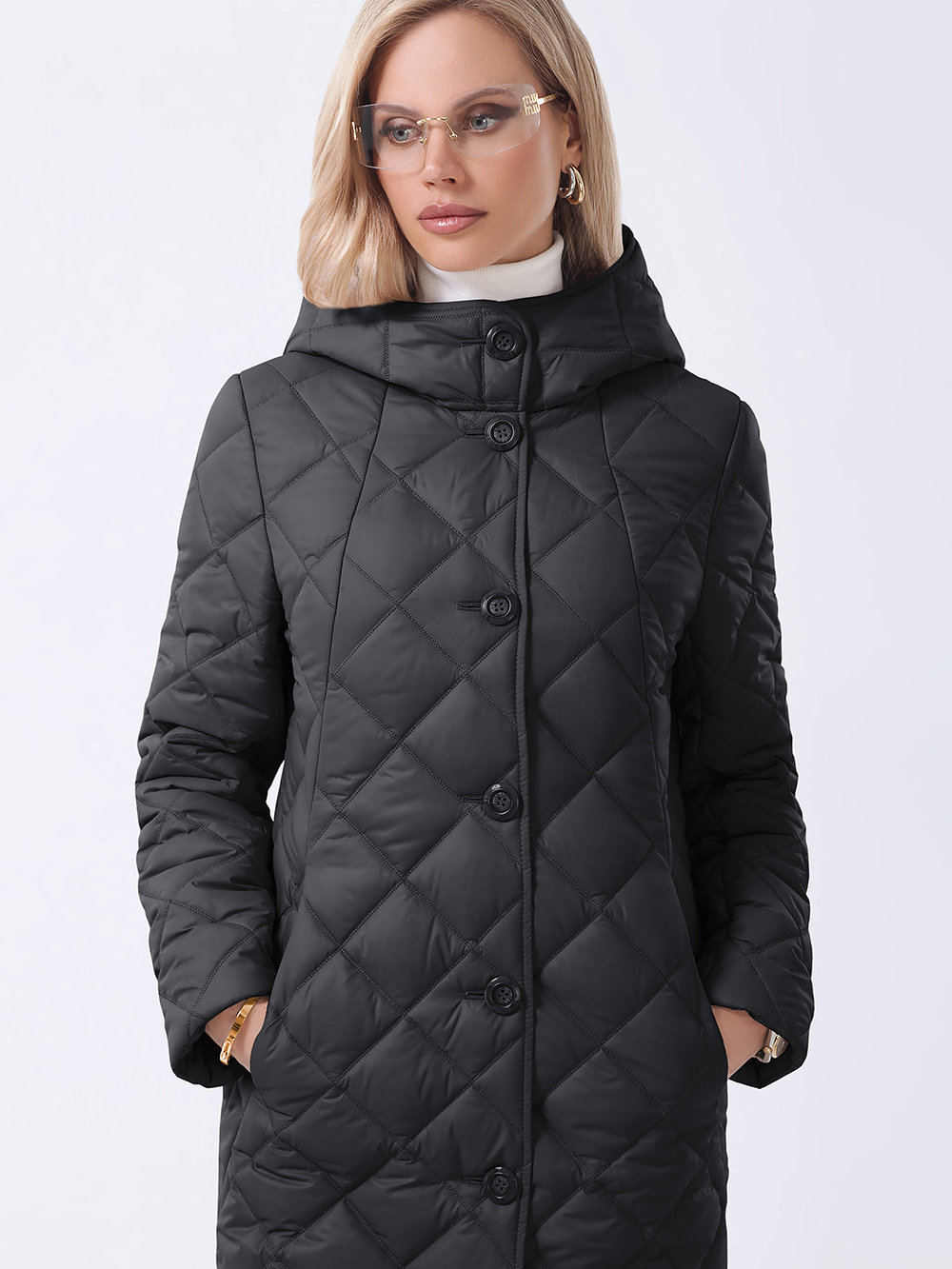 Элегантное пальто комфортного прямого силуэта. Лаконичный спокойный крой, втачной покрой рукава с возможностью отворота. Уютный небольшой капюшон. Удобная застежка на фирменные пуговицы. Карманы в рельефах полочки на потайных кнопках. Пальто выполнено из плащевой ткани стеганой с мягким теплым утеплителем, с дополнительным слоем прокладочного материала - благодаря этому слою ткань более плотная и одновременно мягкая, лучше сохраняет тепло. Пальто хорошо держит форму, четко прослеживаются силуэт и модельные линии.