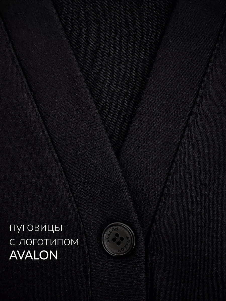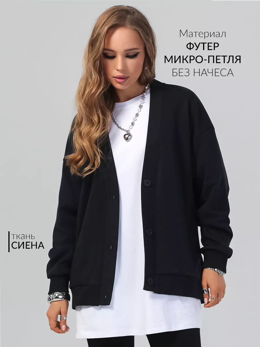 Кардиган женский черный БЕЗ НАЧЕСА – выполнен из премиального трикотажа «СИЕНА». Модель свободного кроя, в стиле оверсайз , подойдет на любую фигуру. Покрой рукава рубашечный, с углублённой проймой и спущенной линией плеча. Низ рукава оформлен эластичной манжетой. Застежка по центру на фирменные пуговицы, модный V-образный вырез. В боковых швах расположены удобные карманы. По низу кардигана эластичный пояс.