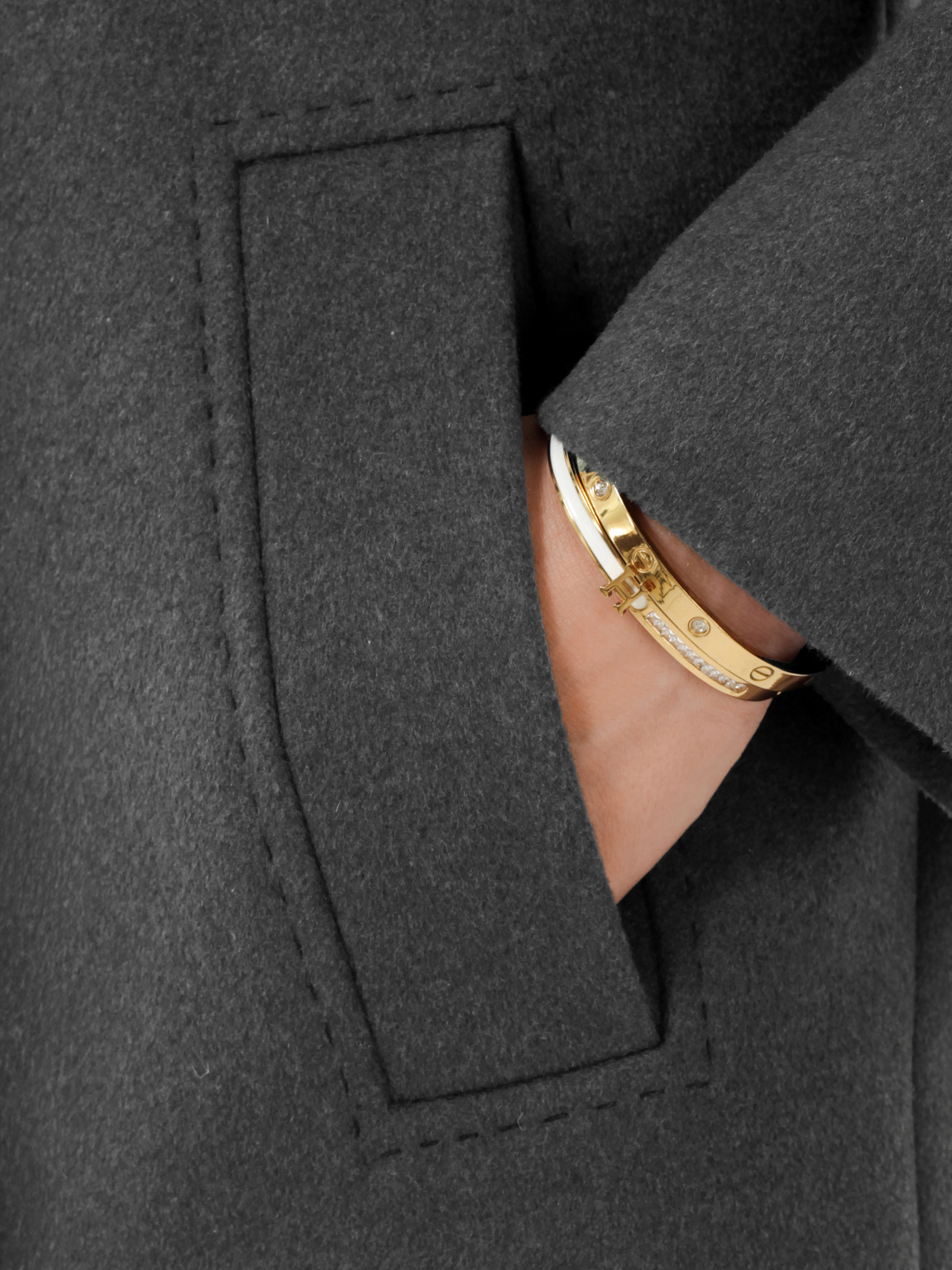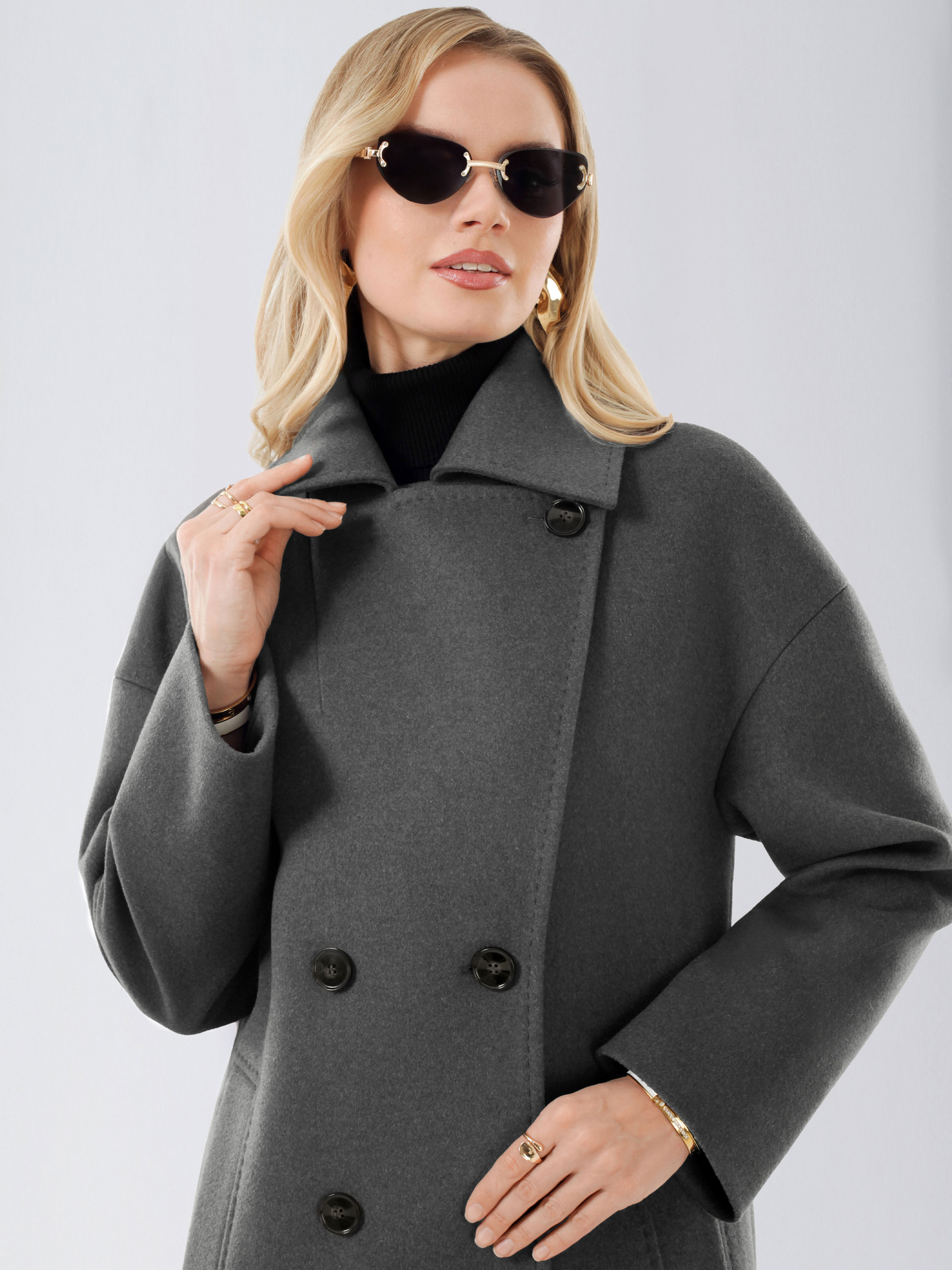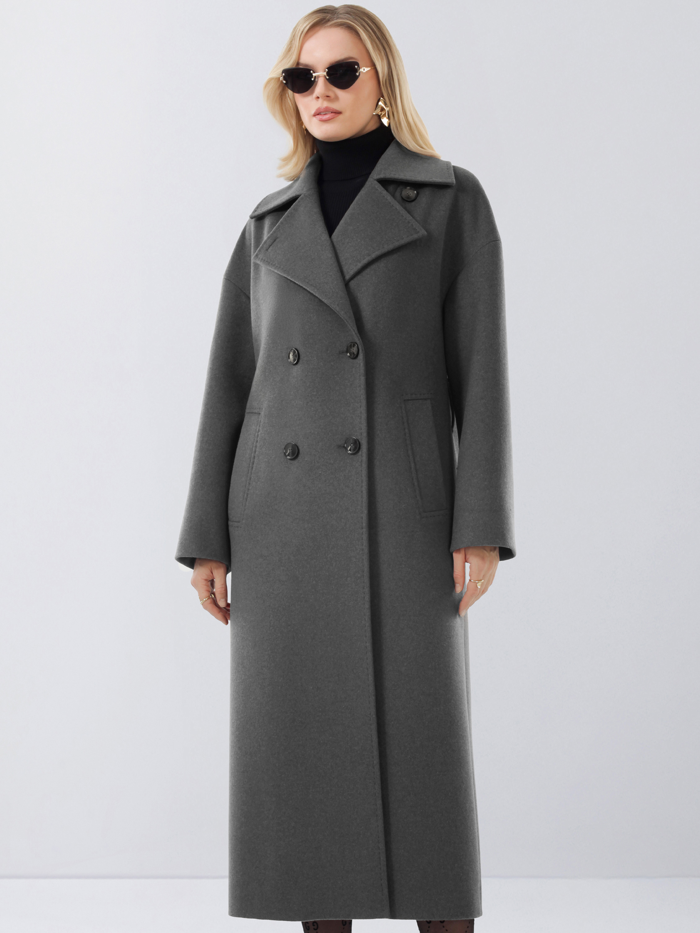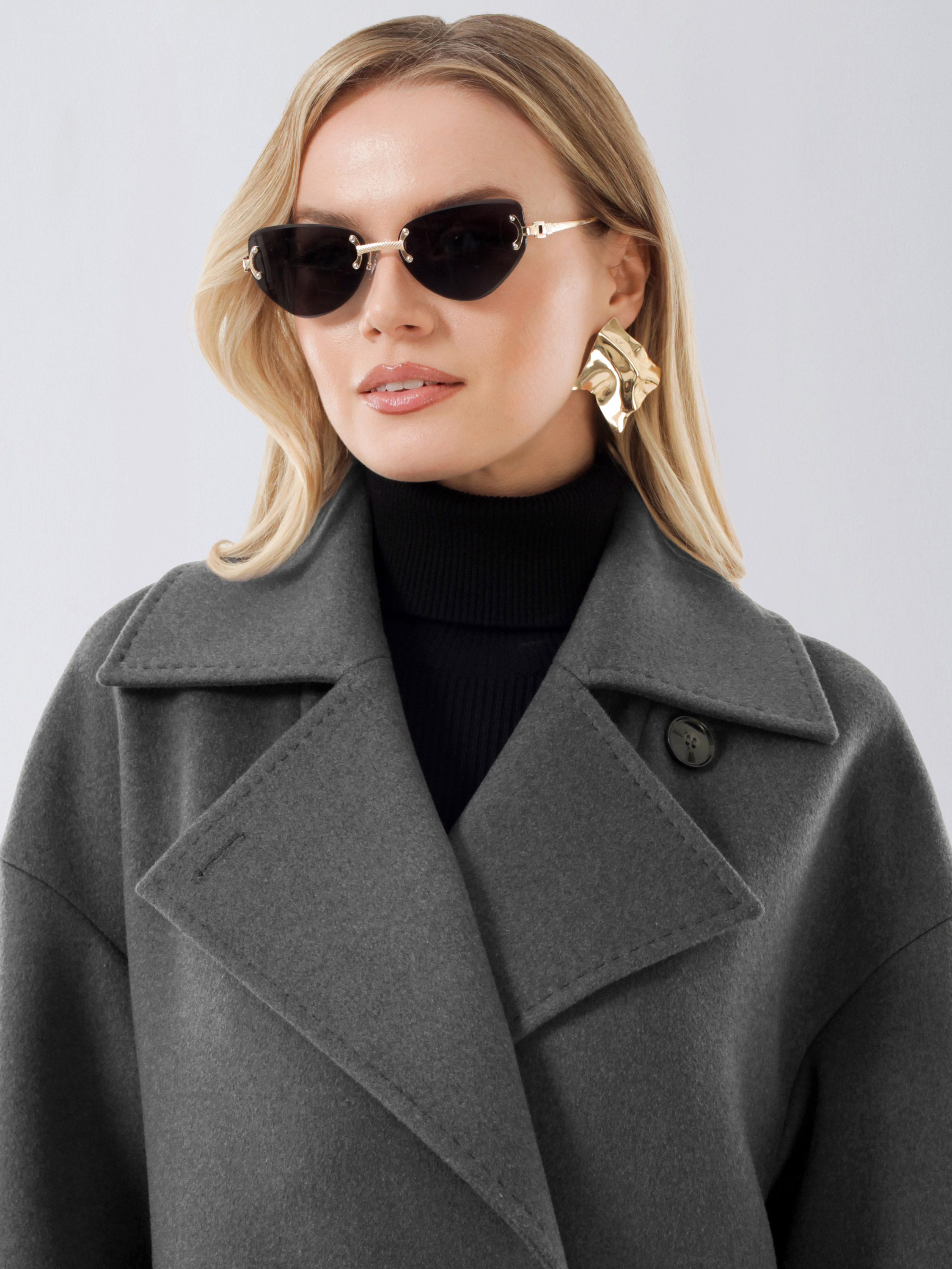 Роскошное женское пальто свободного лаконичного кроя. Модель выполнена из высококачественной шерстяной ткани с микроворсом. В состав ткани добавлен кашемир, чтобы придать ей эксклюзивную мягкость, легкость и превосходное тепло, а также обеспечить пальто благородный и элегантный внешний вид. Плавная линия плеча, комфортные уютные рукава рубашечного покроя с возможностью отворота. Удобные прорезные карманы с листочками. Застежка на фирменные пуговицы. Отложной воротник раскладывается в английский, лацкан фиксируется пуговицей. Шлица в среднем шве спинки. Пояс из ткани верха в комплекте.