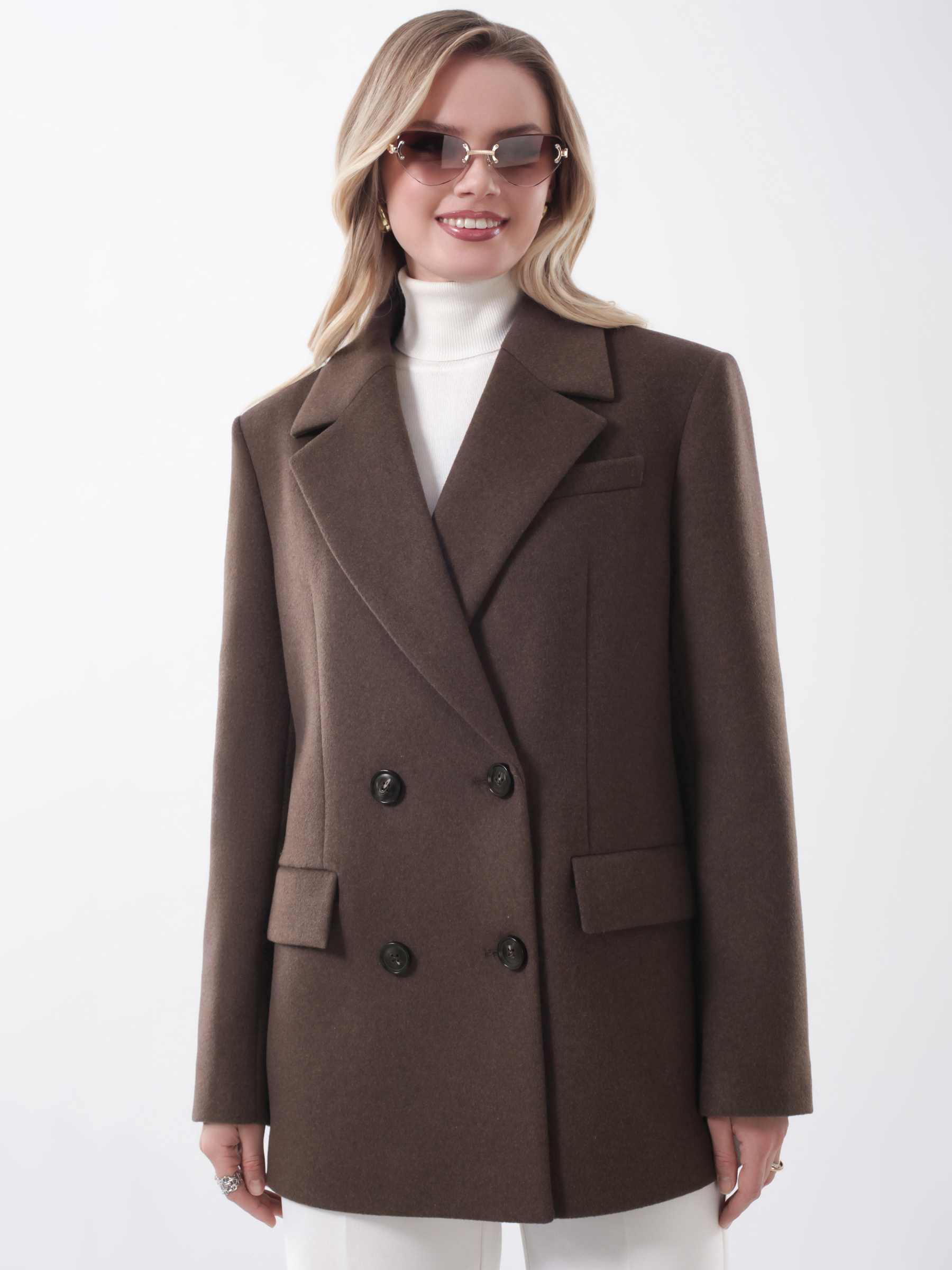 Трендовое пальто пиджак женское оверсайз с расширенной линией плечевого пояса. Модель выразительного прямого силуэта из высококачественной шерстяной ткани с микроворсом. В состав ткани добавлен кашемир, чтобы придать ей эксклюзивную мягкость, легкость и превосходное тепло, а также обеспечить пальто благородный и элегантный внешний вид. Актуальный лаконичный крой, комфортные втачные рукава с отлетными шлицами в нижней части. Английский воротник. Декоративный нагрудный карман. Удобные прорезные карманы с клапанами, застежка на фирменные пуговицы.